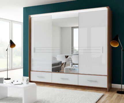 Szafa AMSTERDAM 250L – przesuwny front z dużym lustrem, szuflady zewnętrzne, LED