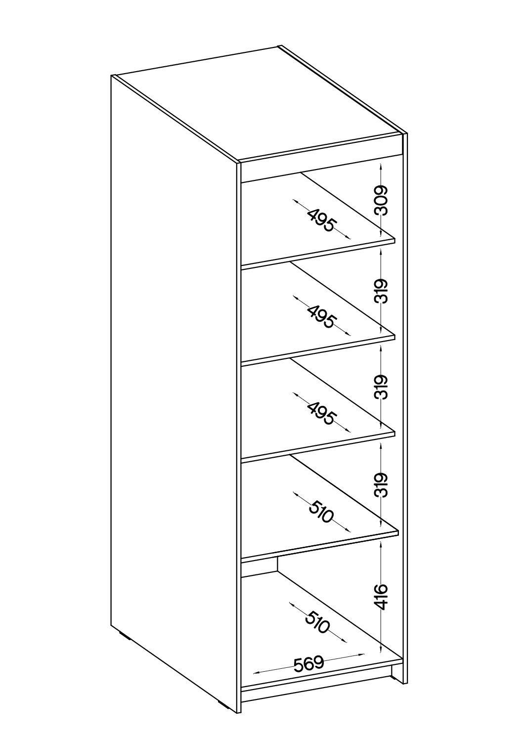 • Wąska, a pojemna – korpus z kolumną półek (kilka poziomów, część z możliwością regulacji wysokości) pozwala logicznie ułożyć rzeczy i łatwo je odnaleźć.