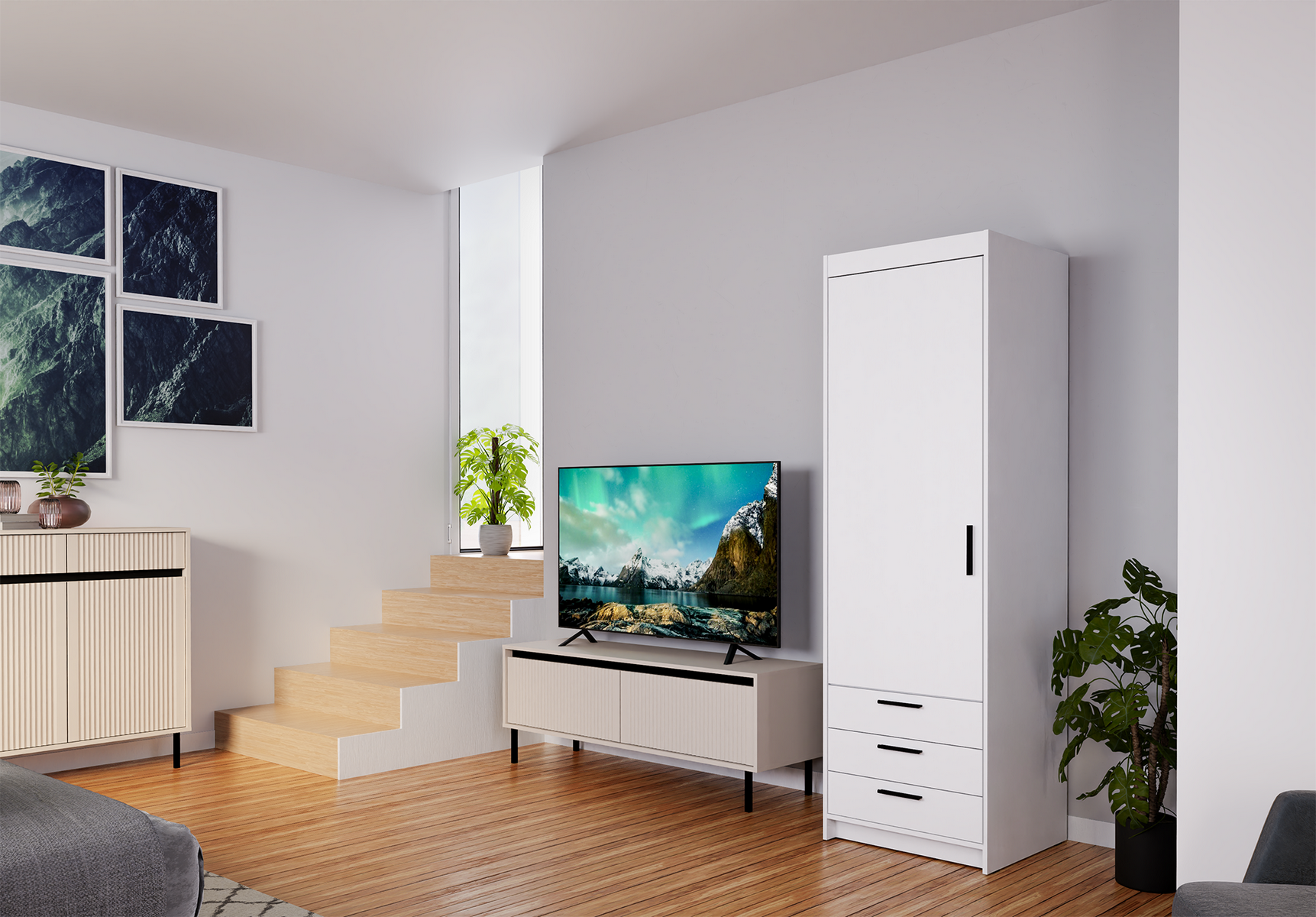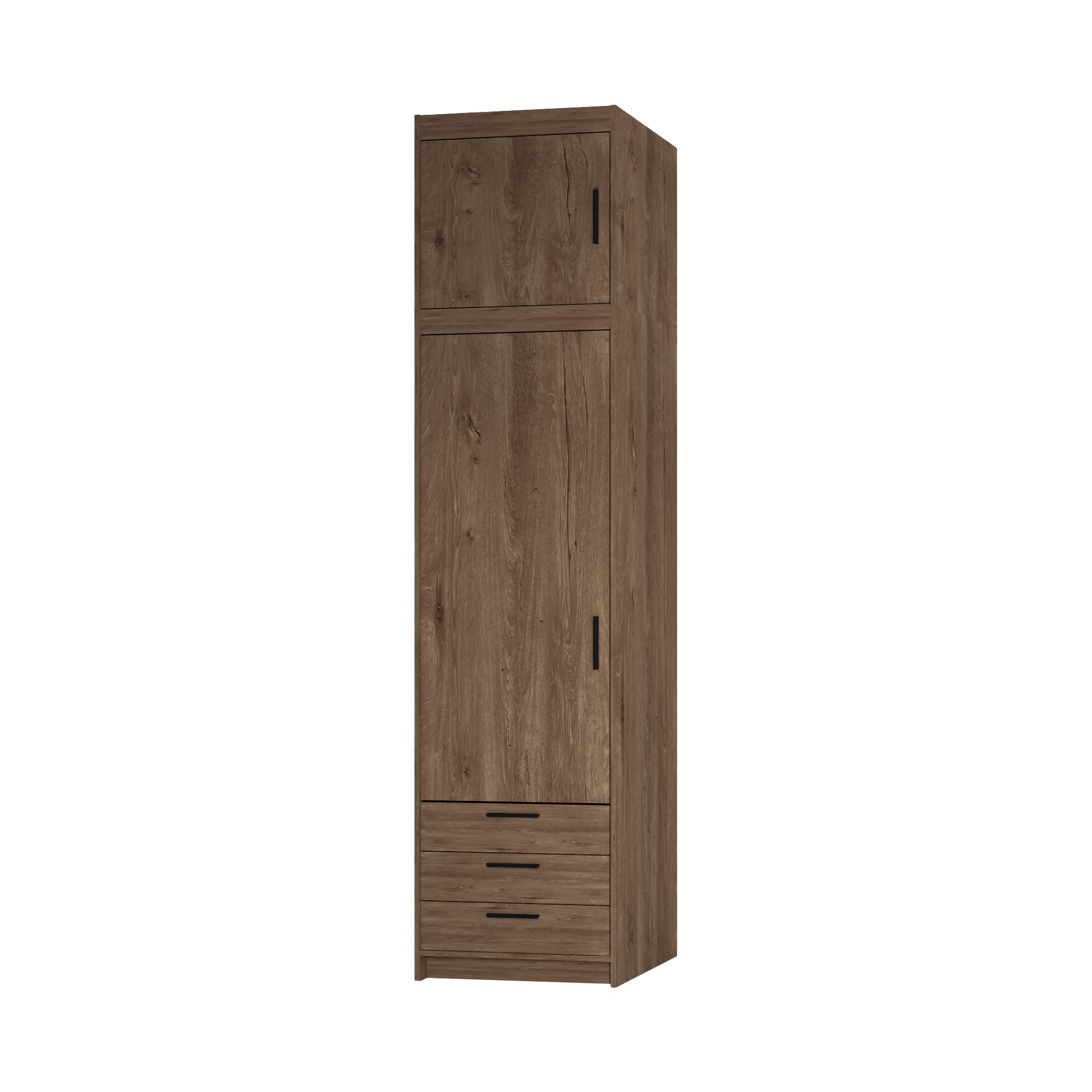 Szukasz wąskiej szafy ok. 60 cm, która zmieści się w małej sypialni, garderobie, przedpokoju albo pokoju młodzieżowym? ELENA 1D 3S to smukła szafa jednodrzwiowa z trzema szufladami, idealna do przechowywania rzeczy, które lubią porządek – od bielizny i T-shirtów po akcesoria czy dokumenty.