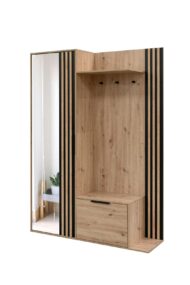 Garderoba AMBER to nowoczesny i praktyczny mebel, który doskonale sprawdzi się w przedpokoju, korytarzu lub garderobie. Eleganckie połączenie naturalnego dekoru dębu artisan z czarnymi, dekoracyjnymi lamelami tworzy wyjątkowy design, który przyciąga uwagę i nadaje wnętrzu nowoczesnego charakteru.