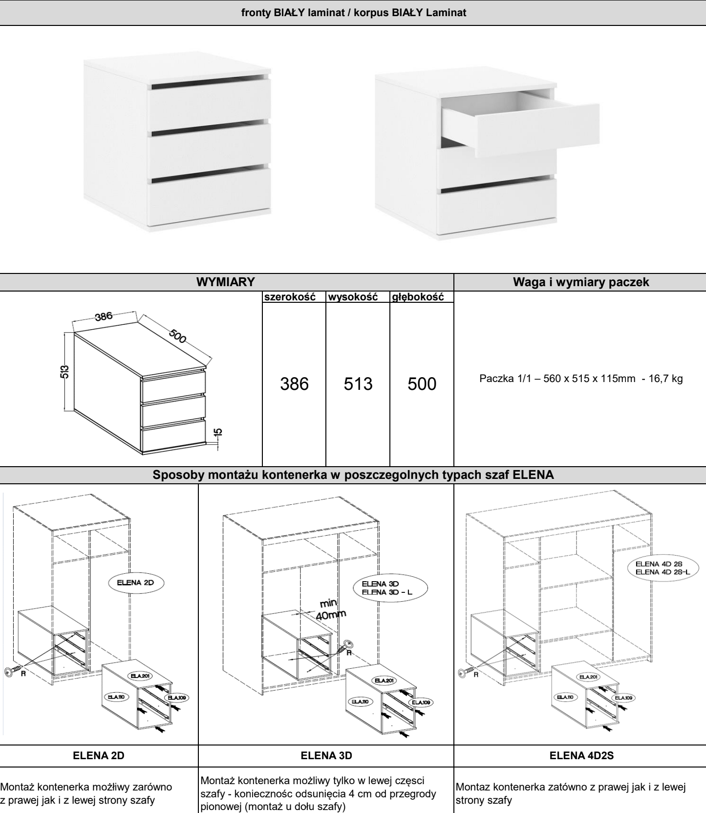 Kontenerek ELENA to najprostszy sposób, by zamienić zwykłą szafę w funkcjonalną garderobę z szufladami, bez zajmowania dodatkowej przestrzeni w pokoju. Wybierz – zamontuj – ciesz się porządkiem każdego dnia.