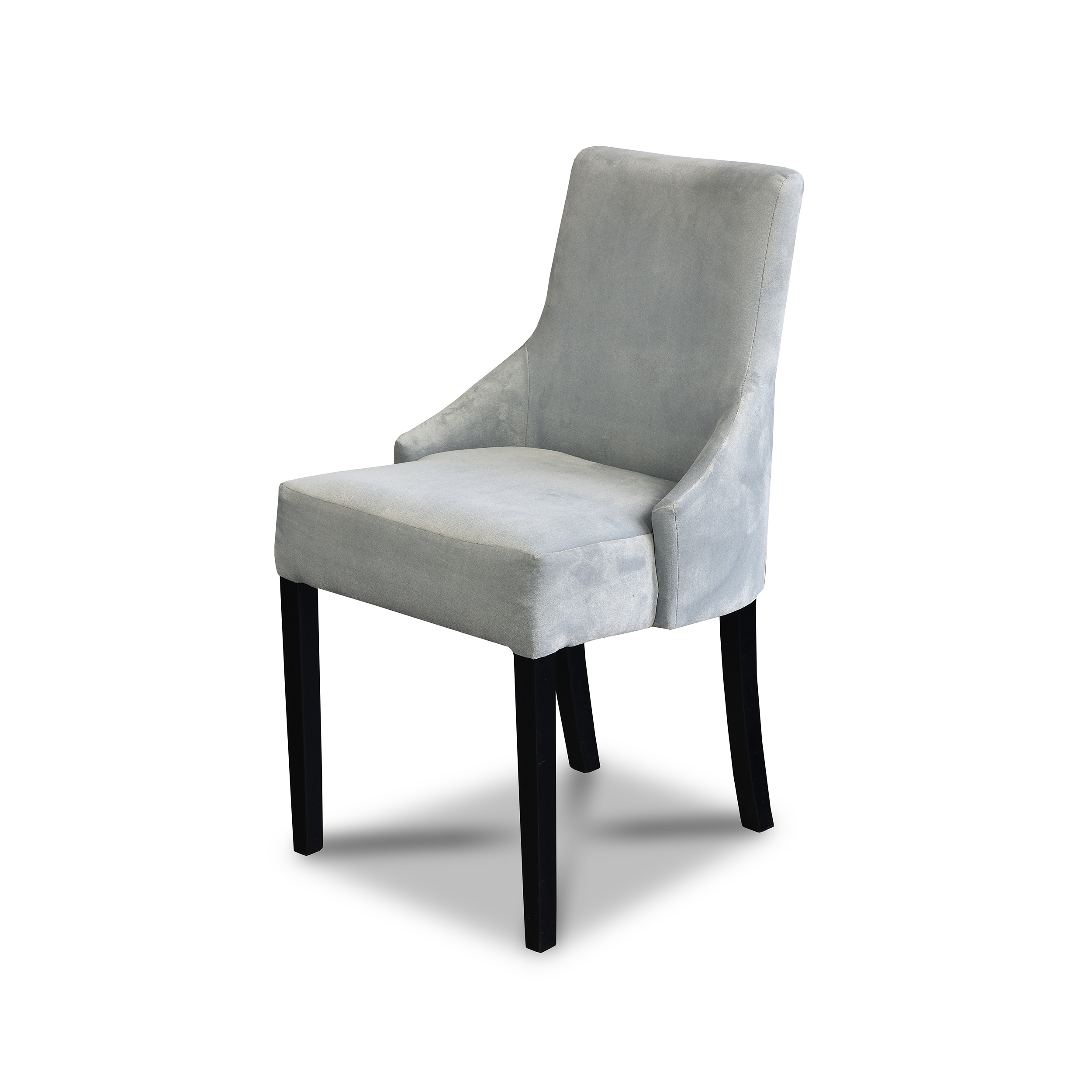 Czarne, smukłe drewniane nogi tworzą elegancki kontrast z jasną tapicerką, podkreślając nowoczesny i szykowny charakter modelu. Karen świetnie sprawdza się w eleganckich jadalniach, salonach oraz bardziej formalnych przestrzeniach.