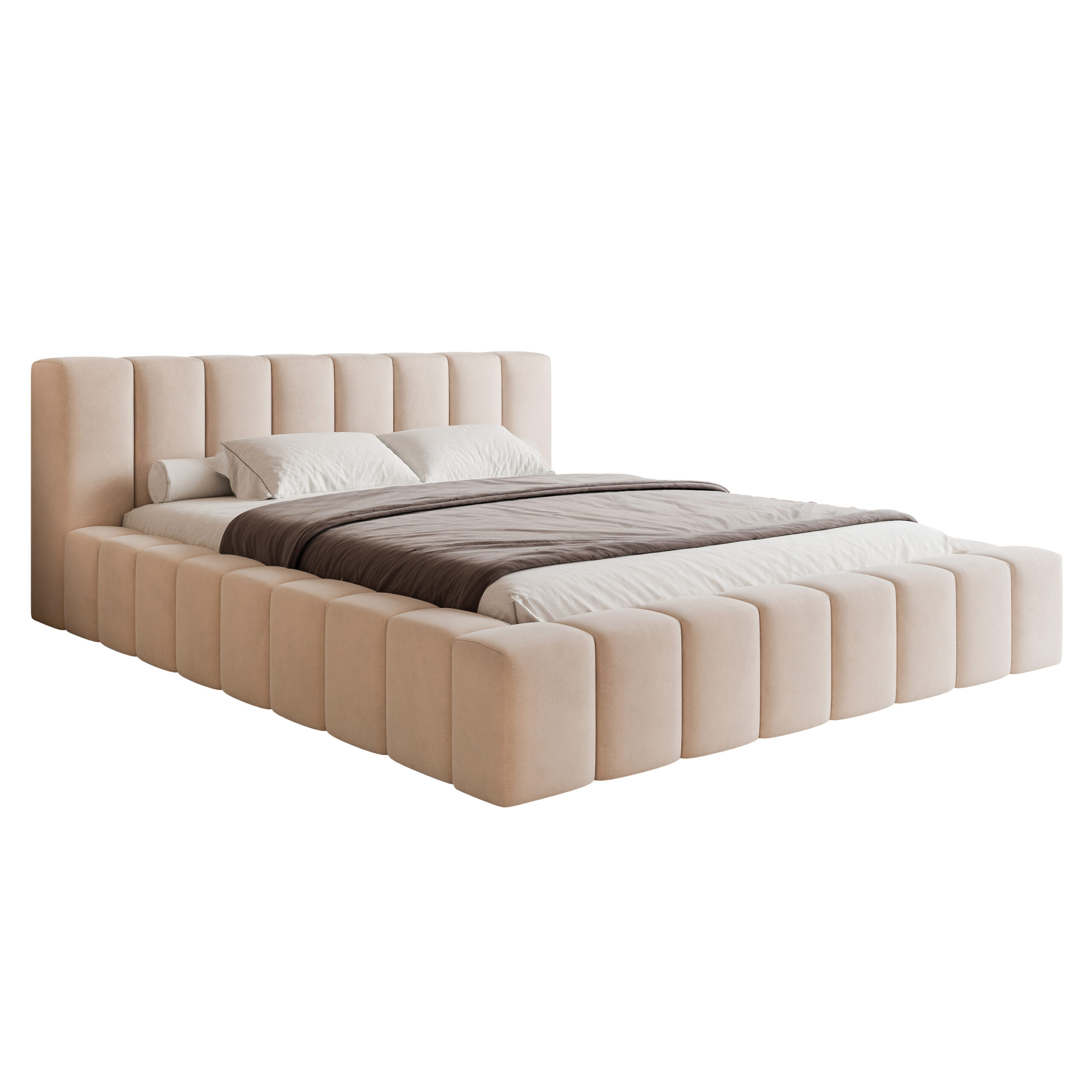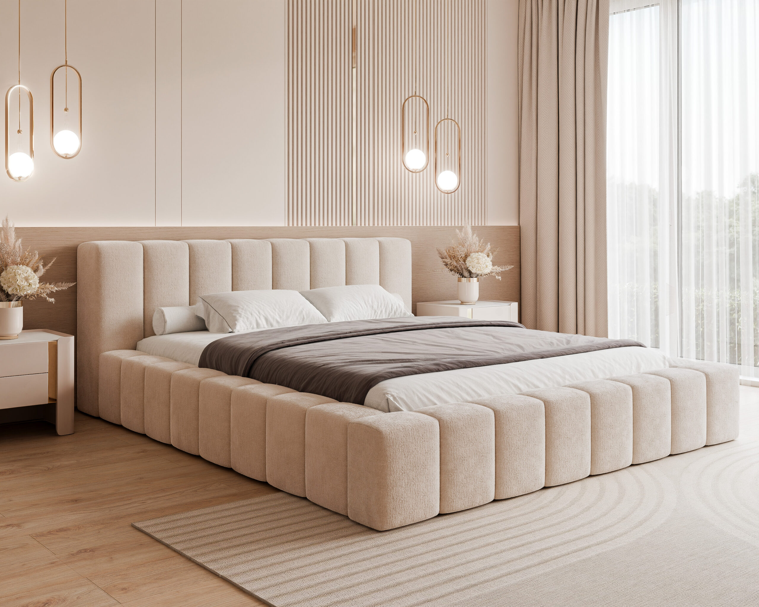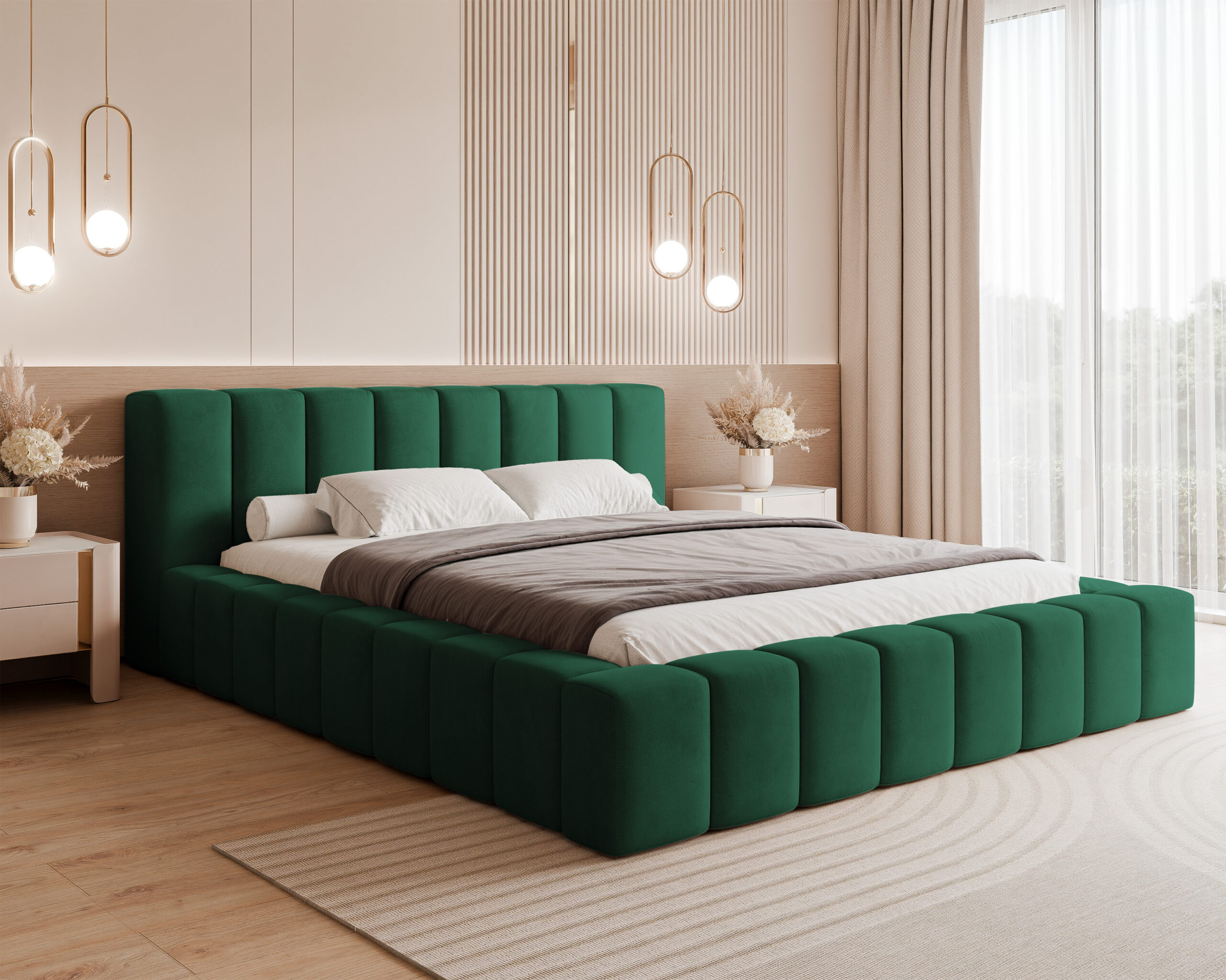 Łóżko dostępne jest w wielu rozmiarach oraz tkaninach obiciowych – od miękkich welurów po strukturalne plecionki. Każdy egzemplarz powstaje w Polsce, z dbałością o każdy detal.