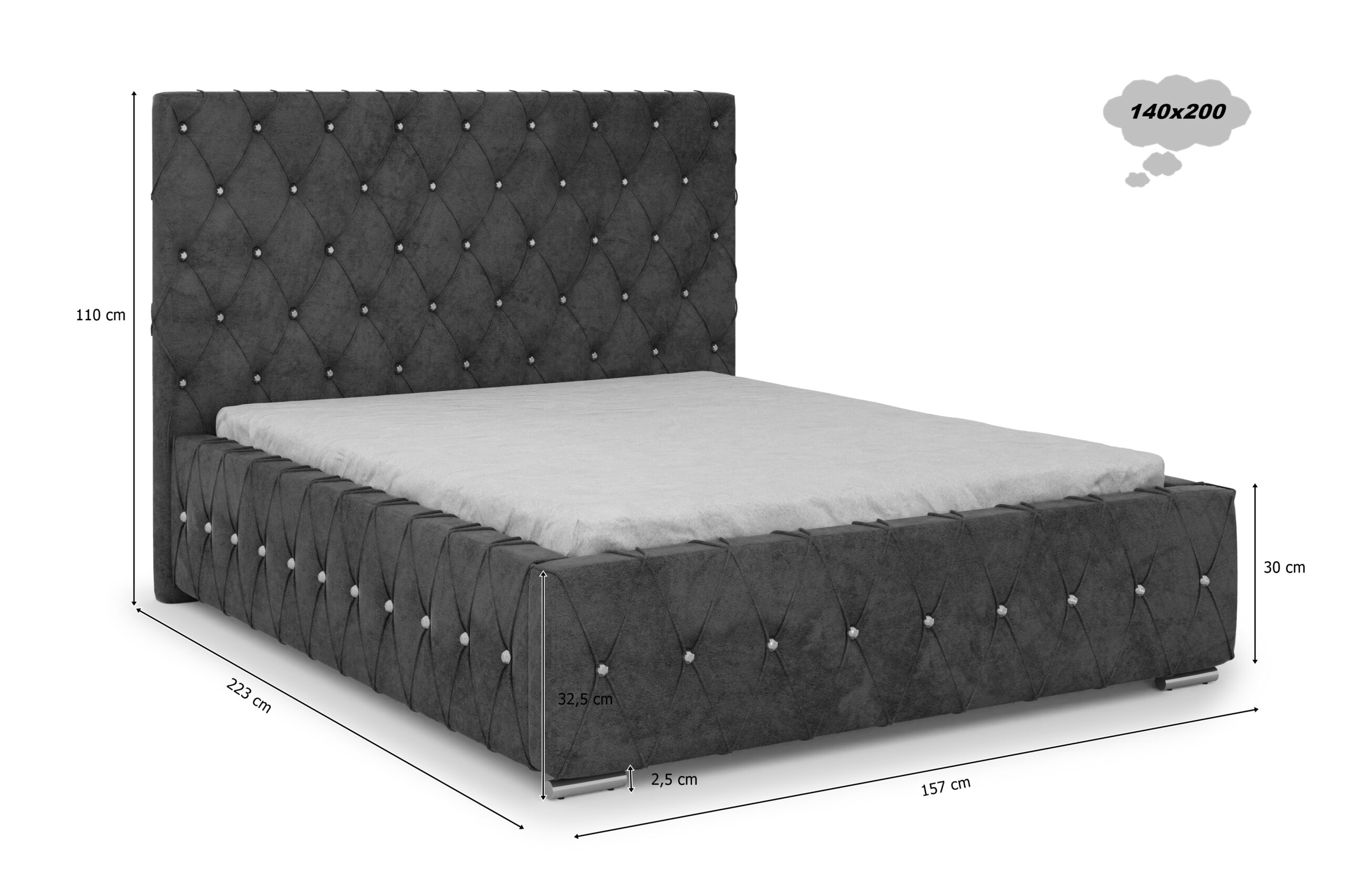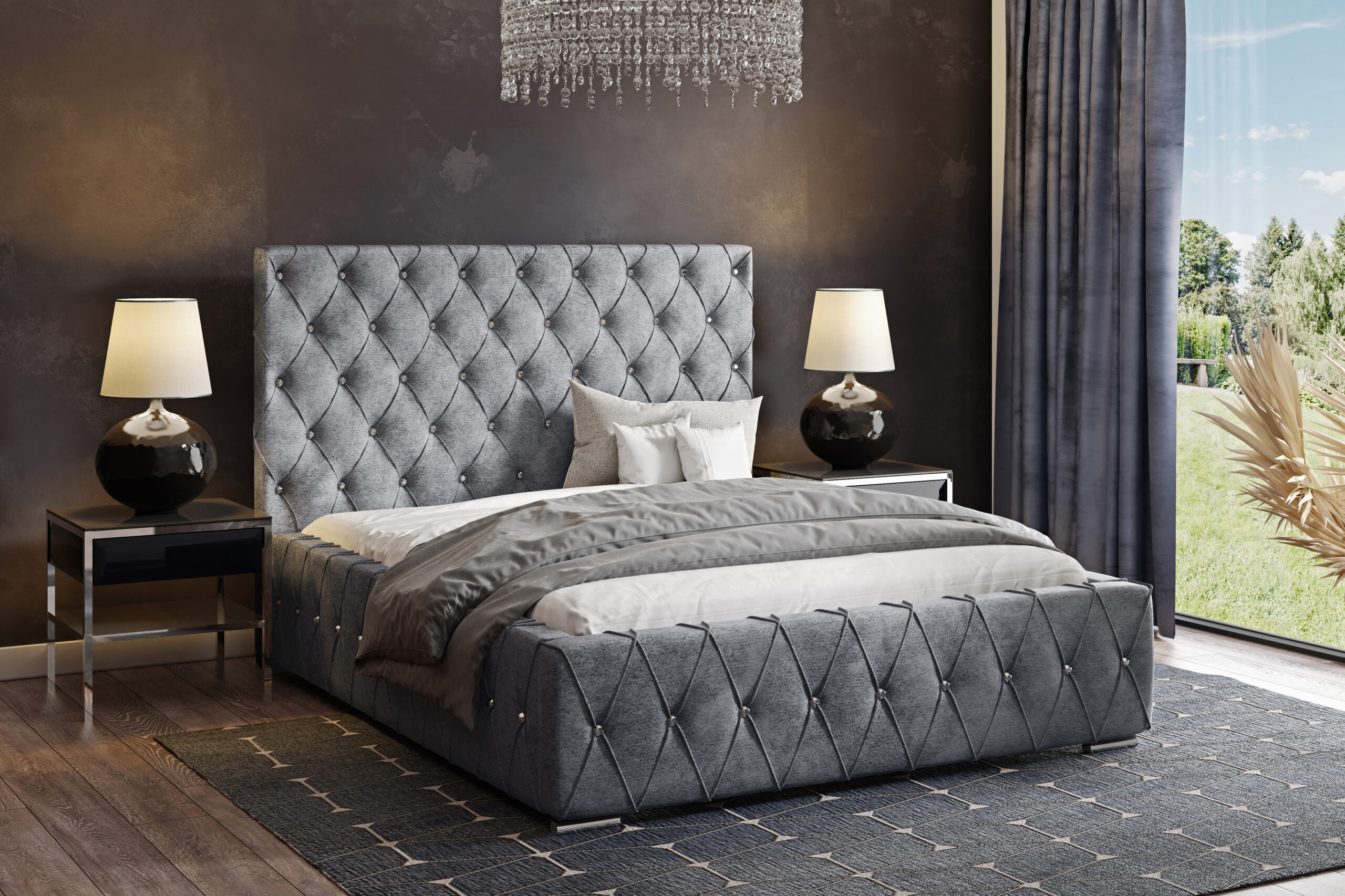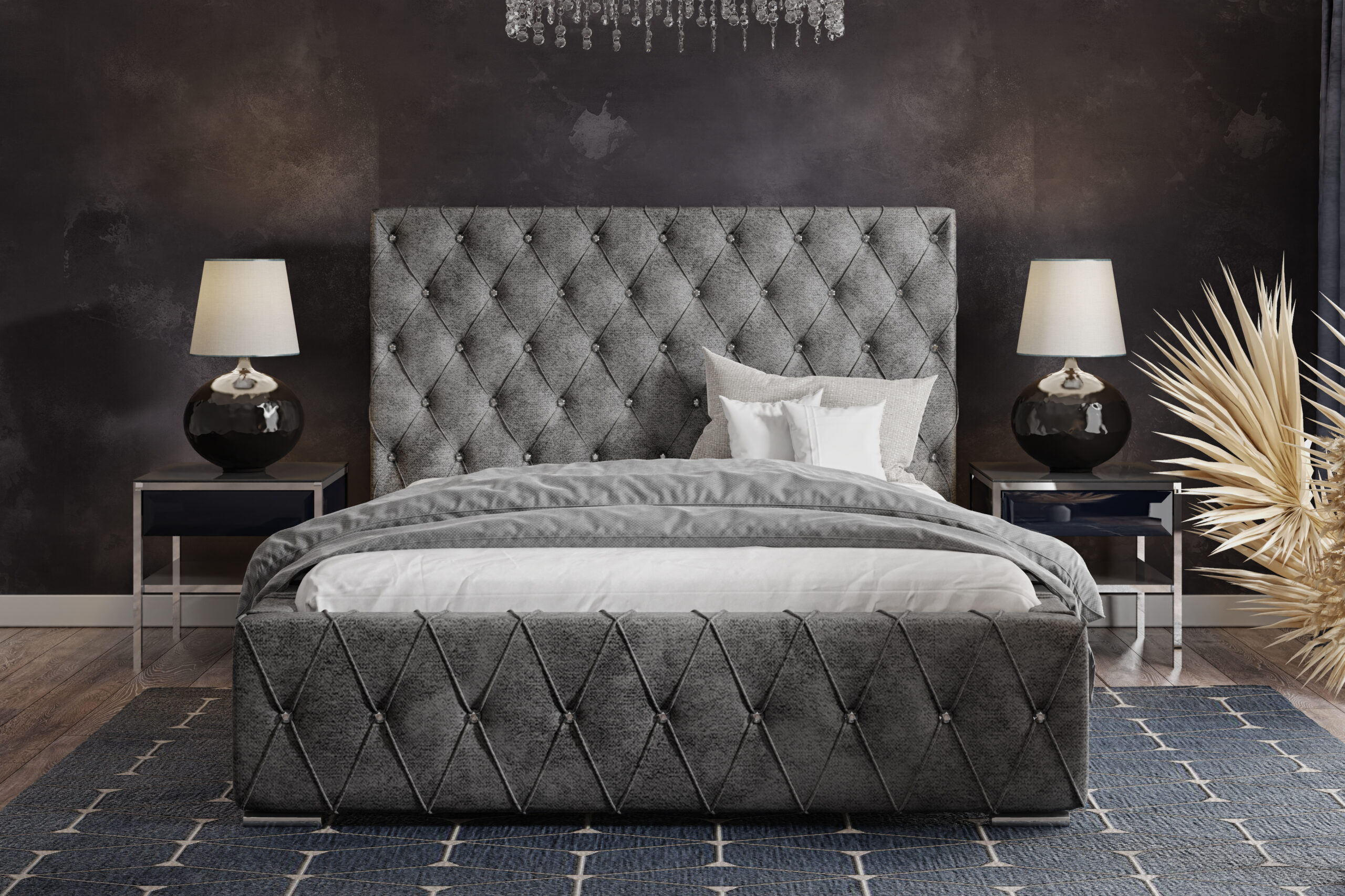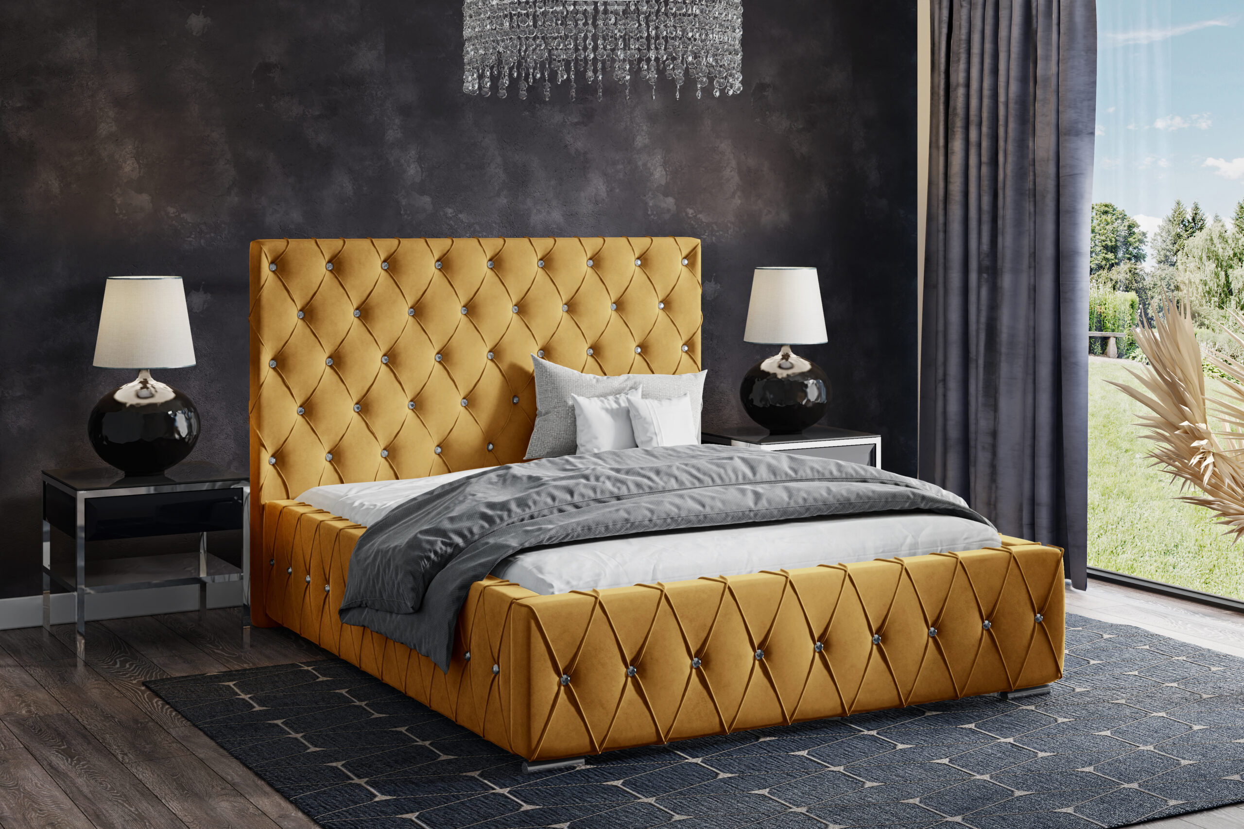 Łóżko tapicerowane Armonia z pojemnikiem na pościel to elegancka propozycja w stylu glamour, która łączy klasyczne pikowania z nowoczesnym wykonaniem. Wysokie wezgłowie, ozdobione ręcznie wykonywanymi przeszyciami i błyszczącymi kryształkami, nadaje wnętrzu wyjątkowego charakteru i przytulności. To idealny wybór dla osób, które pragną wprowadzić do swojej sypialni nutę luksusu i romantyzmu.