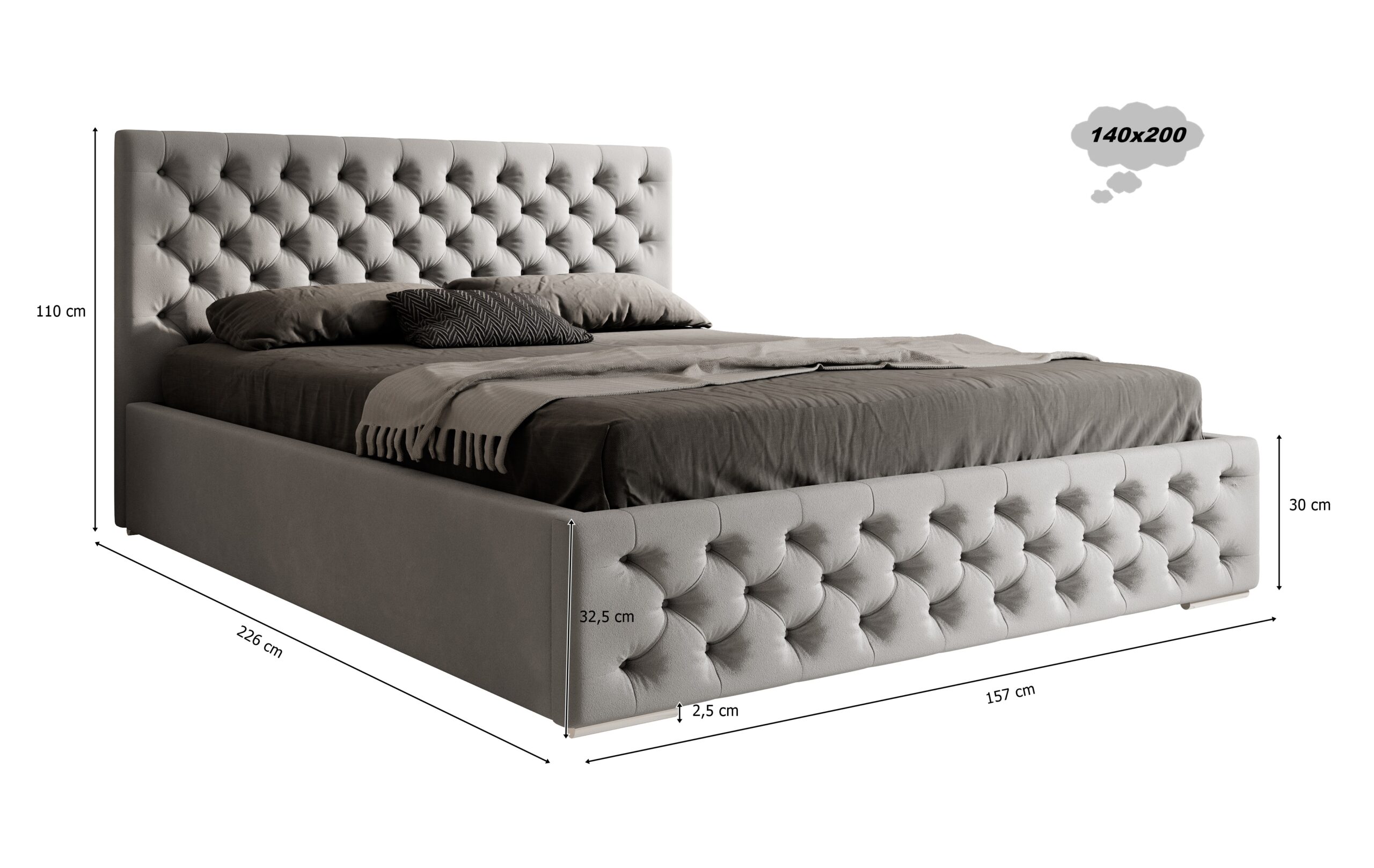 Łóżko standardowo wyposażone jest w drewniany stelaż z 30 listwami z drewna brzozowego, zapewniający odpowiednie podparcie dla materaca i komfort snu. Nóżki wykonane z chromowanego metalu o wysokości 2,5 cm nadają konstrukcji lekkości i nowoczesnego wyglądu.