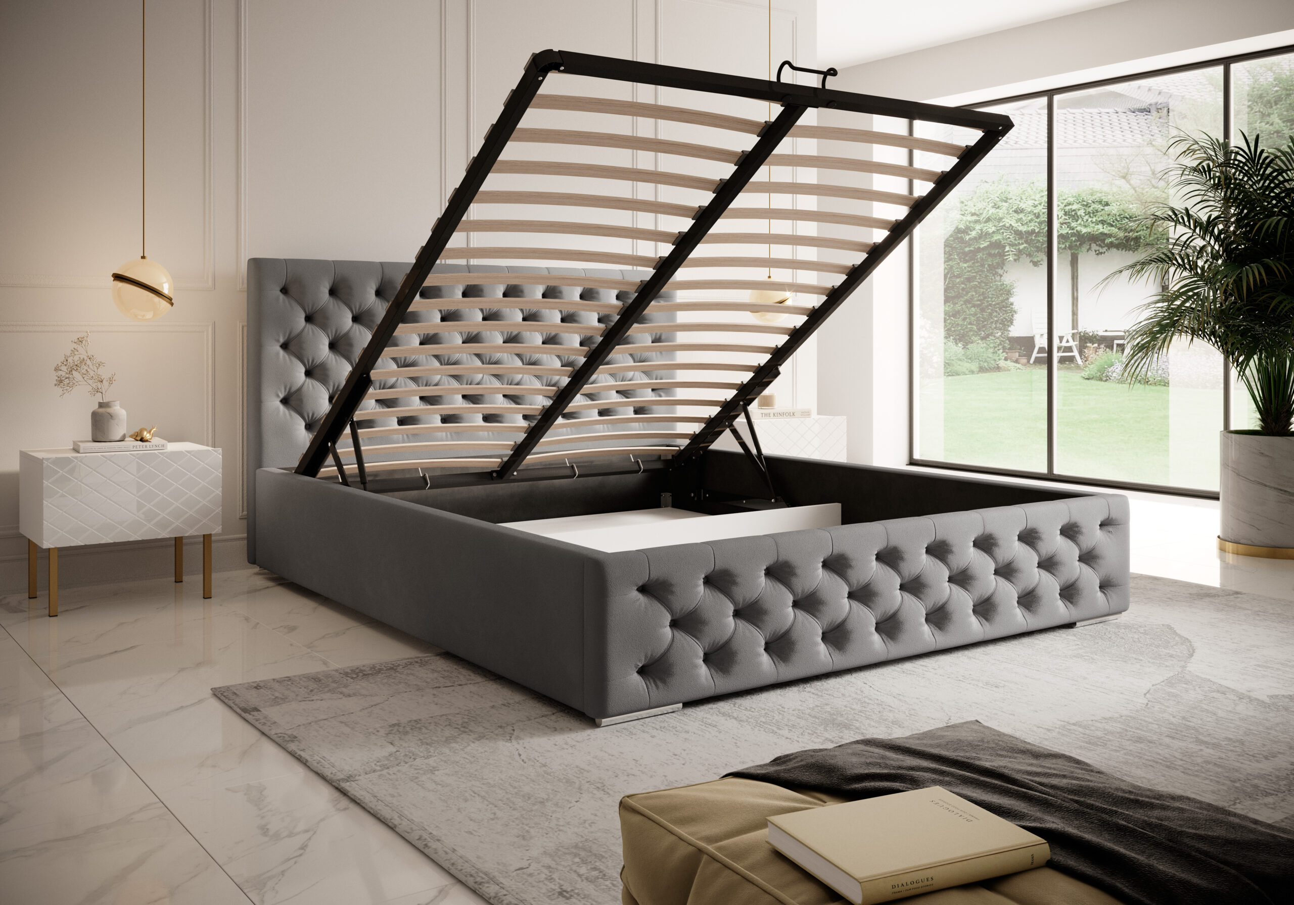 Model Belluno zachwyca nie tylko wyglądem, ale również funkcjonalnością. Pod całą powierzchnią spania znajduje się pojemny schowek na pościel, który ułatwia utrzymanie porządku w sypialni. Wnętrze pojemnika wykonano z białej płyty laminowanej i wykończono wigofilem – dzięki temu prezentuje się elegancko i jest łatwe do utrzymania w czystości.