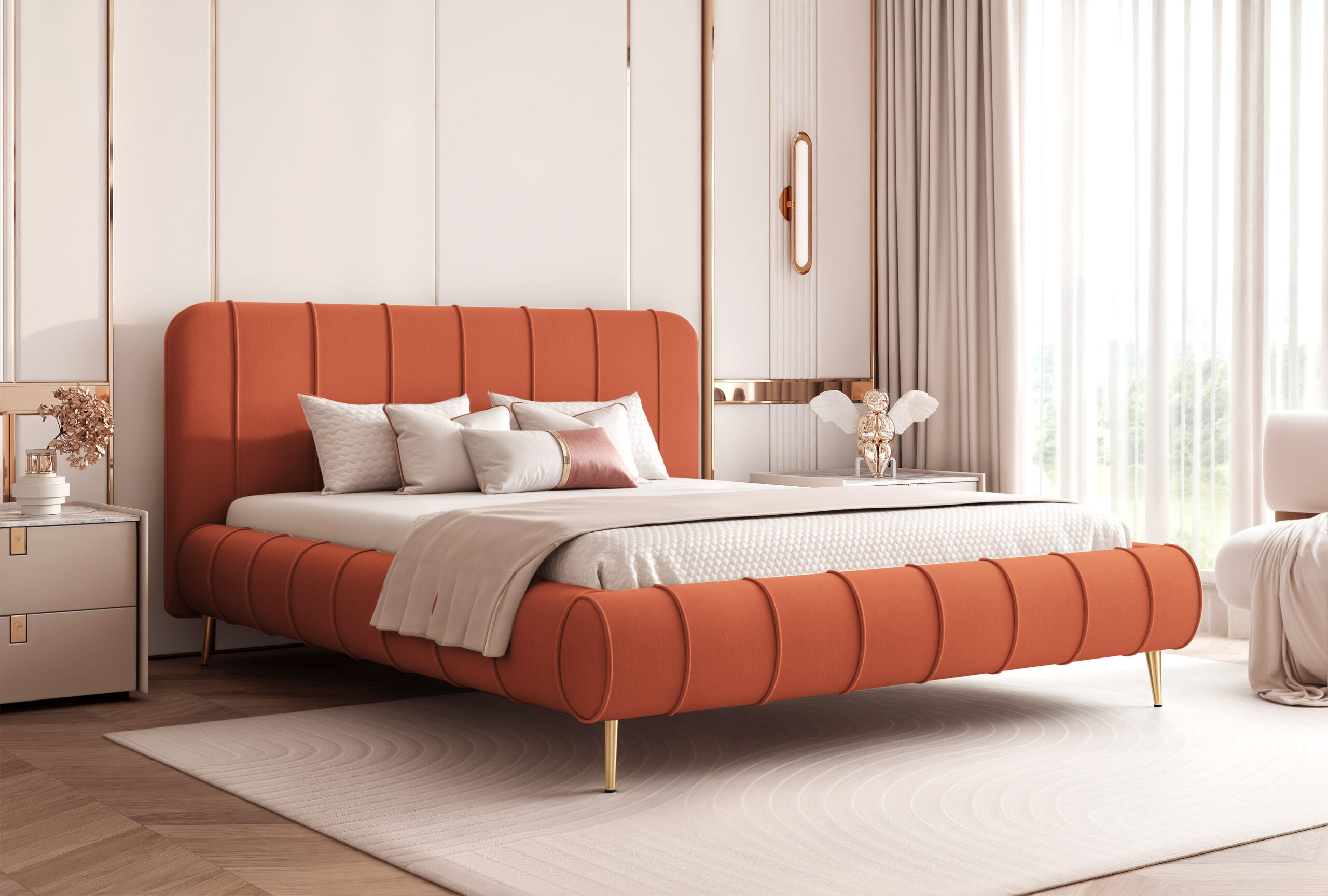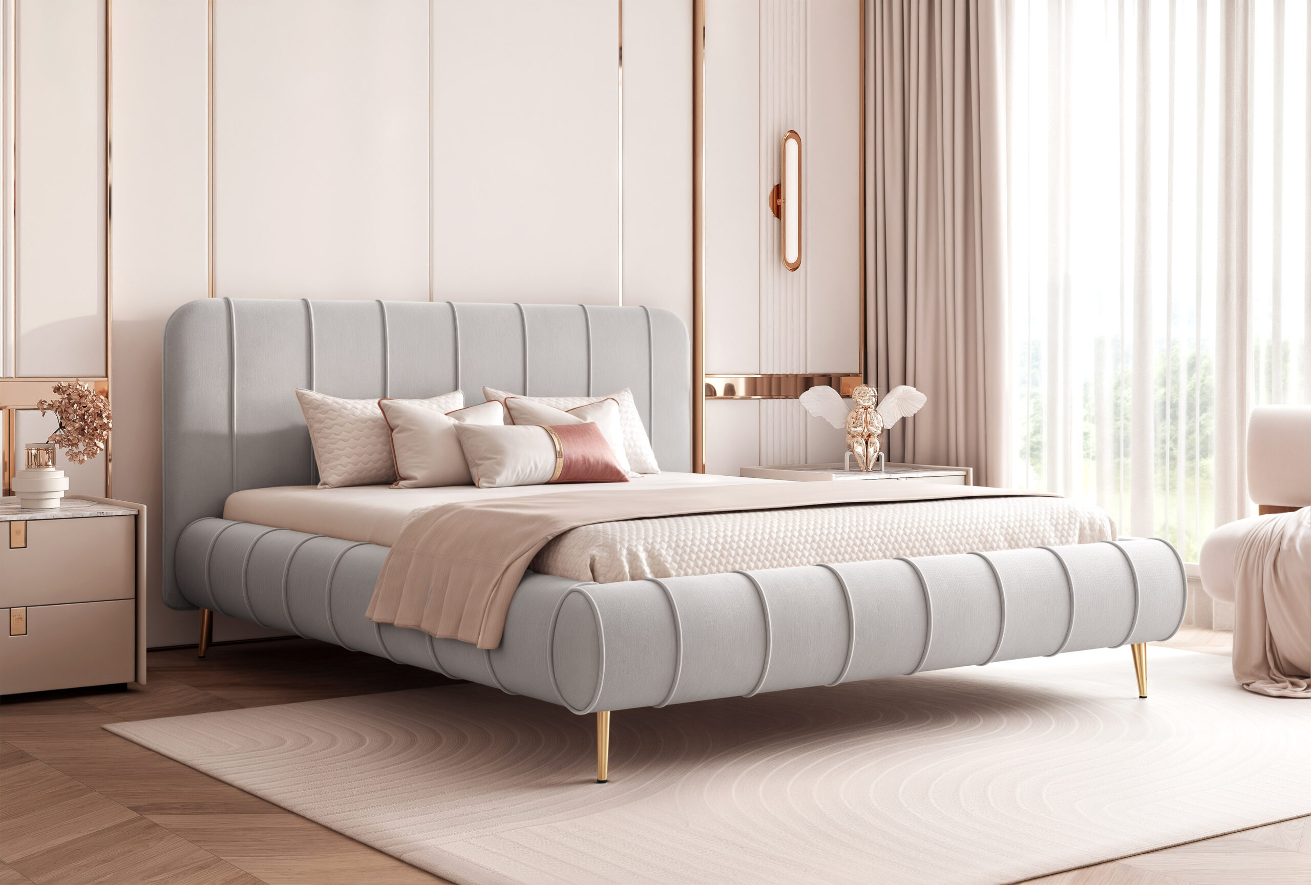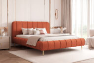 Wysokie nogi nadają konstrukcji lekkości i nowoczesnego charakteru, a jednocześnie ułatwiają utrzymanie czystości pod łóżkiem. Model doskonale prezentuje się w eleganckich, przestronnych sypialniach, a szeroki wybór tkanin obiciowych pozwala idealnie dopasować go do każdego stylu wnętrza.