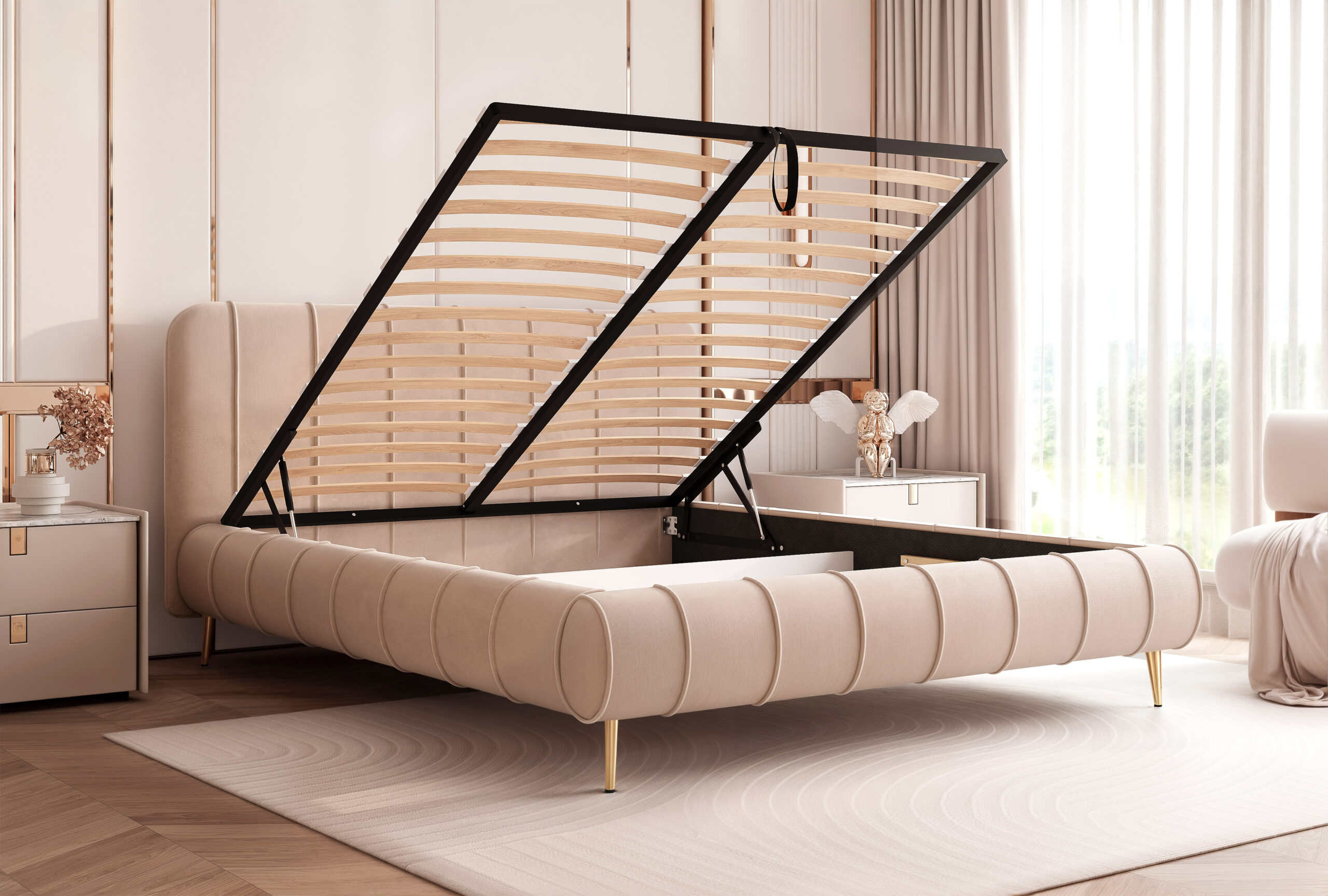 Model Slim 11N został zaprojektowany z myślą o funkcjonalności – wyposażono go w pojemny schowek na pościel pod całą powierzchnią spania, otwierany za pomocą stelaża z podnośnikami sprężynowymi. Klient może wybrać rodzaj stelaża: drewniany (w standardzie) lub metalowy (za dopłatą).