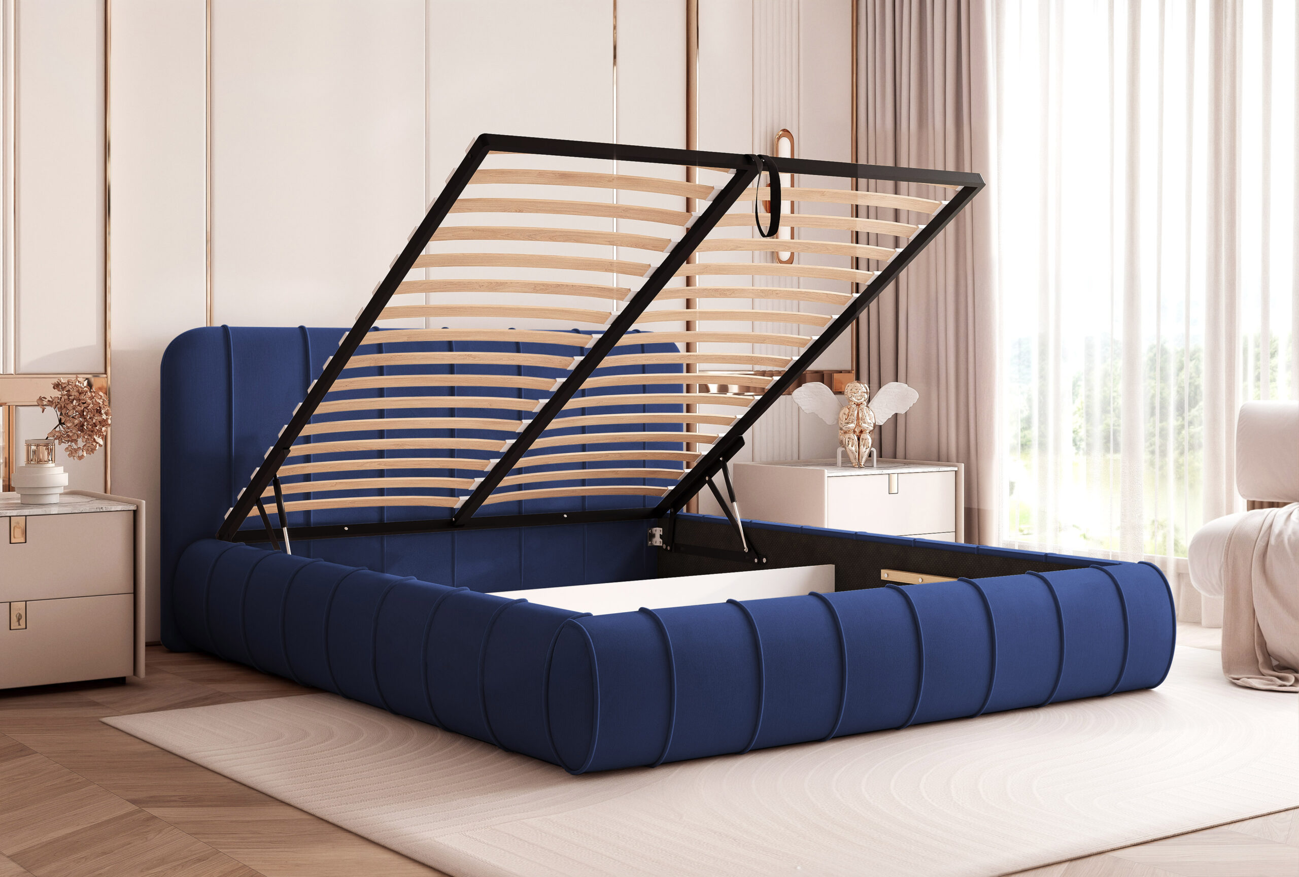 Łóżko posiada pojemny schowek na pościel pod całą powierzchnią spania, otwierany za pomocą stelaża z podnośnikami sprężynowymi, co gwarantuje wygodne użytkowanie i dodatkowe miejsce do przechowywania.