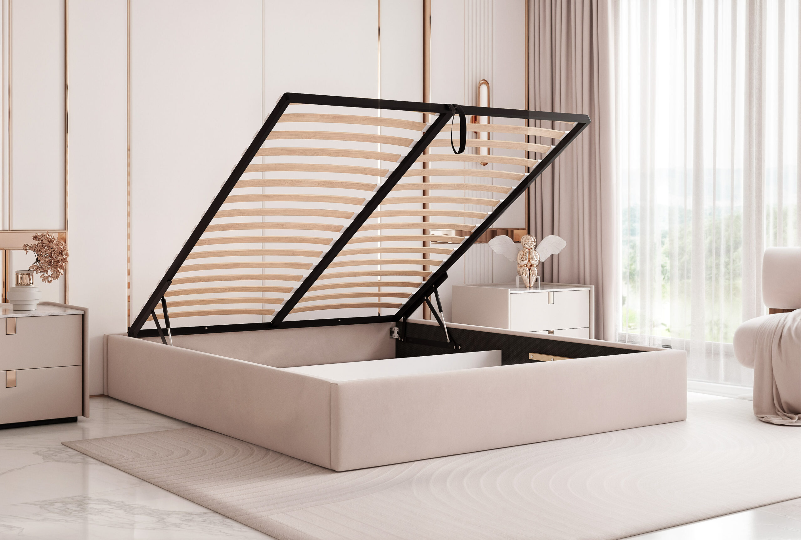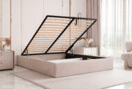 Model Concord Slim 12 posiada pojemny schowek na pościel pod całą powierzchnią spania, co gwarantuje wygodne przechowywanie i łatwy dostęp dzięki stelażowi z podnośnikami sprężynowymi (z możliwością wyboru rodzaju stelaża – drewniany w standardzie lub metalowy za dopłatą).