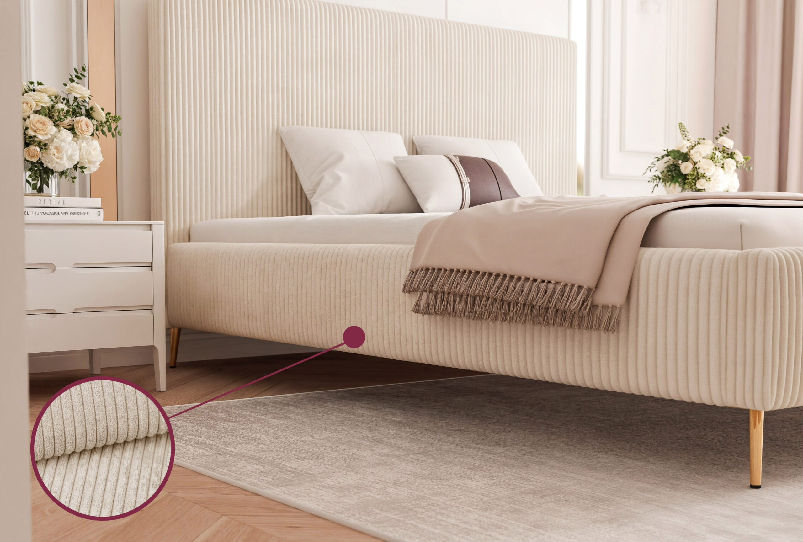 Szeroka gama tkanin obiciowych pozwala stworzyć łóżko idealnie pasujące do charakteru Twojej sypialni — od jasnych, naturalnych tonów po głębokie, luksusowe barwy.