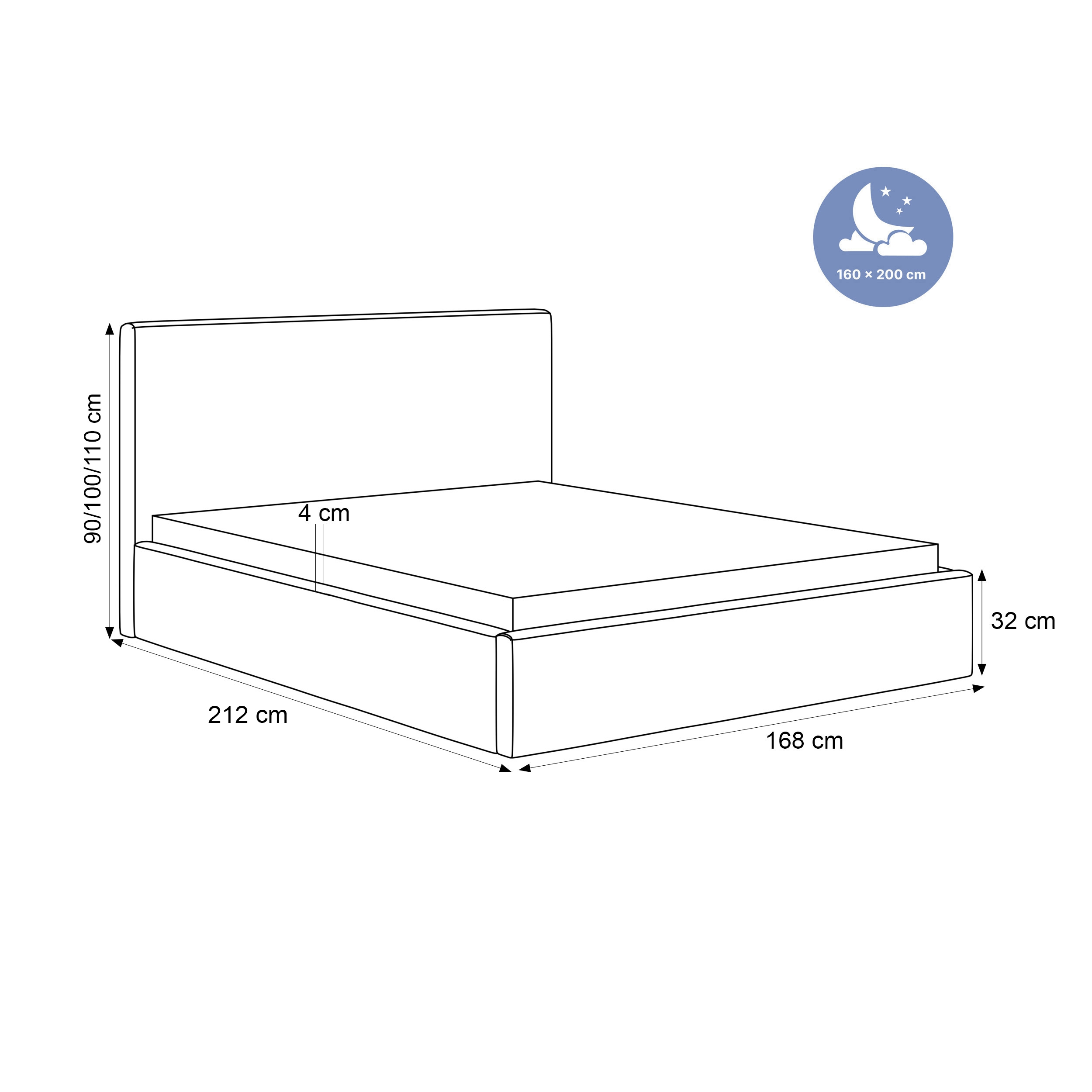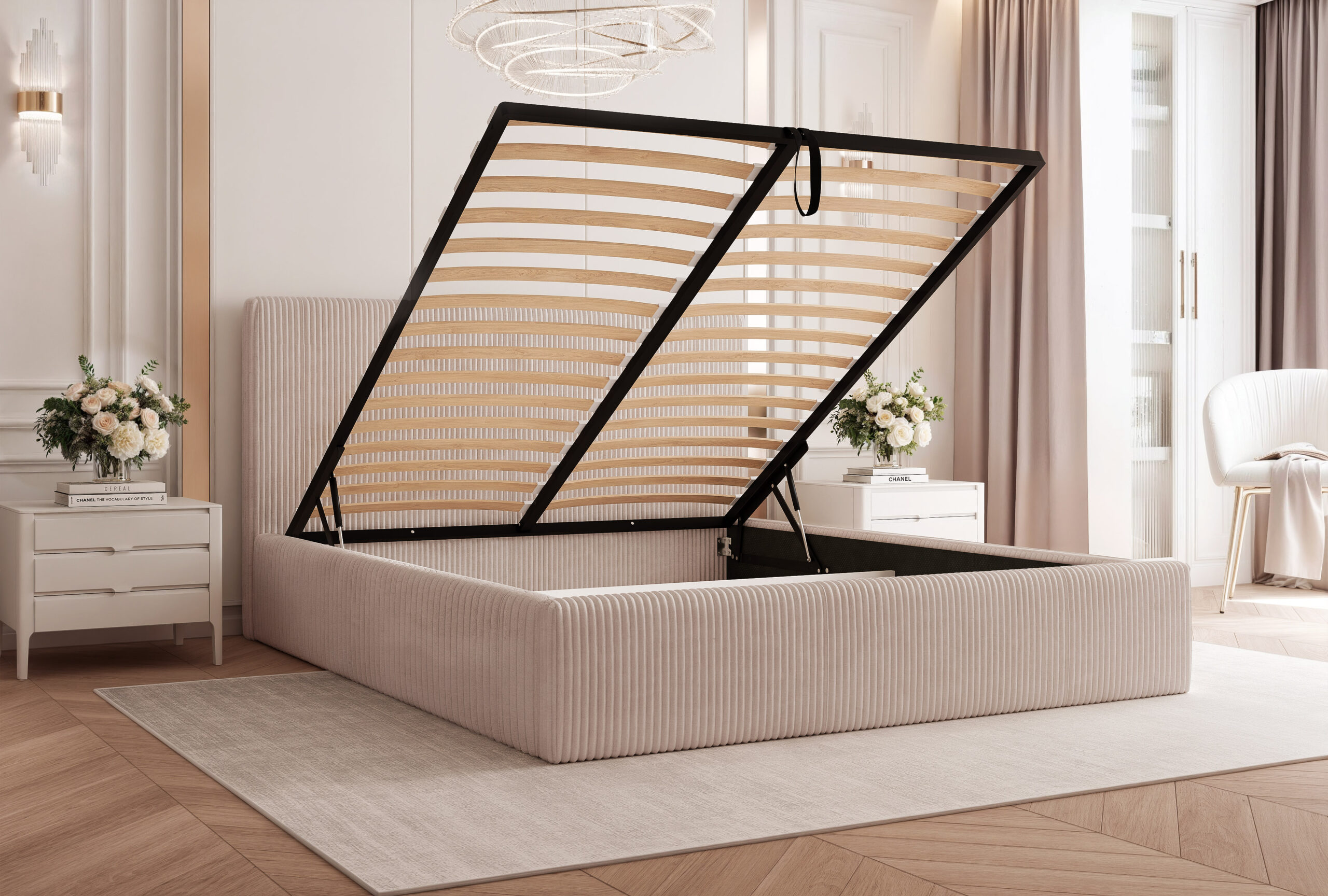 Model wyposażono w pojemny schowek na pościel pod całą powierzchnią spania, otwierany dzięki stelażowi z podnośnikami sprężynowymi.