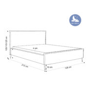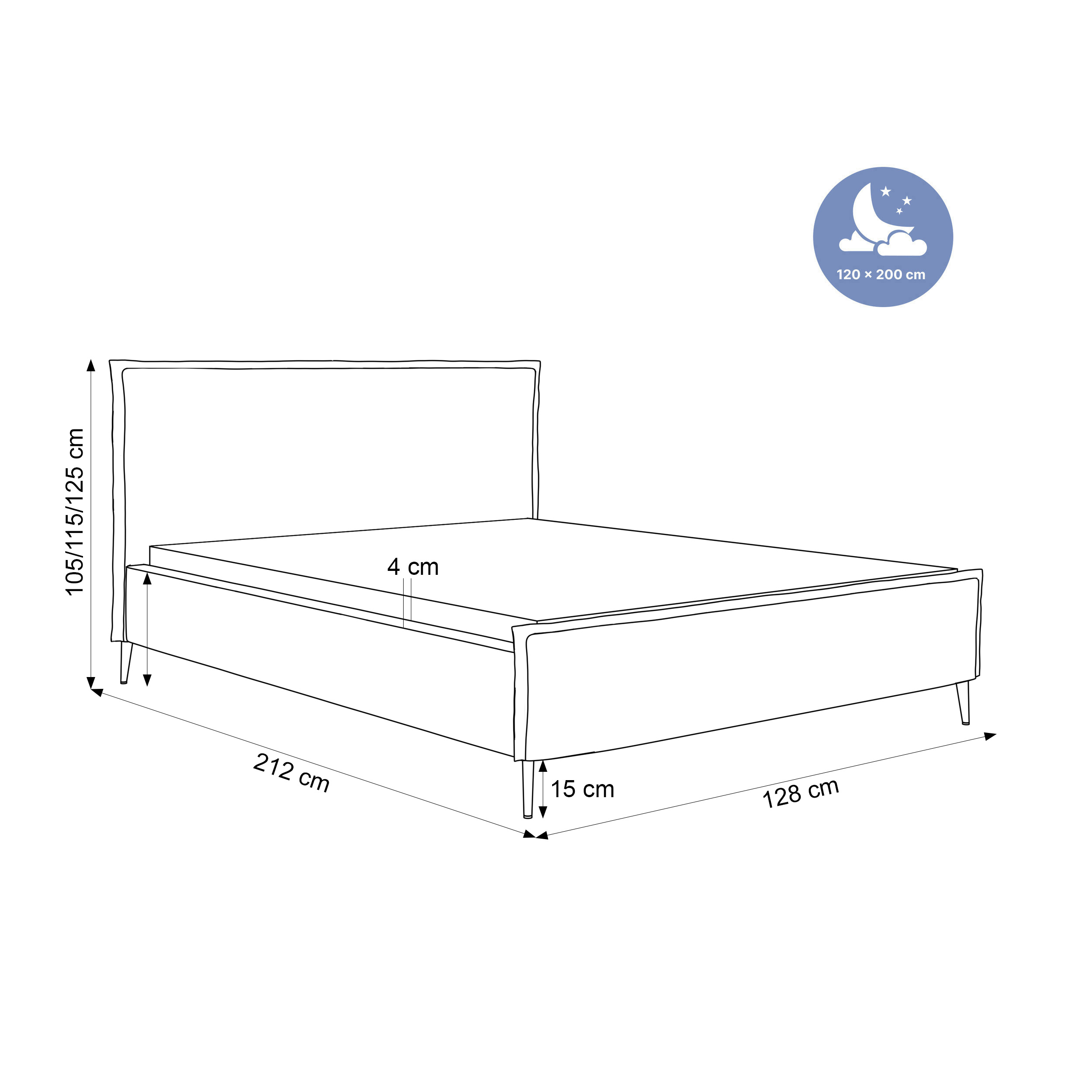 Dostępny w rozmiarach 120×200, 140×200, 160×200, 180×200 i 200×200 cm, z możliwością wyboru wysokości wezgłowia – od 70 do 110 cm.
