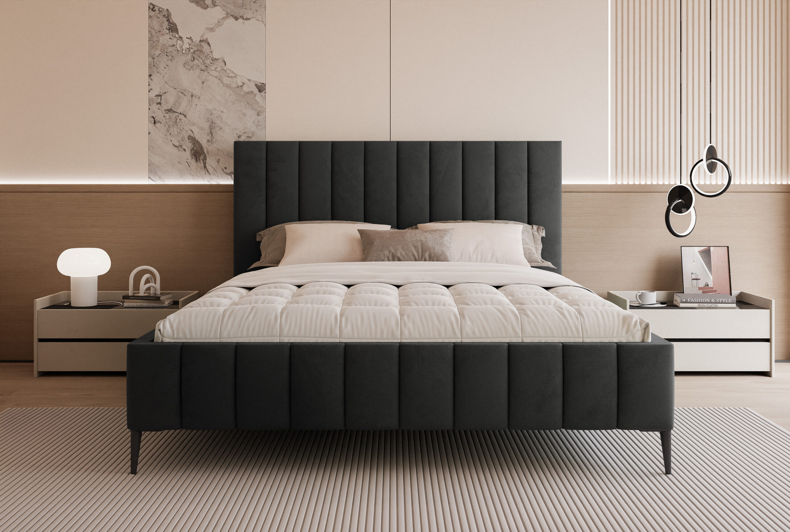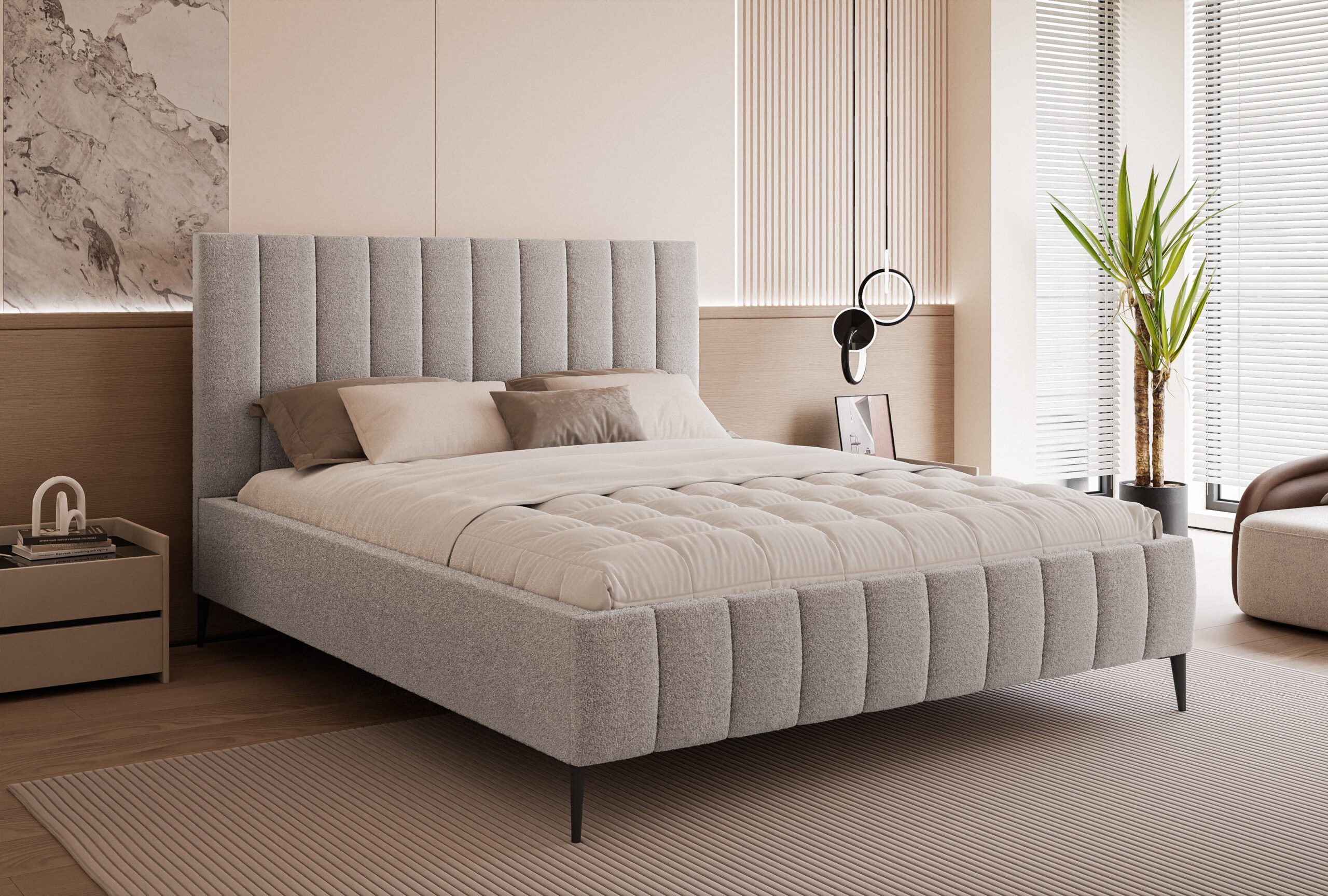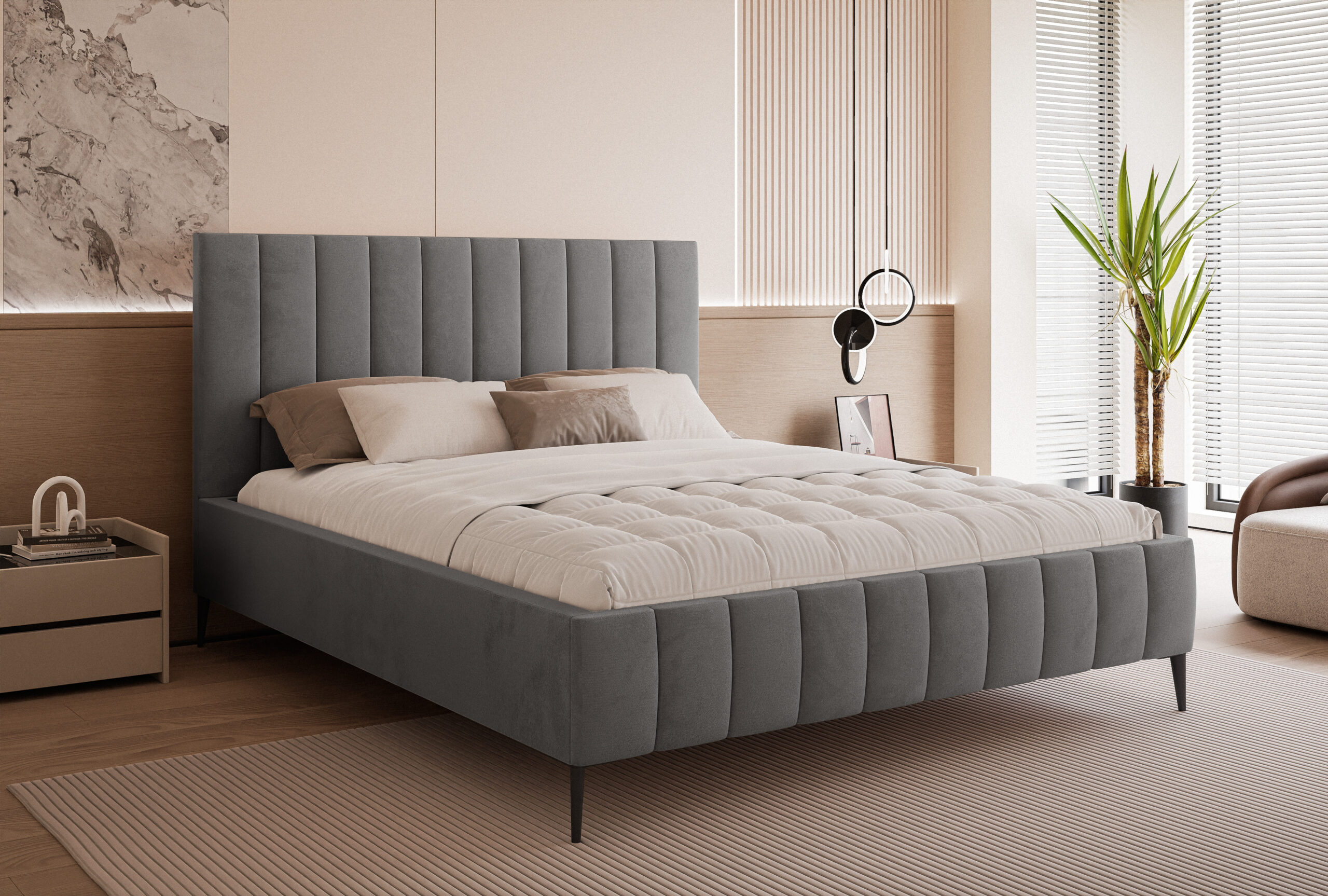Łóżko tapicerowane Concord Slim 4N to propozycja dla osób, które cenią połączenie elegancji, nowoczesnego designu i wysokiej funkcjonalności. Jego charakterystyczne, pionowe przeszycia na wysokim zagłówku dodają wnętrzu luksusowego charakteru i sprawiają, że łóżko staje się centralnym punktem sypialni.