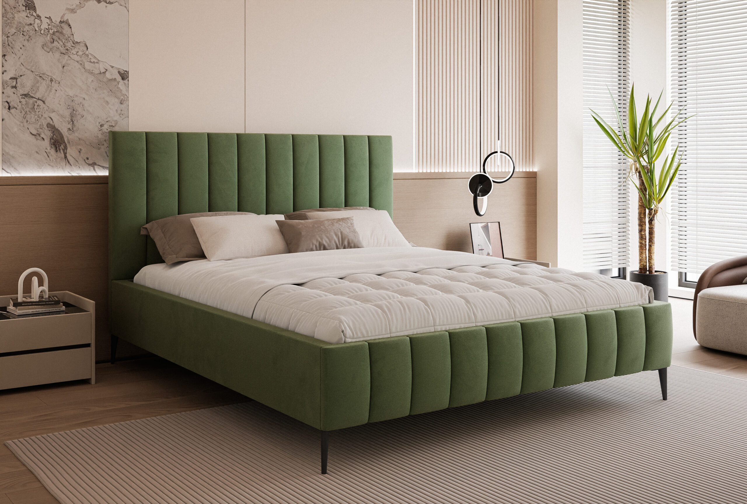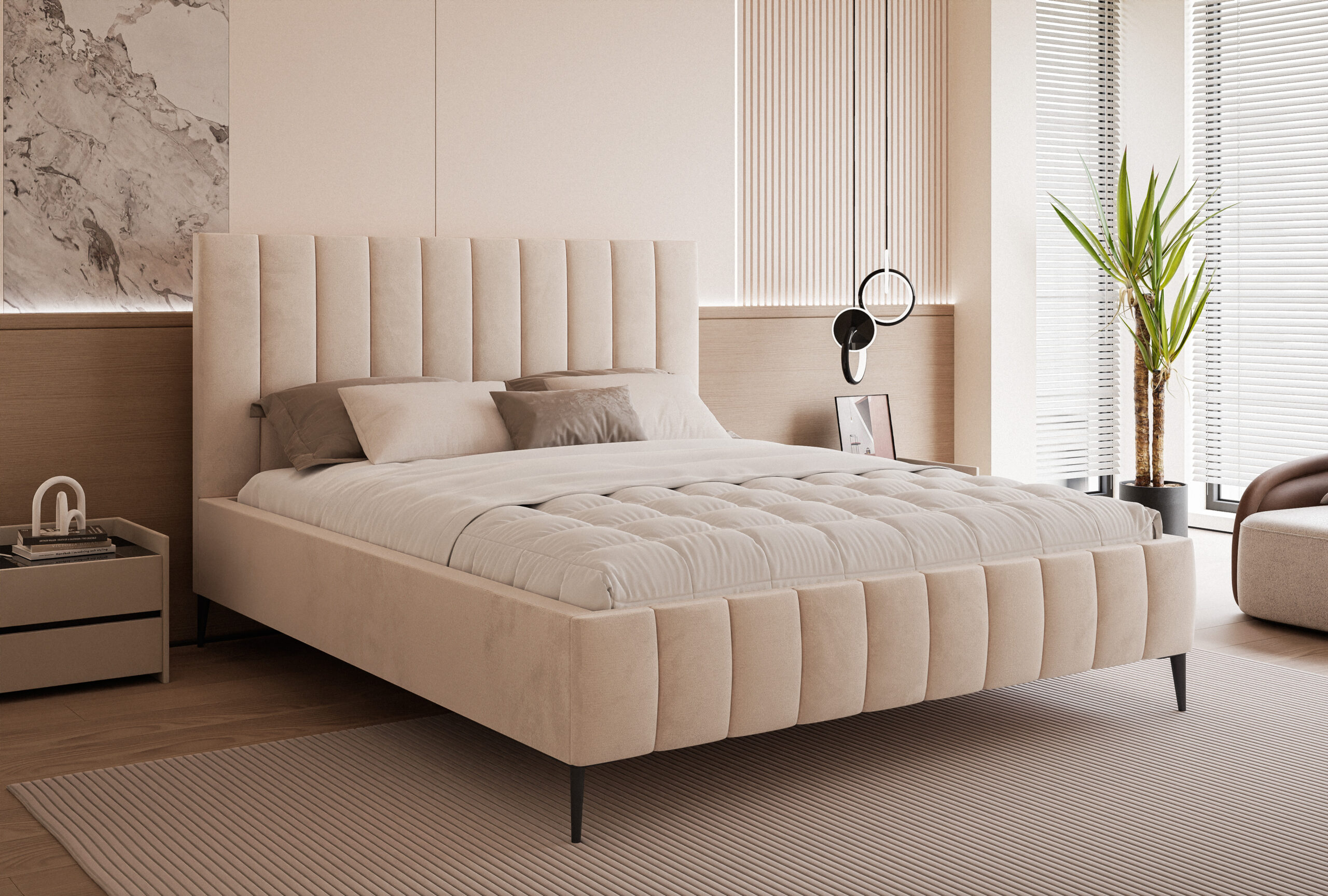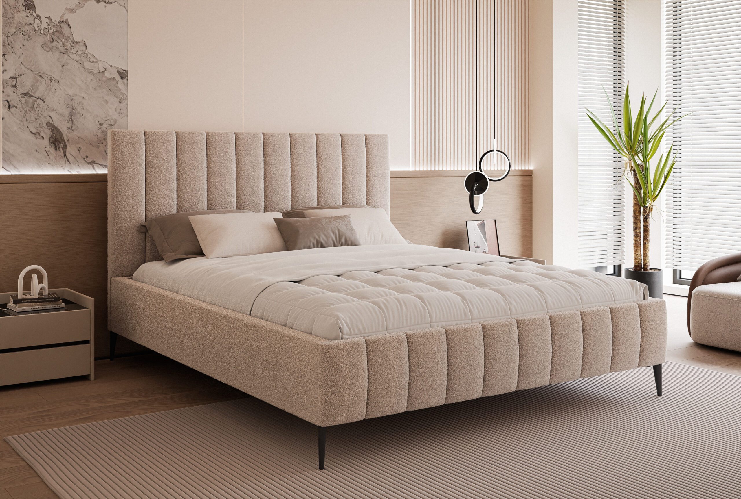 Łóżko tapicerowane Concord Slim 4N to propozycja dla osób, które cenią połączenie elegancji, nowoczesnego designu i wysokiej funkcjonalności. Jego charakterystyczne, pionowe przeszycia na wysokim zagłówku dodają wnętrzu luksusowego charakteru i sprawiają, że łóżko staje się centralnym punktem sypialni.