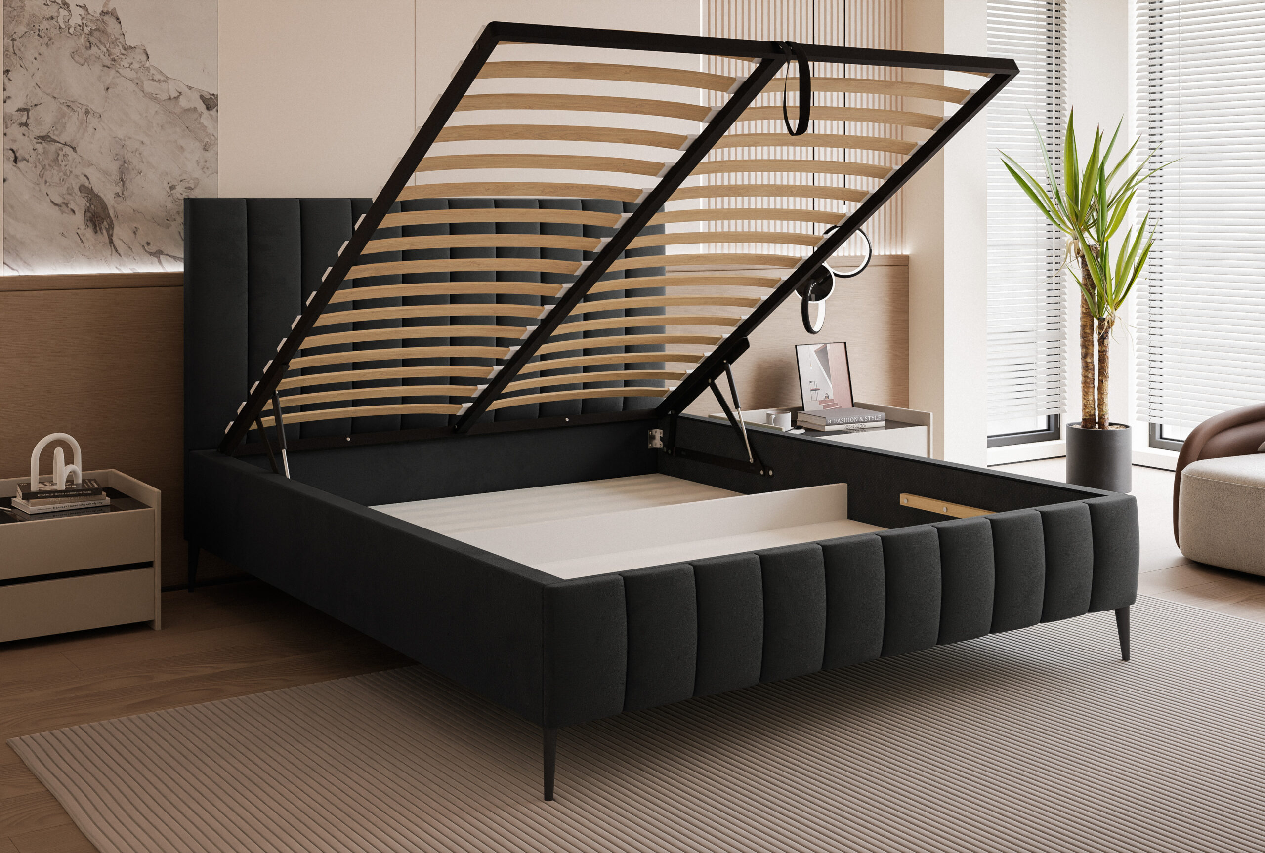 Model Slim 4 został wyposażony w praktyczny pojemnik na pościel pod całą powierzchnią spania. Dzięki solidnemu drewnianemu stelażowi z podnośnikami sprężynowymi codzienne korzystanie z pojemnika jest niezwykle wygodne, a dodatkowe miejsce do przechowywania ułatwia utrzymanie porządku w sypialni.