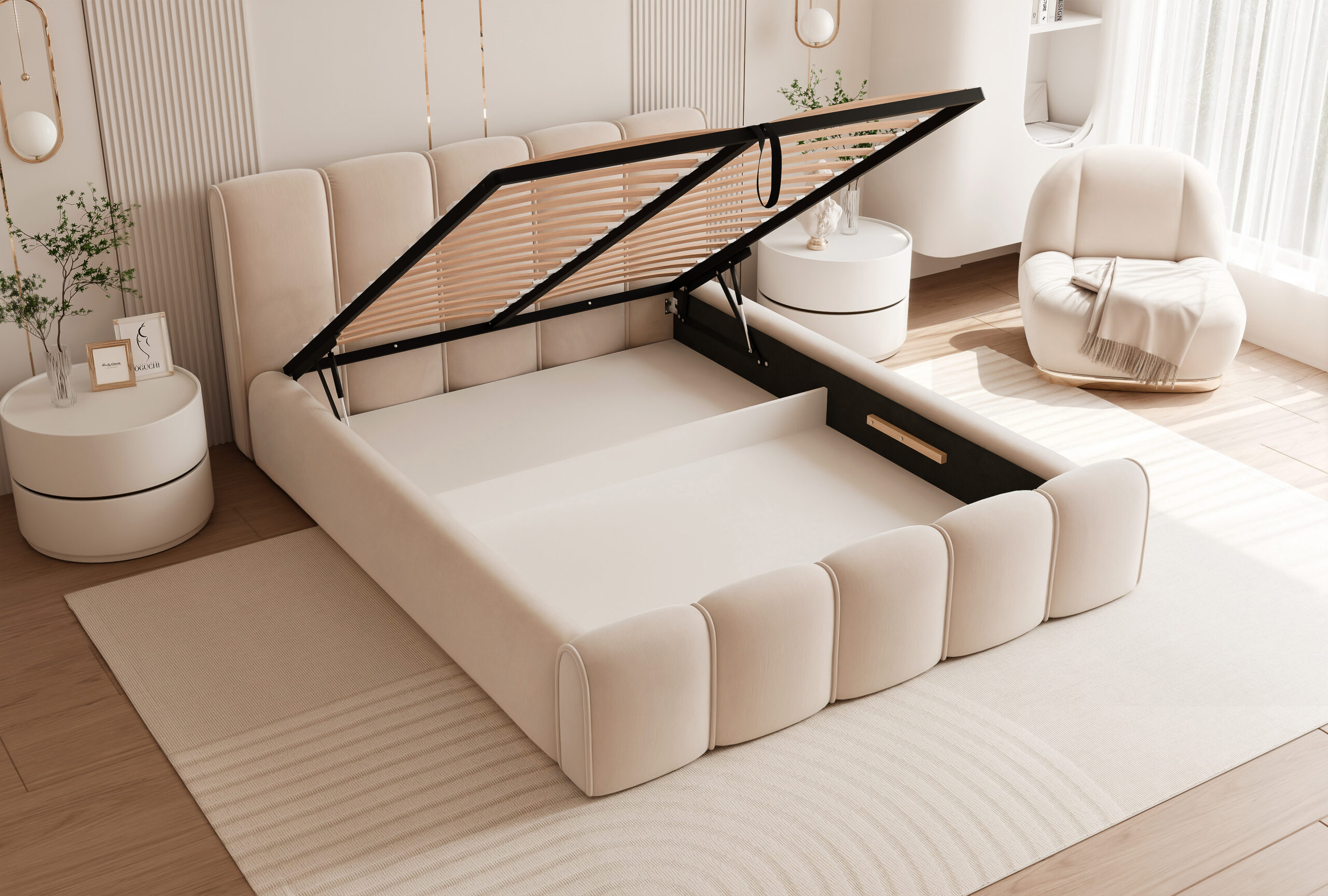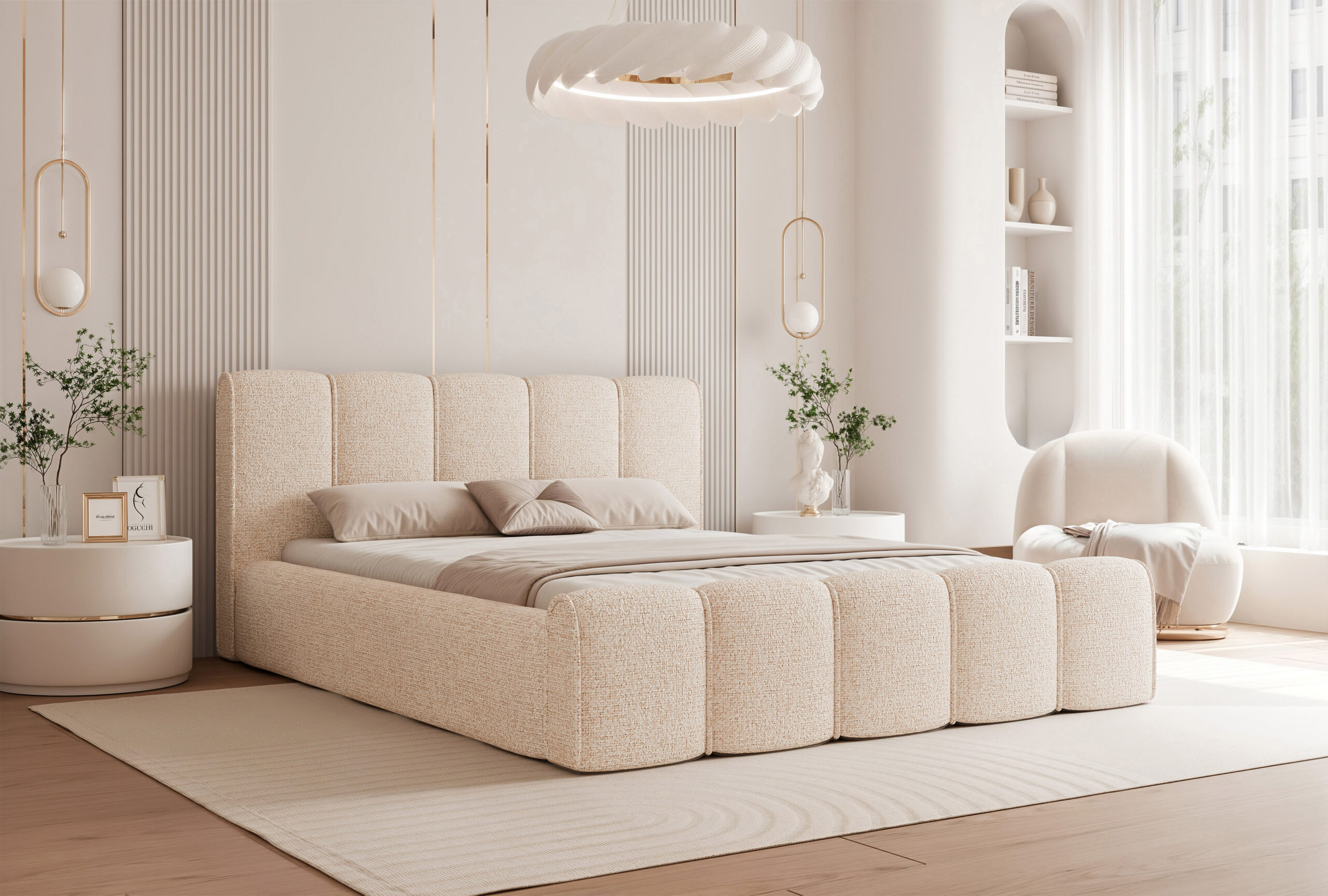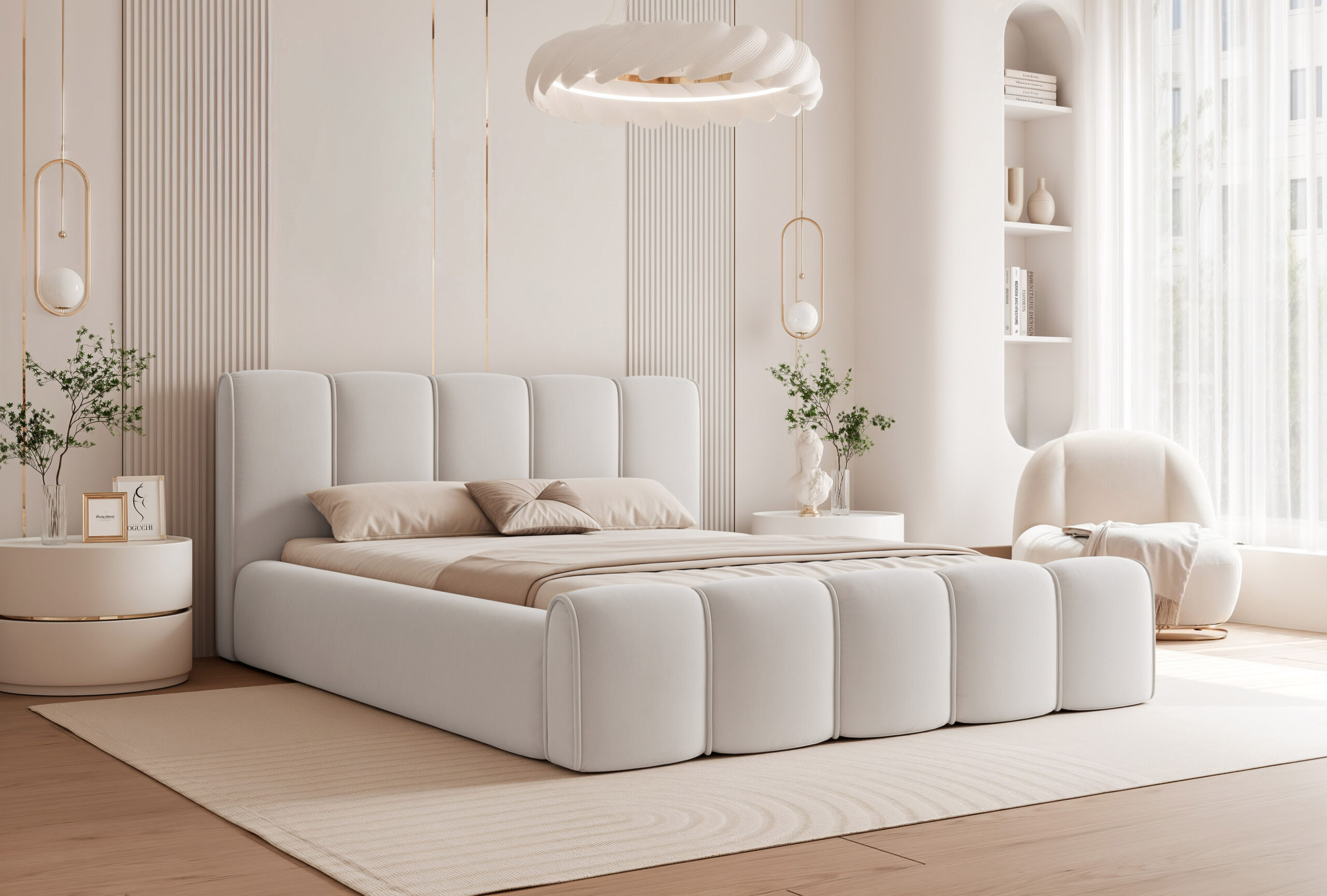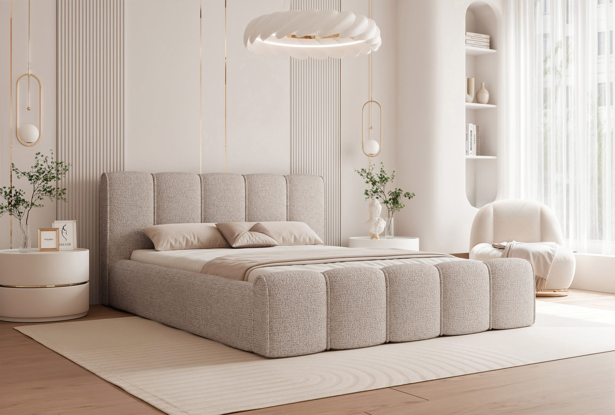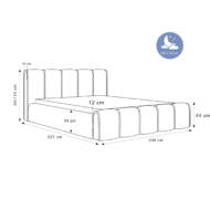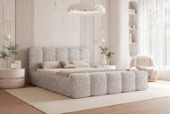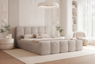 Łóżko tapicerowane Lareno z pojemnikiem na pościel to połączenie nowoczesnej elegancji z ponadczasowym stylem i wyjątkowym komfortem. Jego subtelna, zaokrąglona forma oraz wykończenia z dekoracyjną lamówką sprawiają, że mebel staje się centralnym punktem każdej sypialni — wprowadzając do niej harmonię i przytulny klimat.