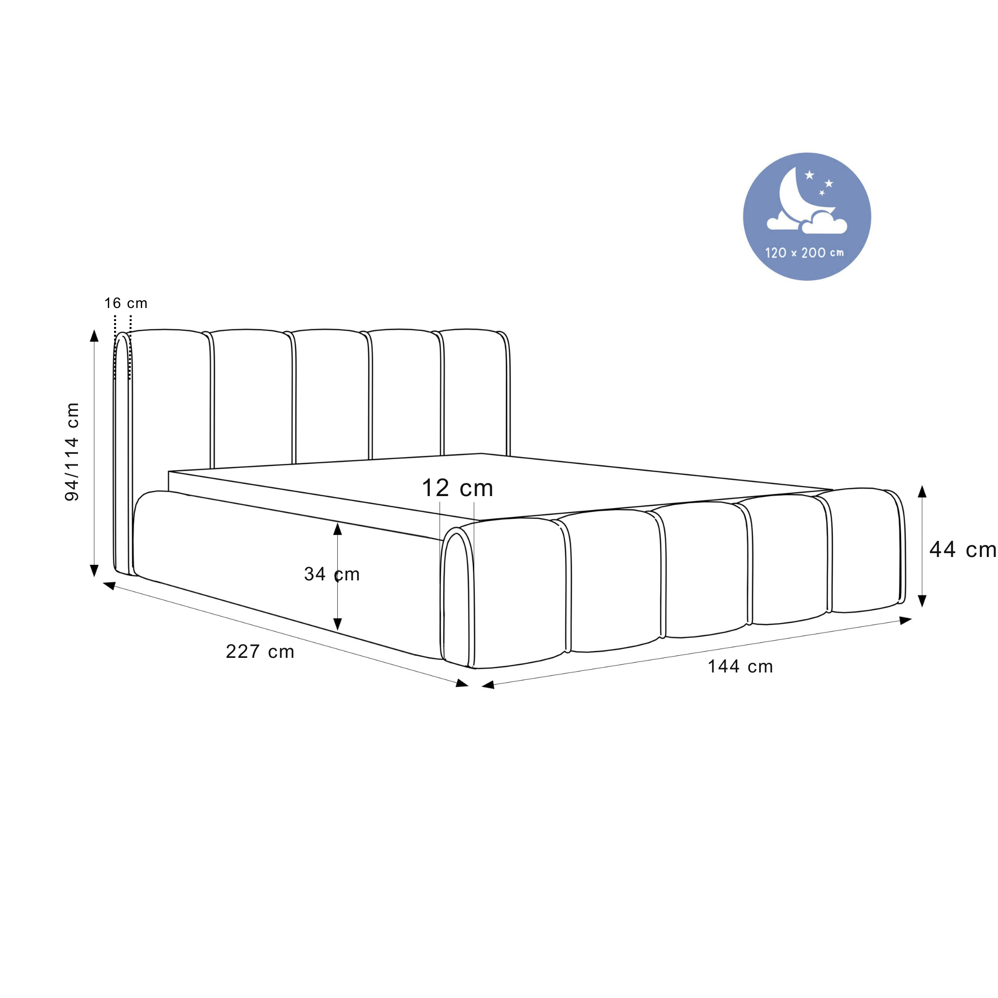 Powierzchnia spania: 120×200, 140×200, 160×200, 180×200, 200×200