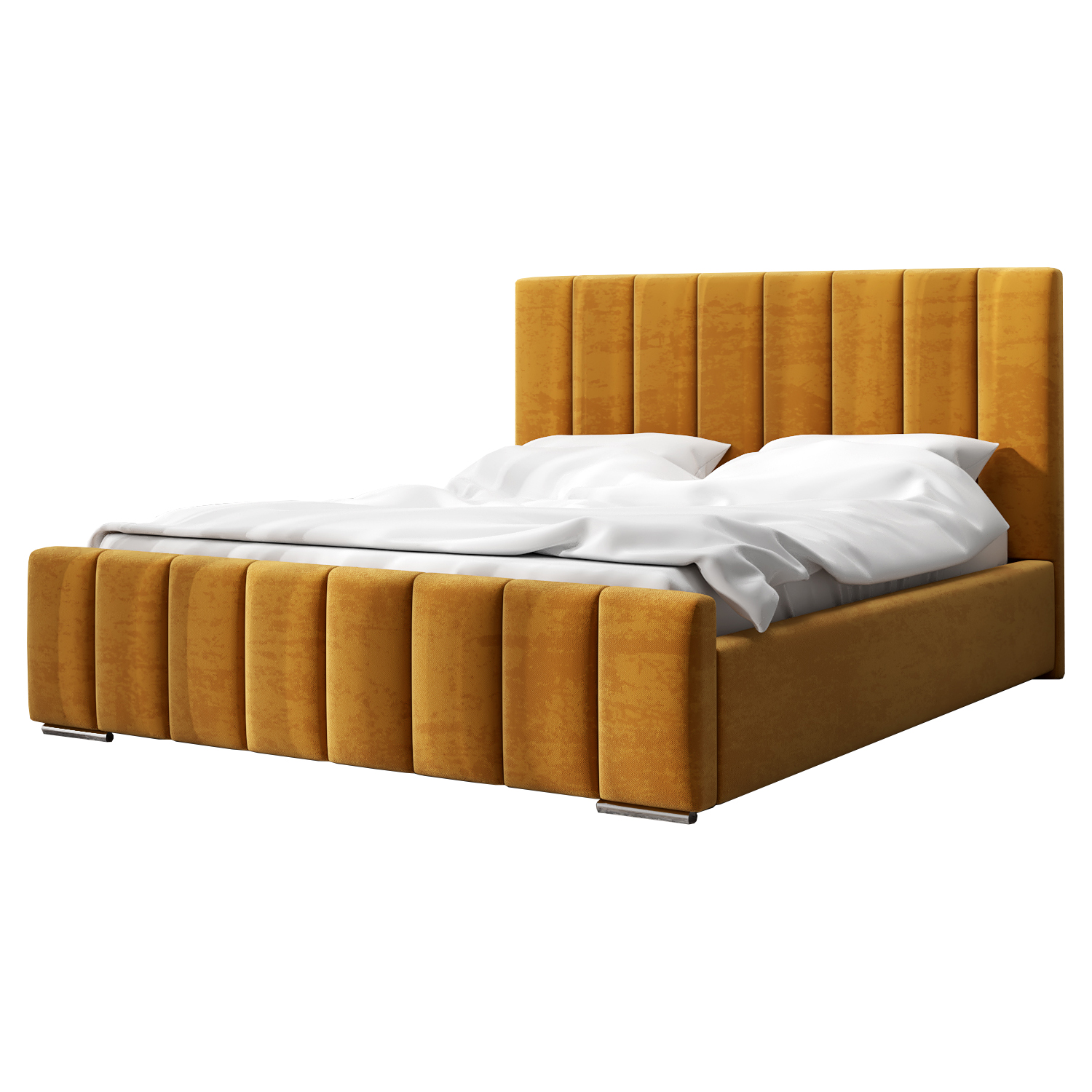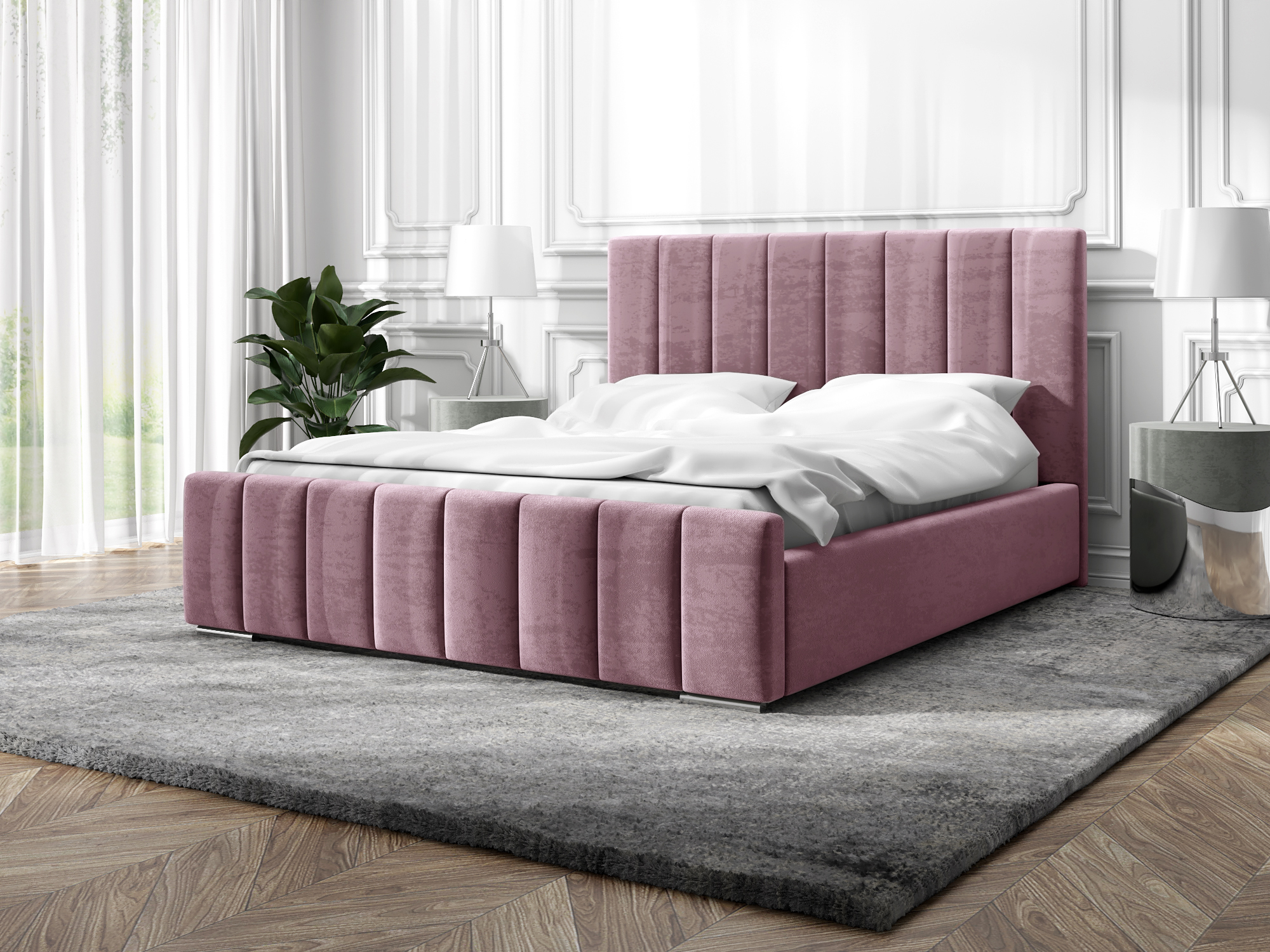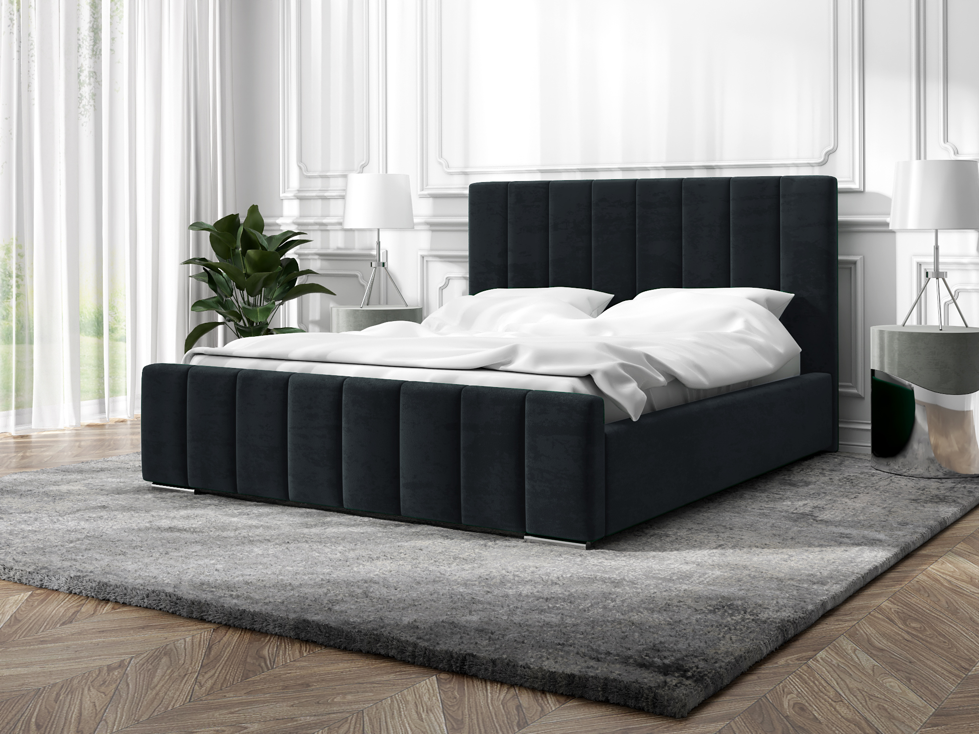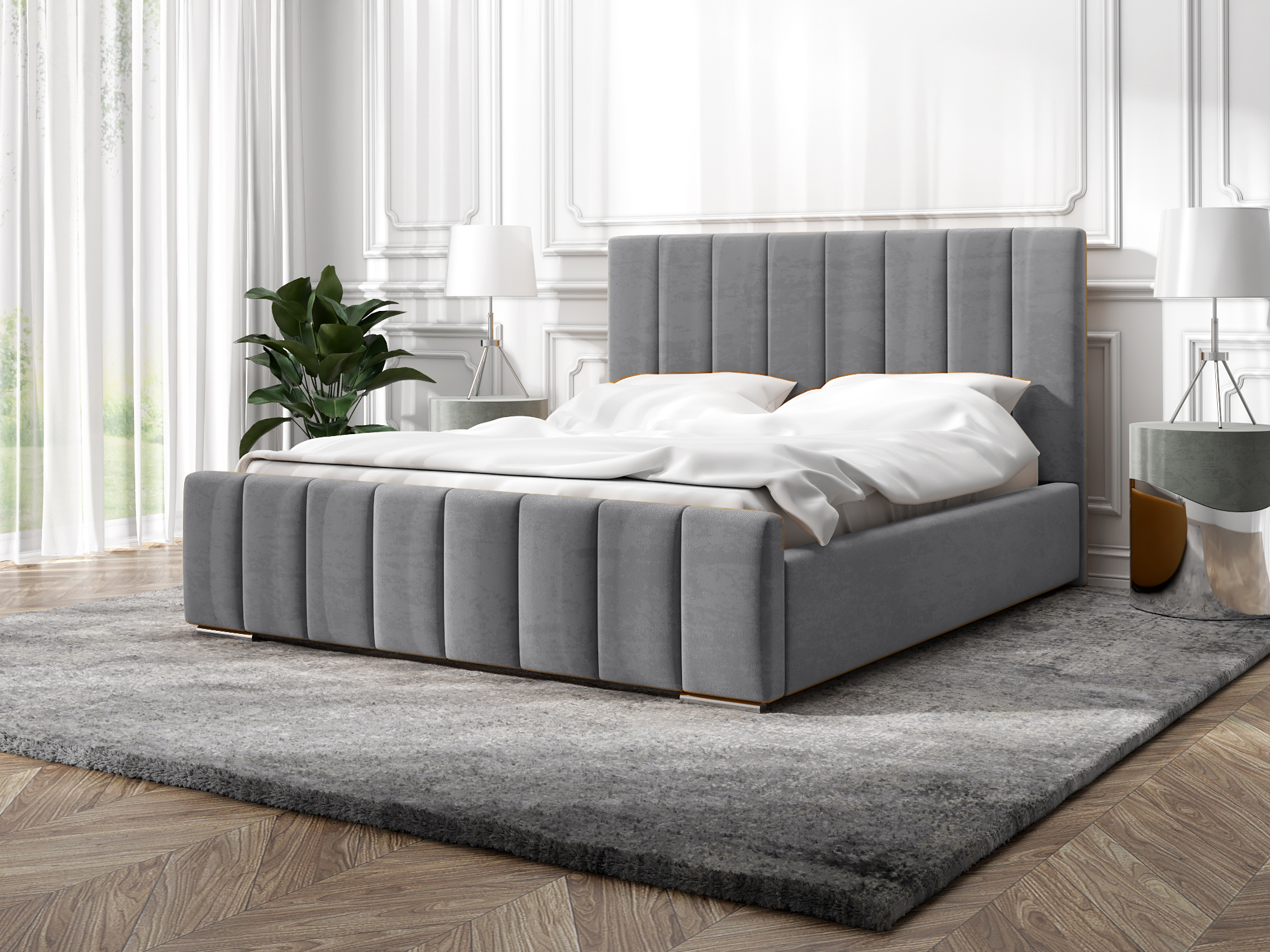 Łóżko tapicerowane Lugano z pojemnikiem na pościel to nowoczesna propozycja dla osób ceniących elegancki wygląd i wyjątkowy komfort snu. Charakterystyczne, pionowe przeszycia na wysokim zagłówku oraz na froncie łóżka tworzą efektowną, harmonijną kompozycję, dzięki której mebel staje się centralnym punktem każdej sypialni. To model, który doskonale łączy w sobie estetykę, funkcjonalność i solidność wykonania.