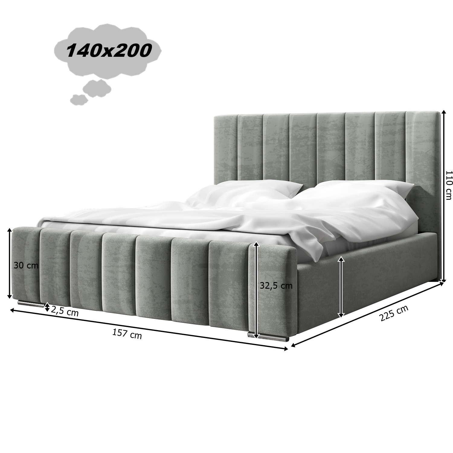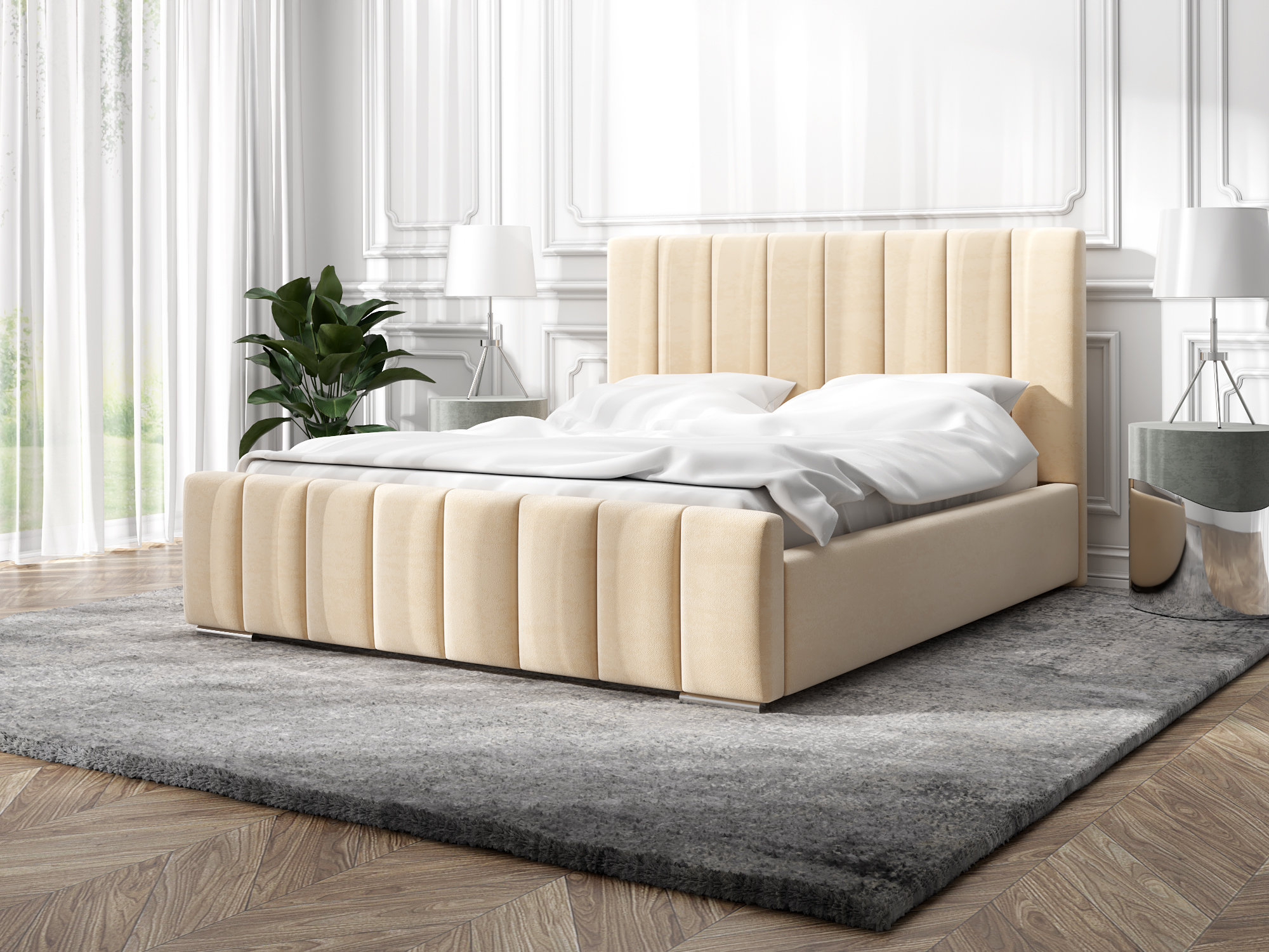 Zagłówek i przód łóżka wykonano z pianki o grubości 3 cm, co zapewnia miękkość, wygodę oraz idealne oparcie podczas wieczornego relaksu. Starannie tapicerowana konstrukcja gwarantuje trwałość i łatwość utrzymania w czystości, a nowoczesna forma nadaje wnętrzu lekkości i subtelnego charakteru.