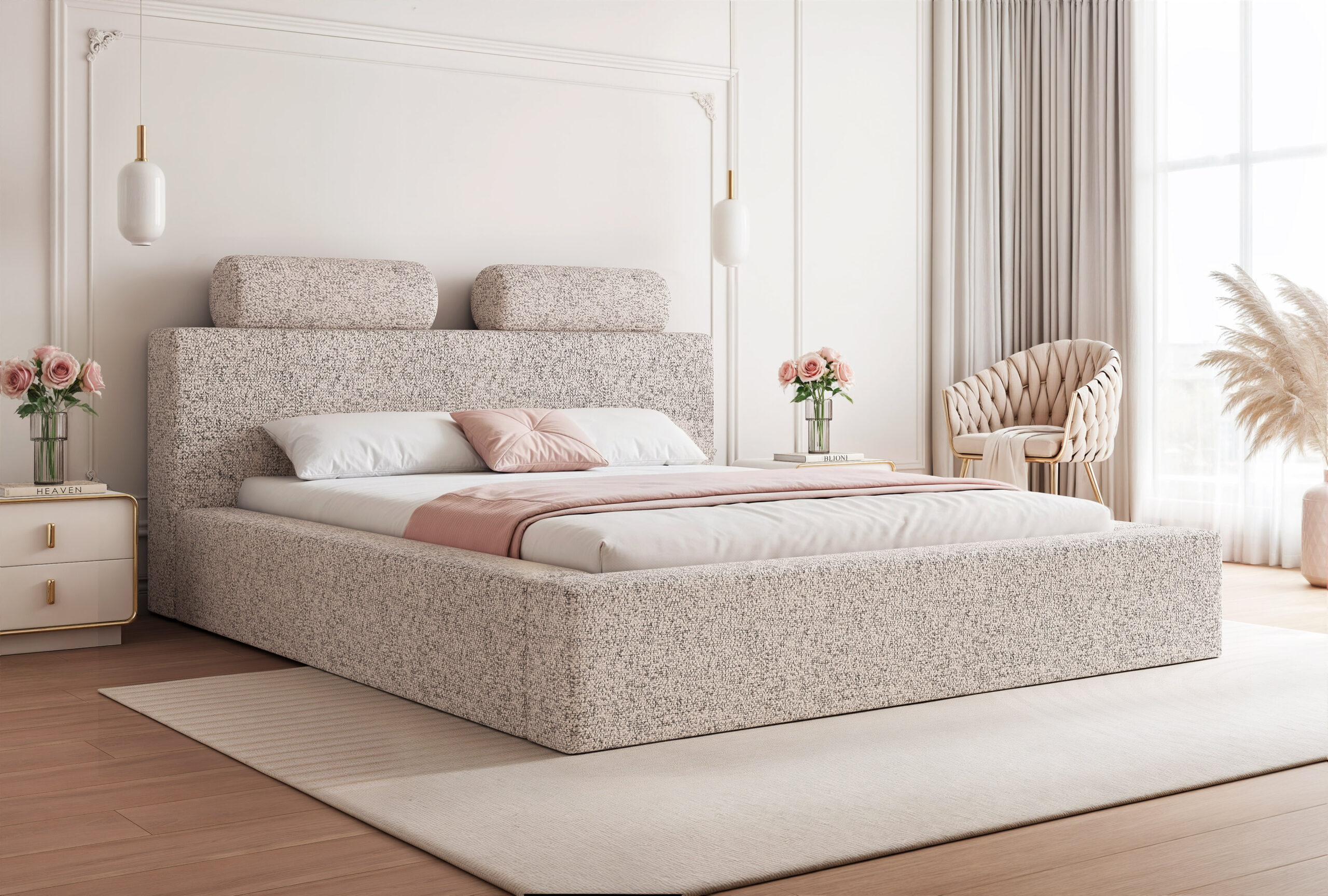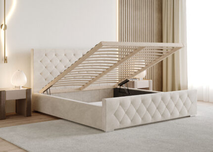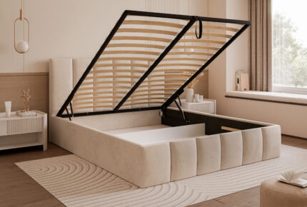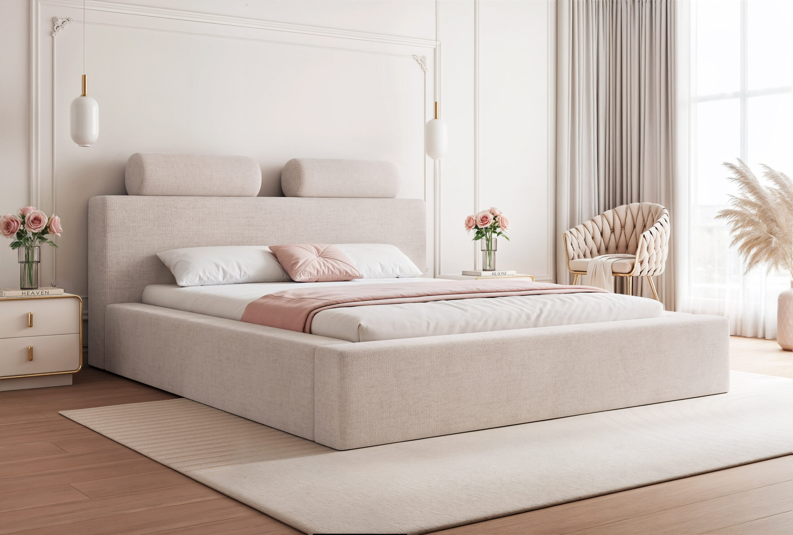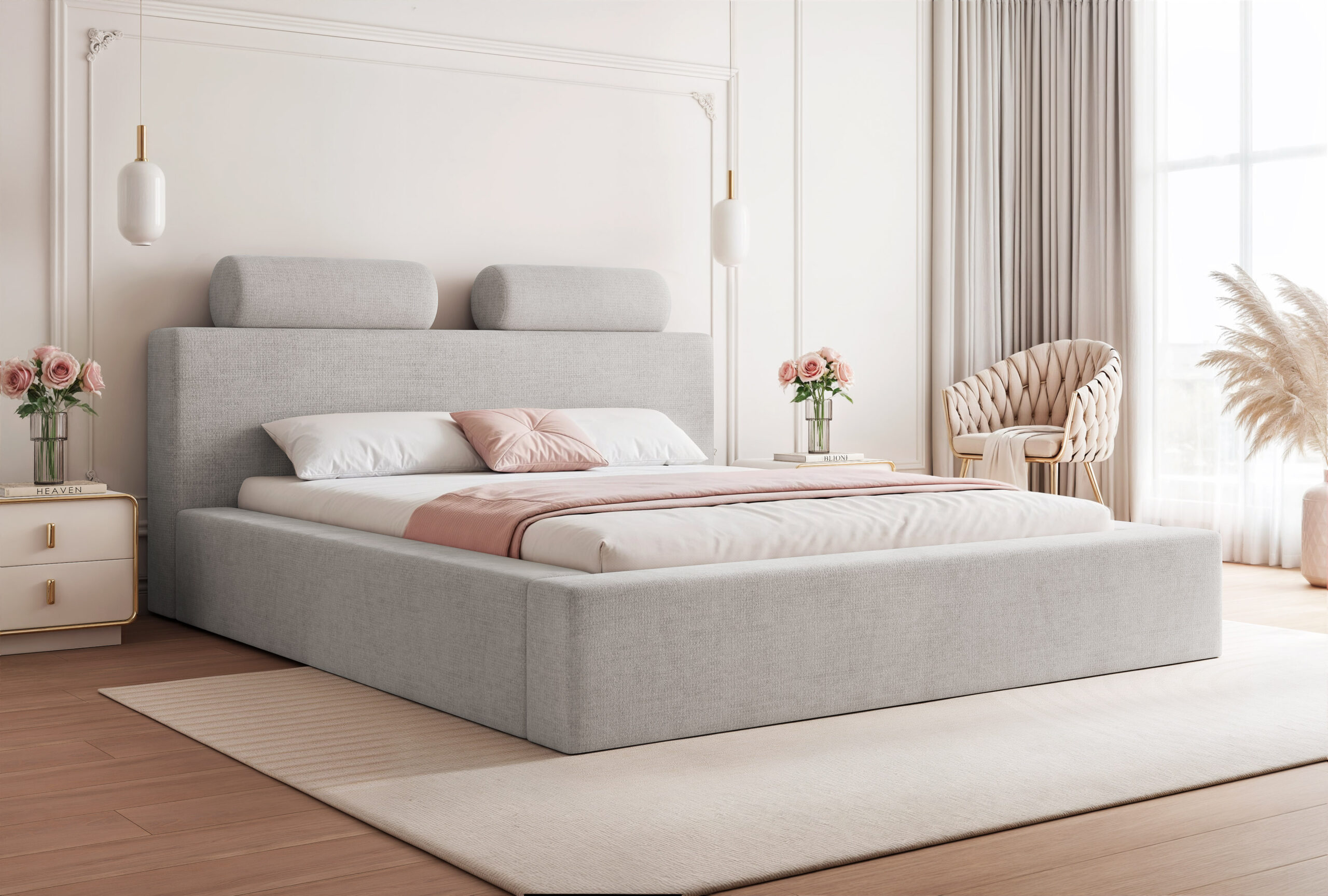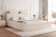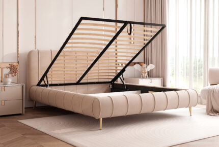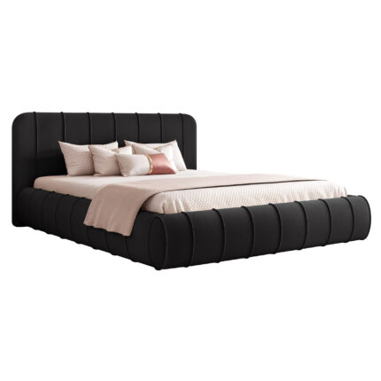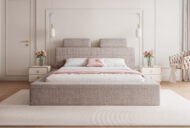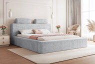 Łóżko tapicerowane Montaro z pojemnikiem na pościel to wyjątkowe połączenie minimalistycznego designu, nowoczesnej formy i maksymalnego komfortu użytkowania. Jego charakterystycznym elementem są miękkie wałkiumieszczone na szczycie zagłówka, które nadają łóżku niepowtarzalny wygląd i podkreślają jego nowoczesny styl. To model, który wprowadza do sypialni spokój, elegancję i subtelną przytulność.