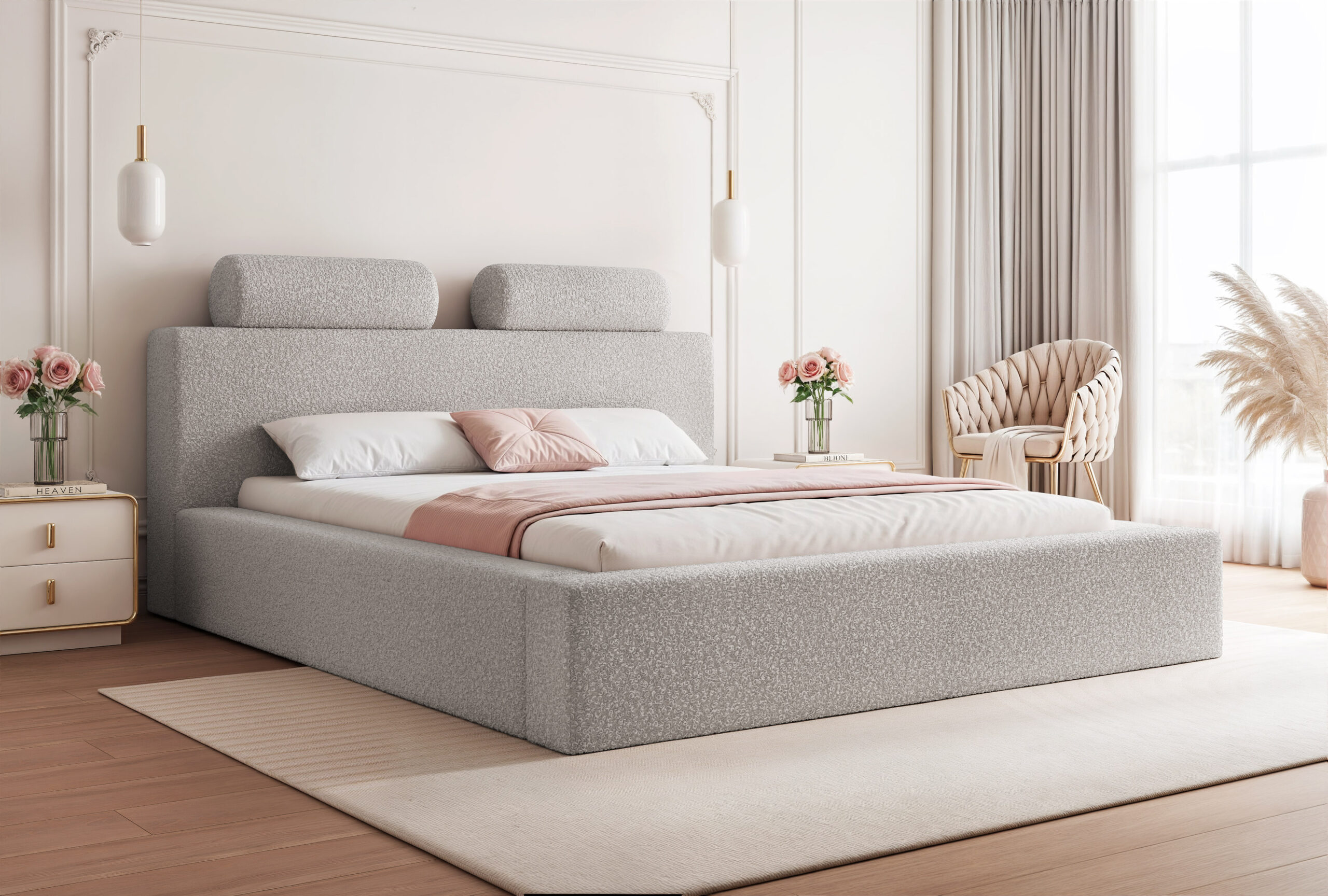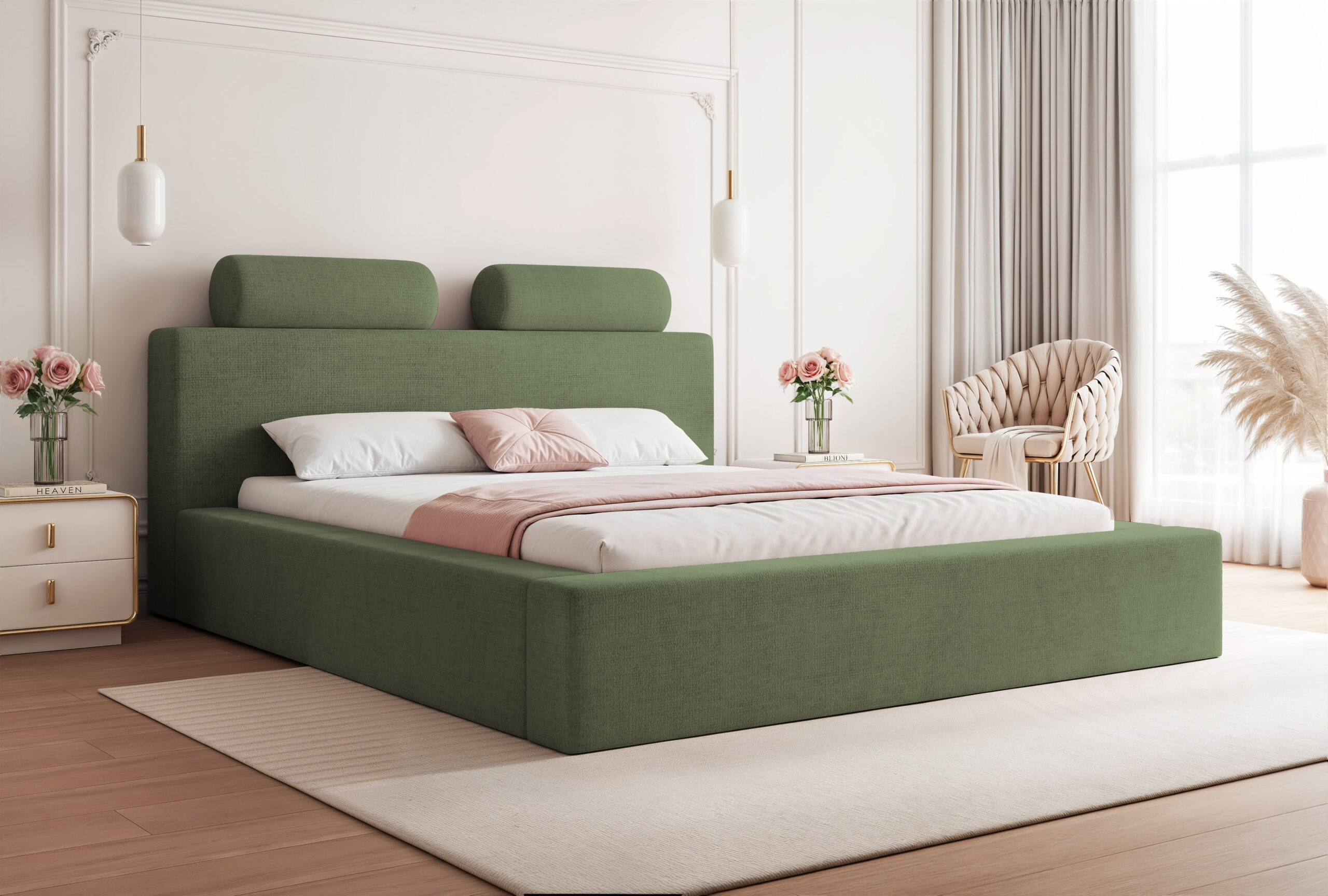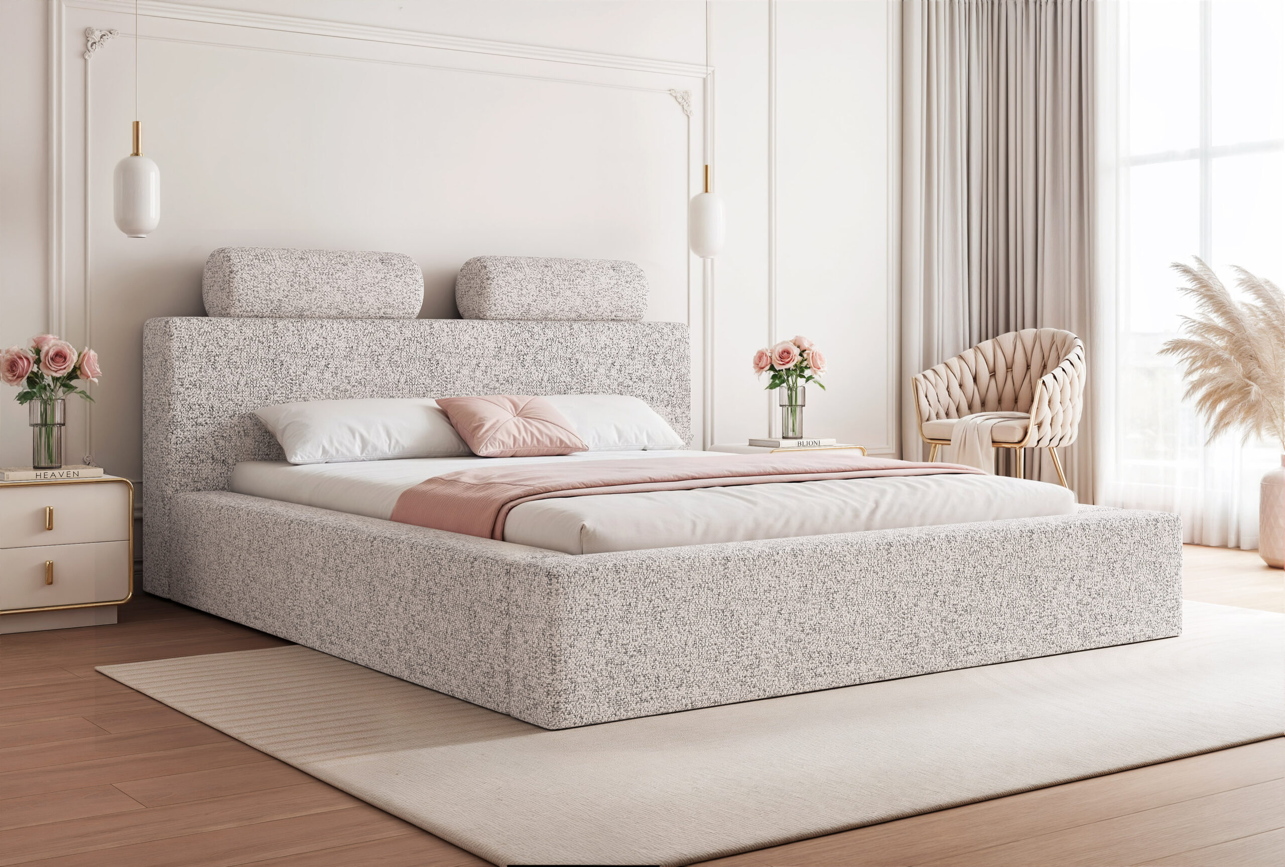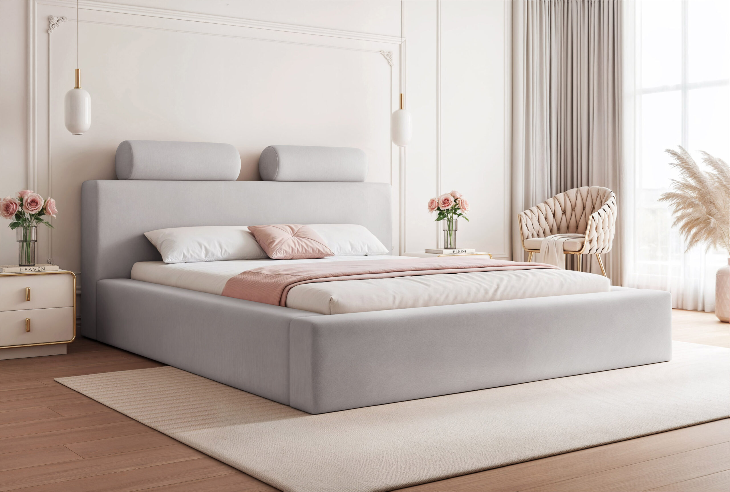 Łóżko tapicerowane Montaro z pojemnikiem na pościel to wyjątkowe połączenie minimalistycznego designu, nowoczesnej formy i maksymalnego komfortu użytkowania. Jego charakterystycznym elementem są miękkie wałkiumieszczone na szczycie zagłówka, które nadają łóżku niepowtarzalny wygląd i podkreślają jego nowoczesny styl. To model, który wprowadza do sypialni spokój, elegancję i subtelną przytulność.