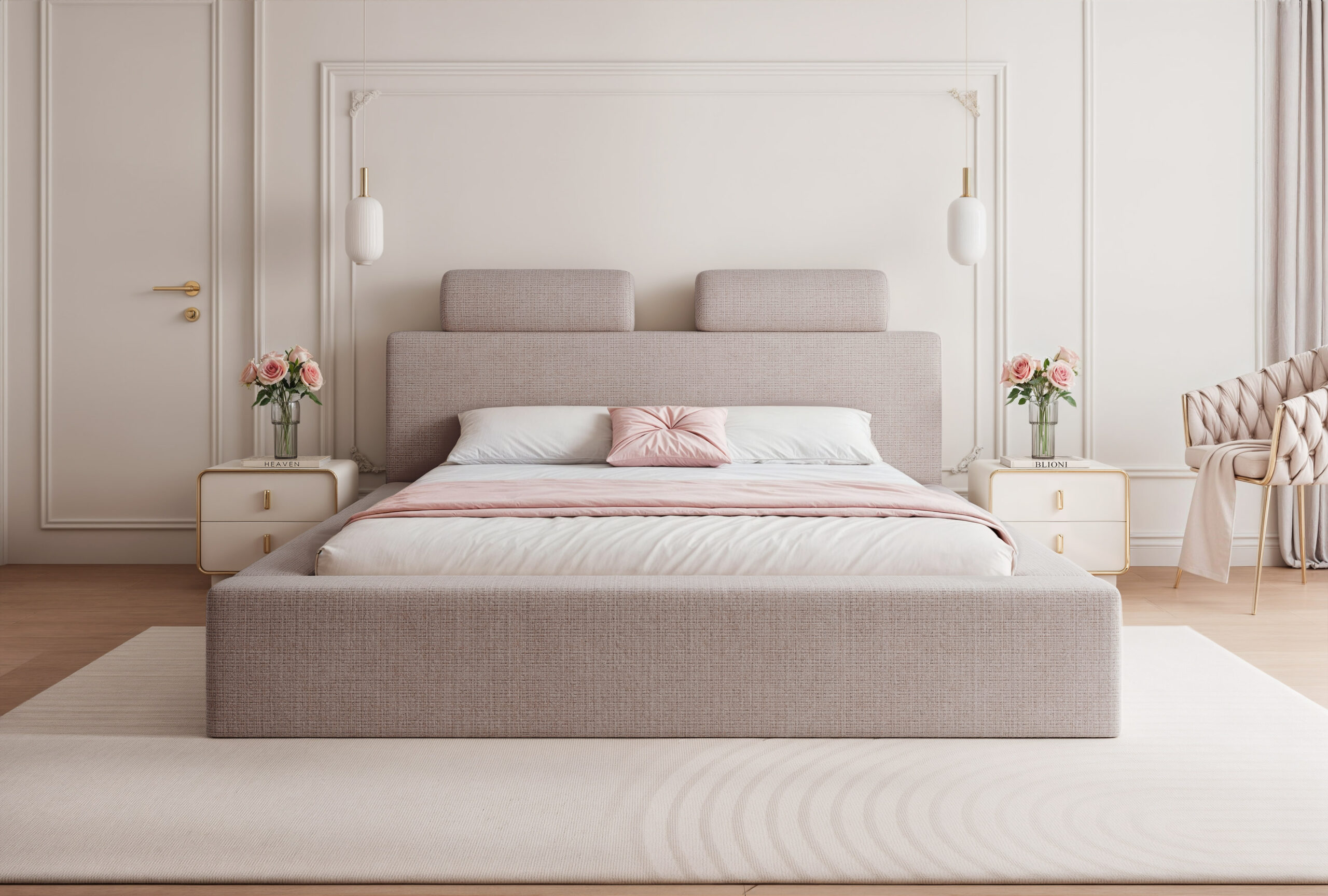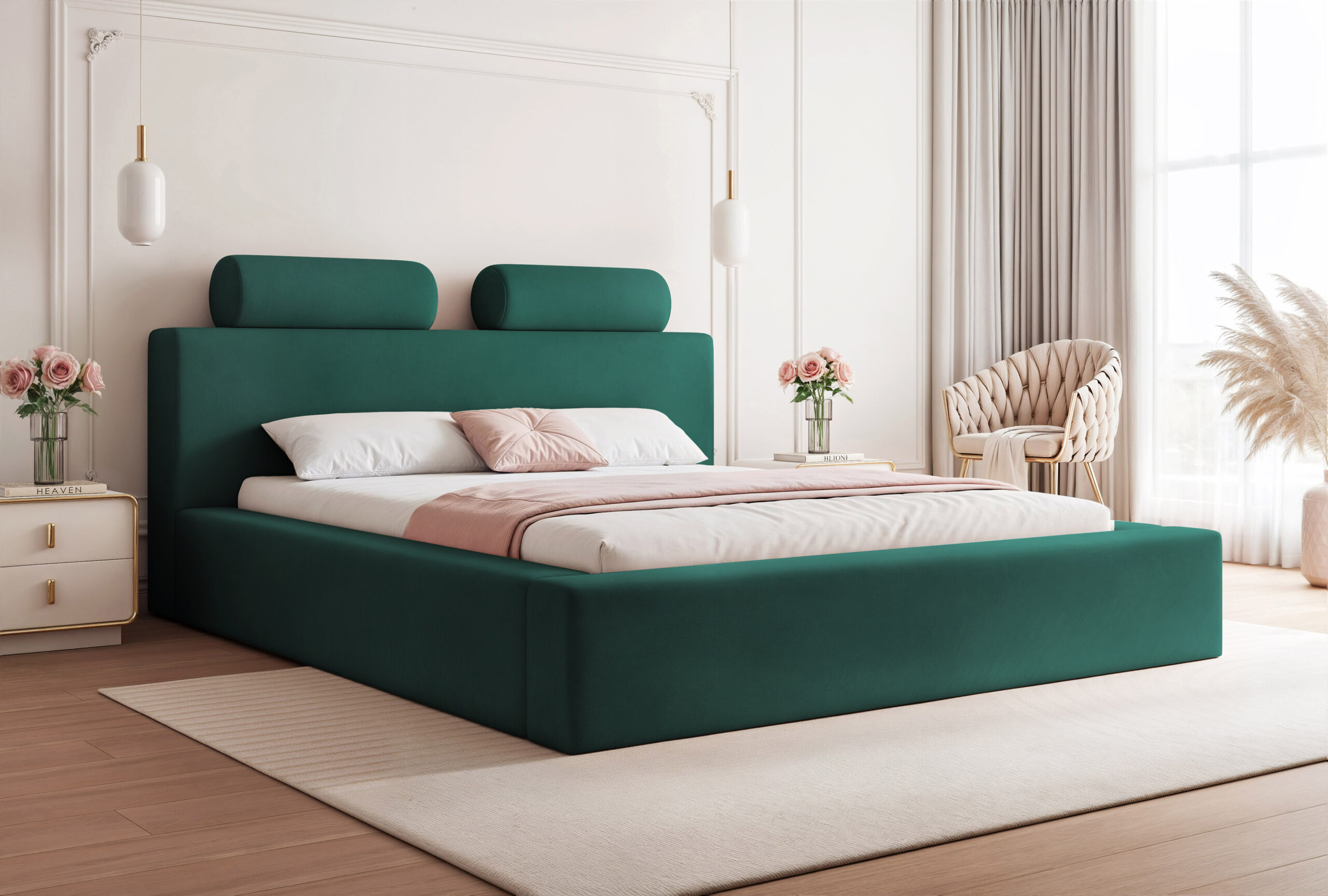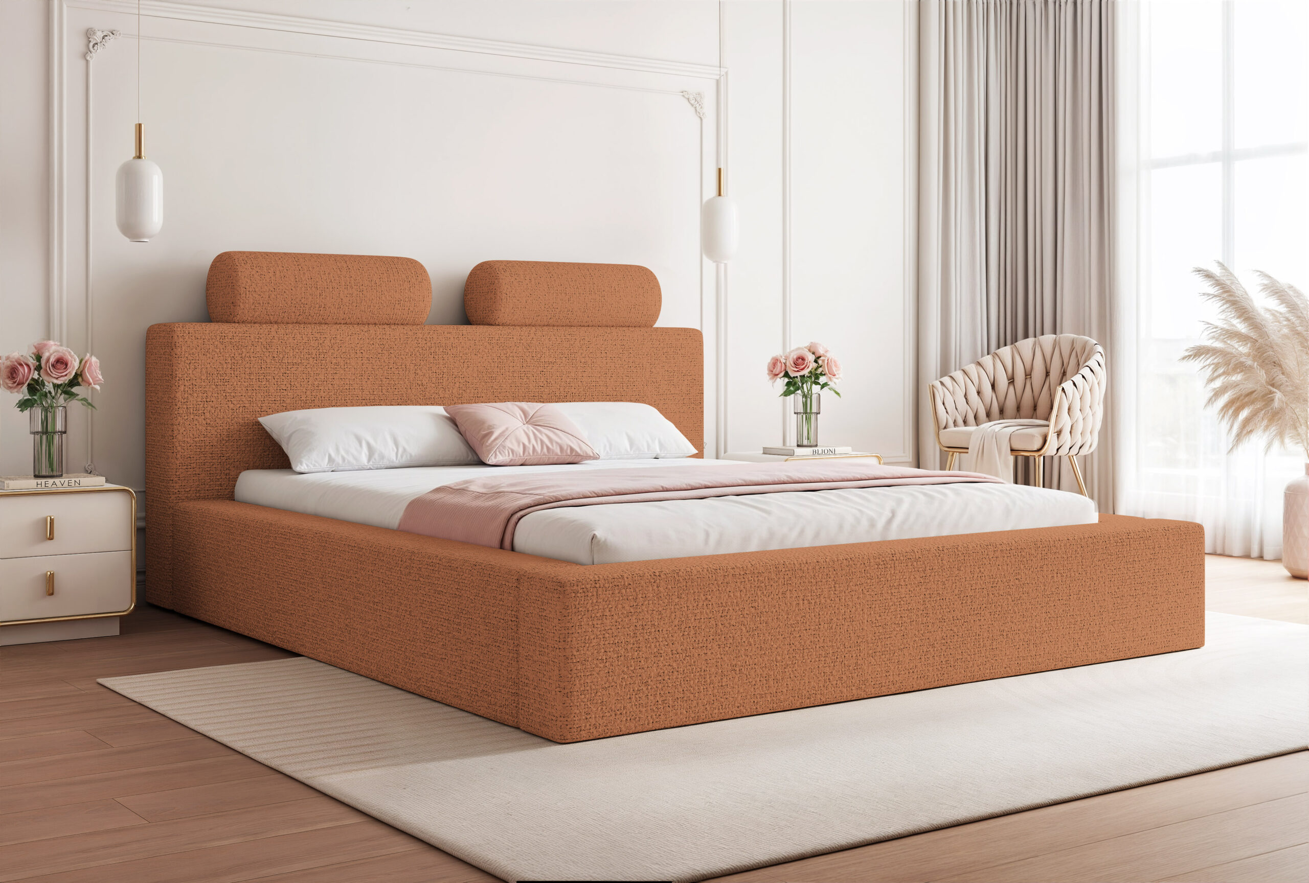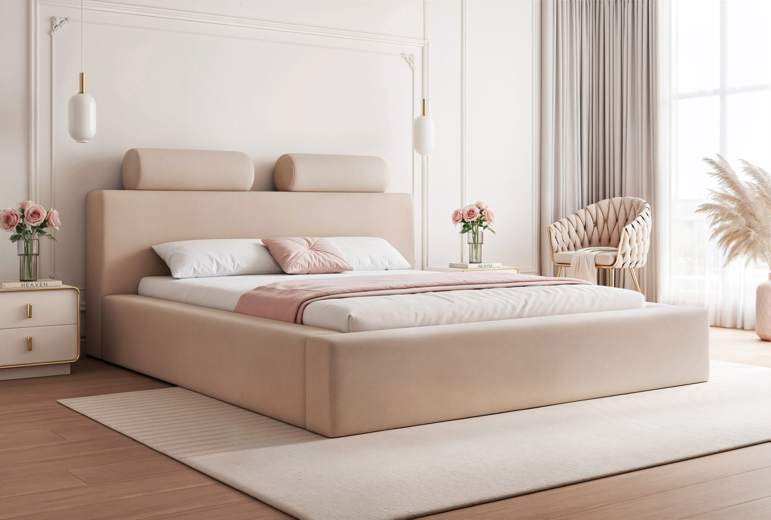 Łóżko tapicerowane Montaro z pojemnikiem na pościel to wyjątkowe połączenie minimalistycznego designu, nowoczesnej formy i maksymalnego komfortu użytkowania. Jego charakterystycznym elementem są miękkie wałkiumieszczone na szczycie zagłówka, które nadają łóżku niepowtarzalny wygląd i podkreślają jego nowoczesny styl. To model, który wprowadza do sypialni spokój, elegancję i subtelną przytulność.