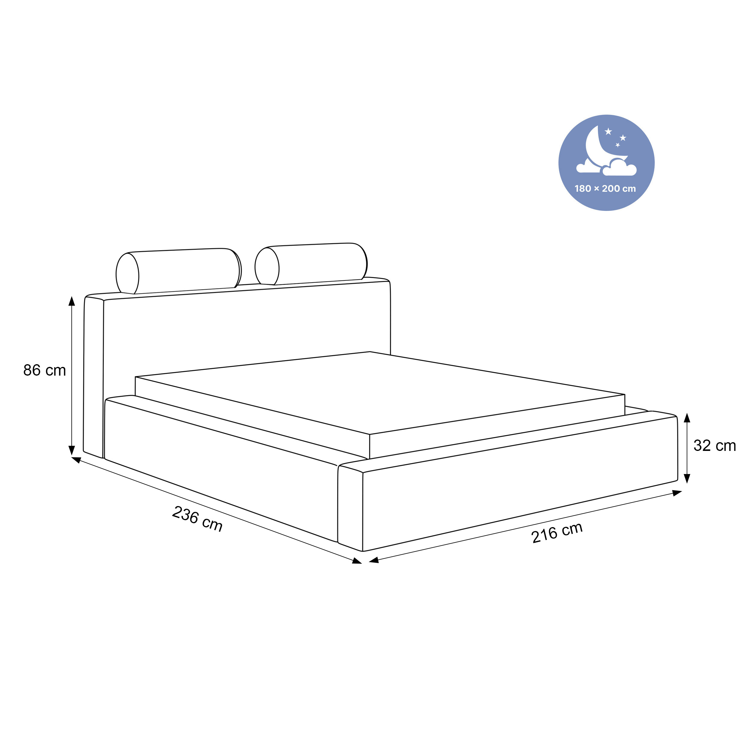 Szerokość całkowita: w zależności od rozmiaru + 35cm do powierzchni spania