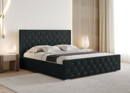 Całość uzupełniają nóżki ślizgowe, które zapewniają stabilność i elegancki wygląd mebla. Dzięki bogatej ofercie tkanin i kolorów, łóżko można idealnie dopasować do stylu sypialni — od klasycznego po nowoczesny.