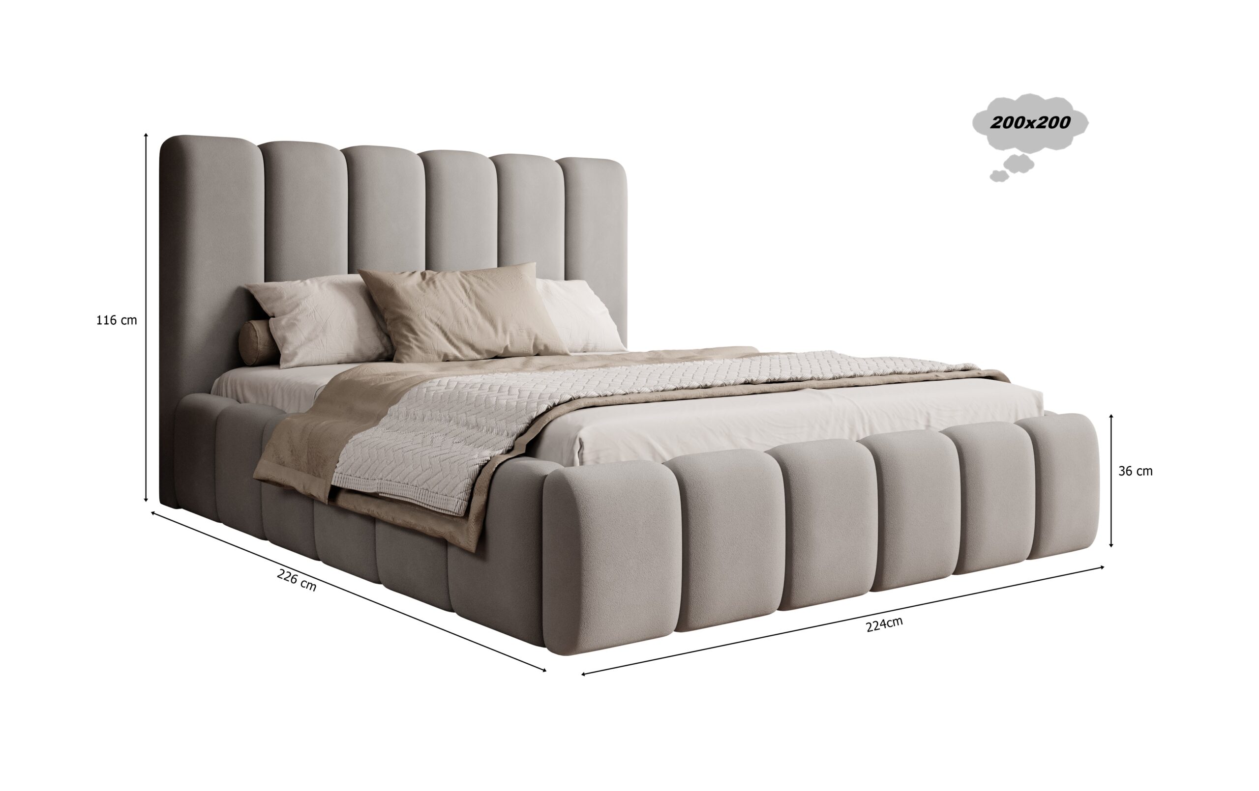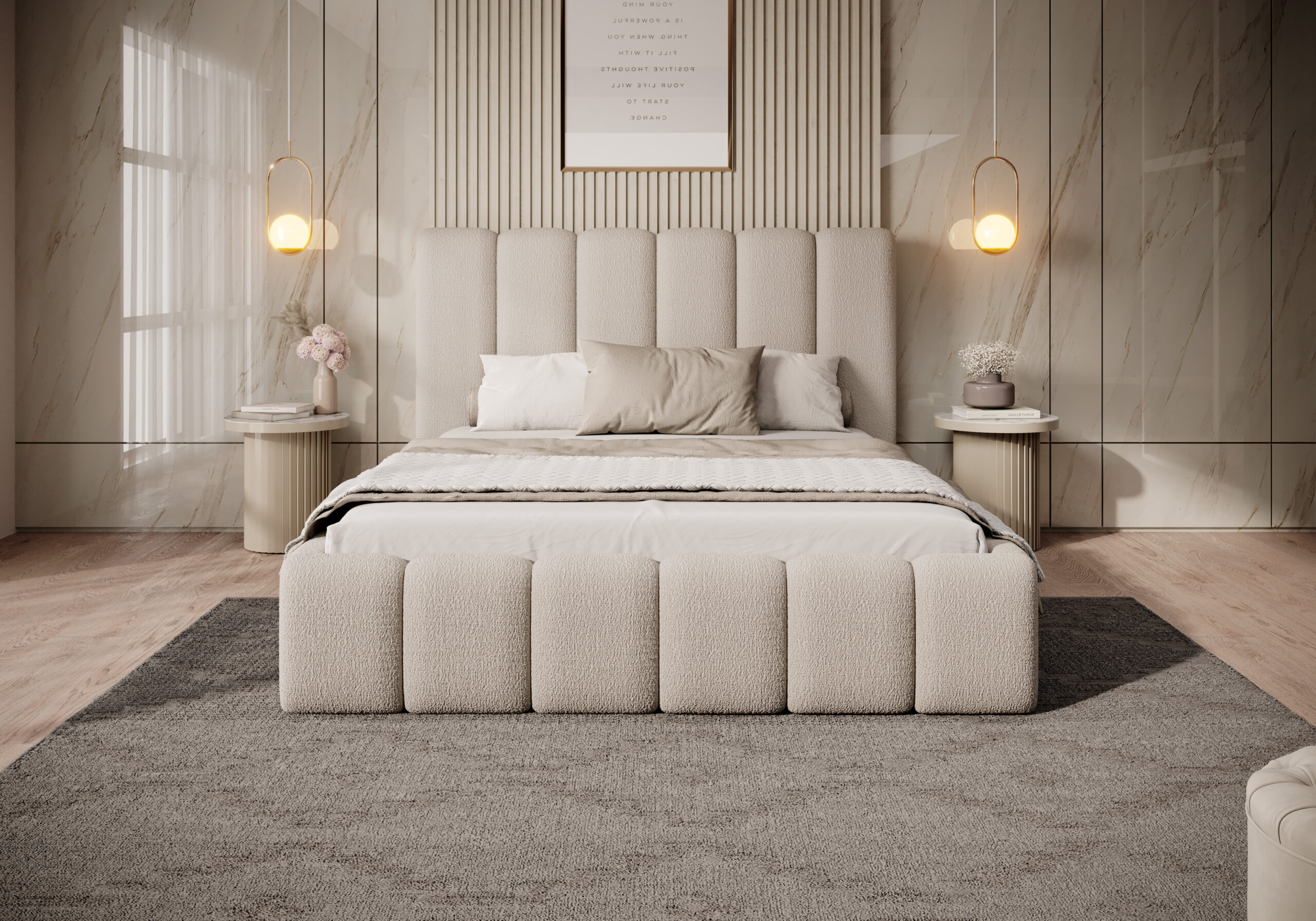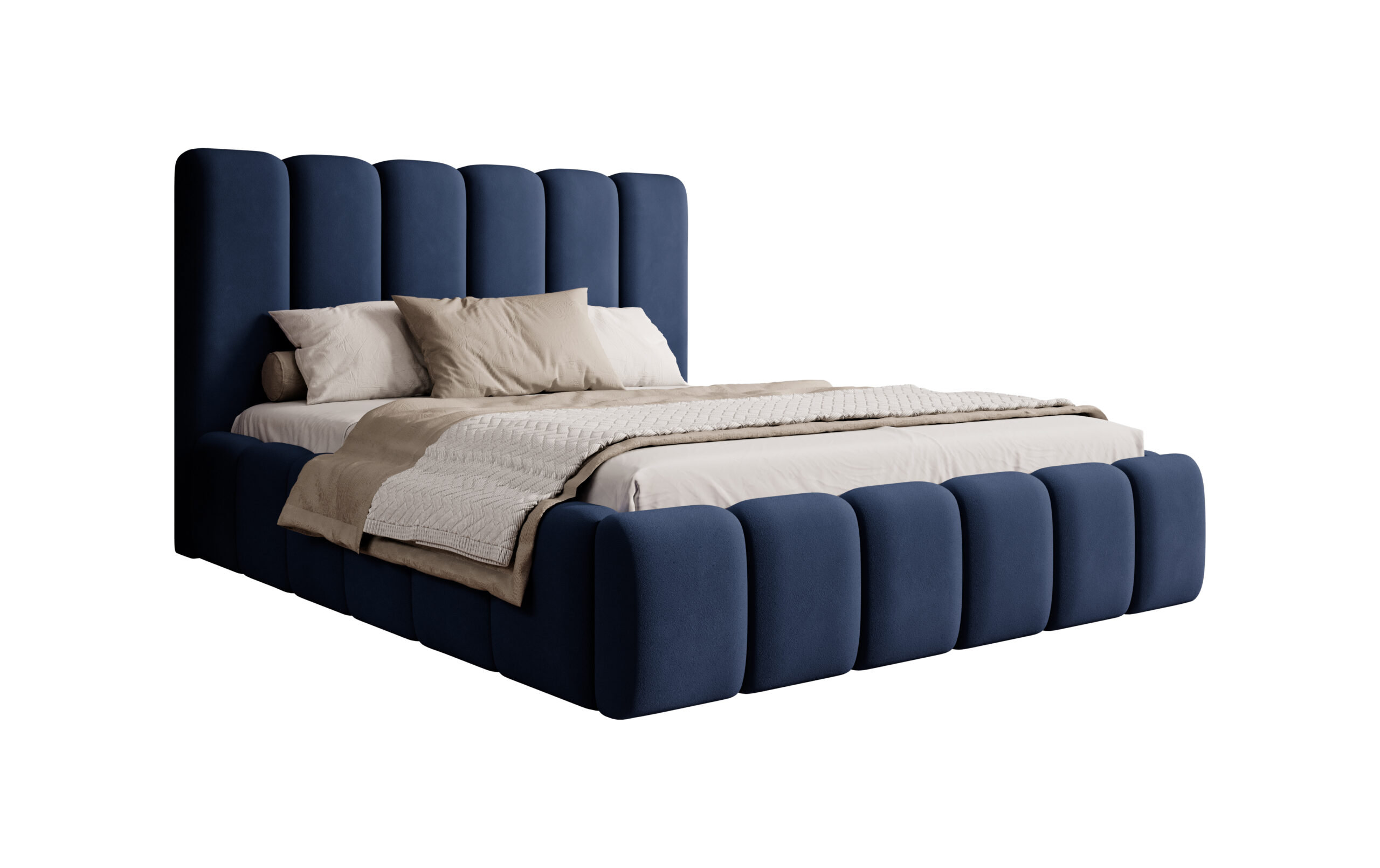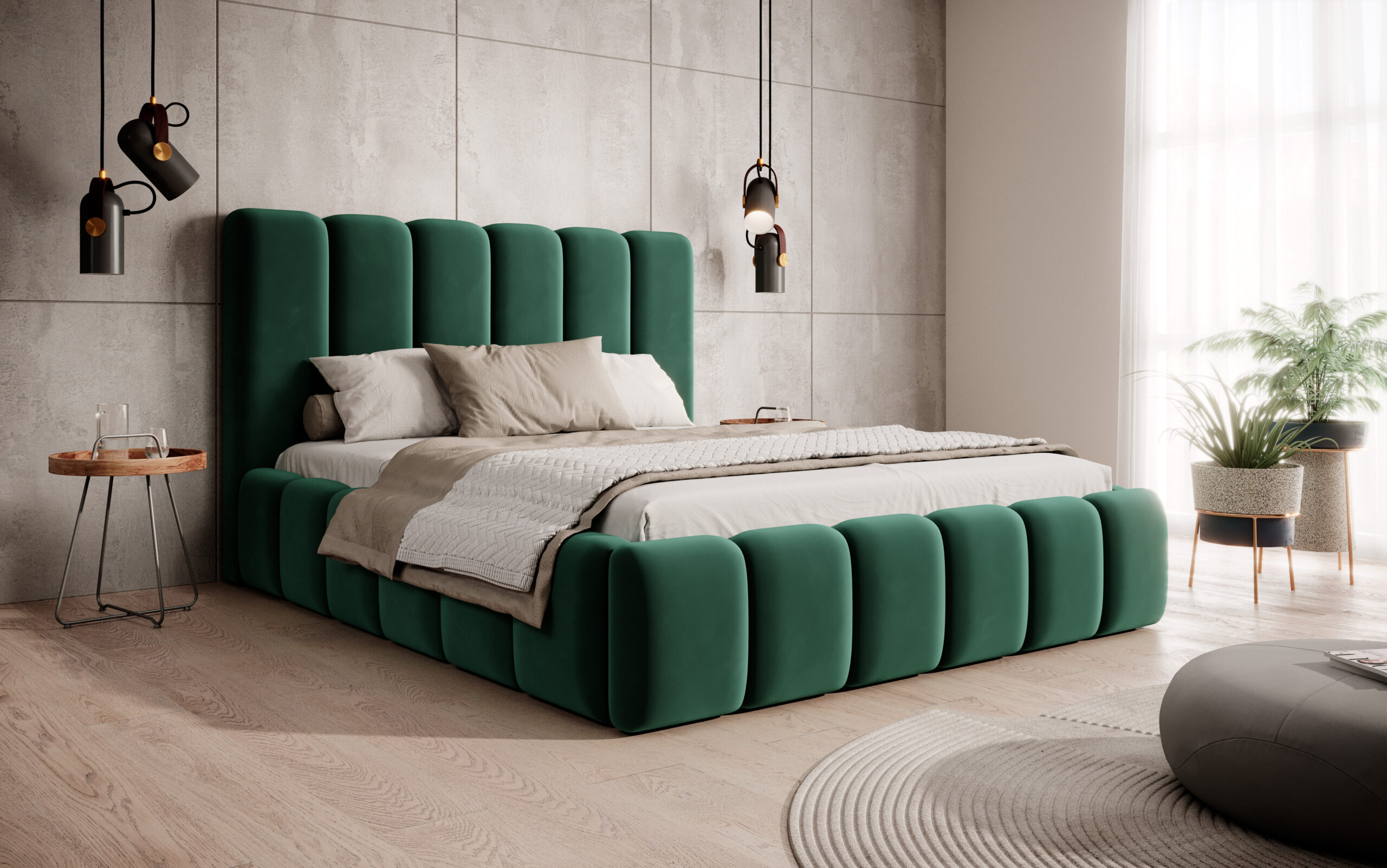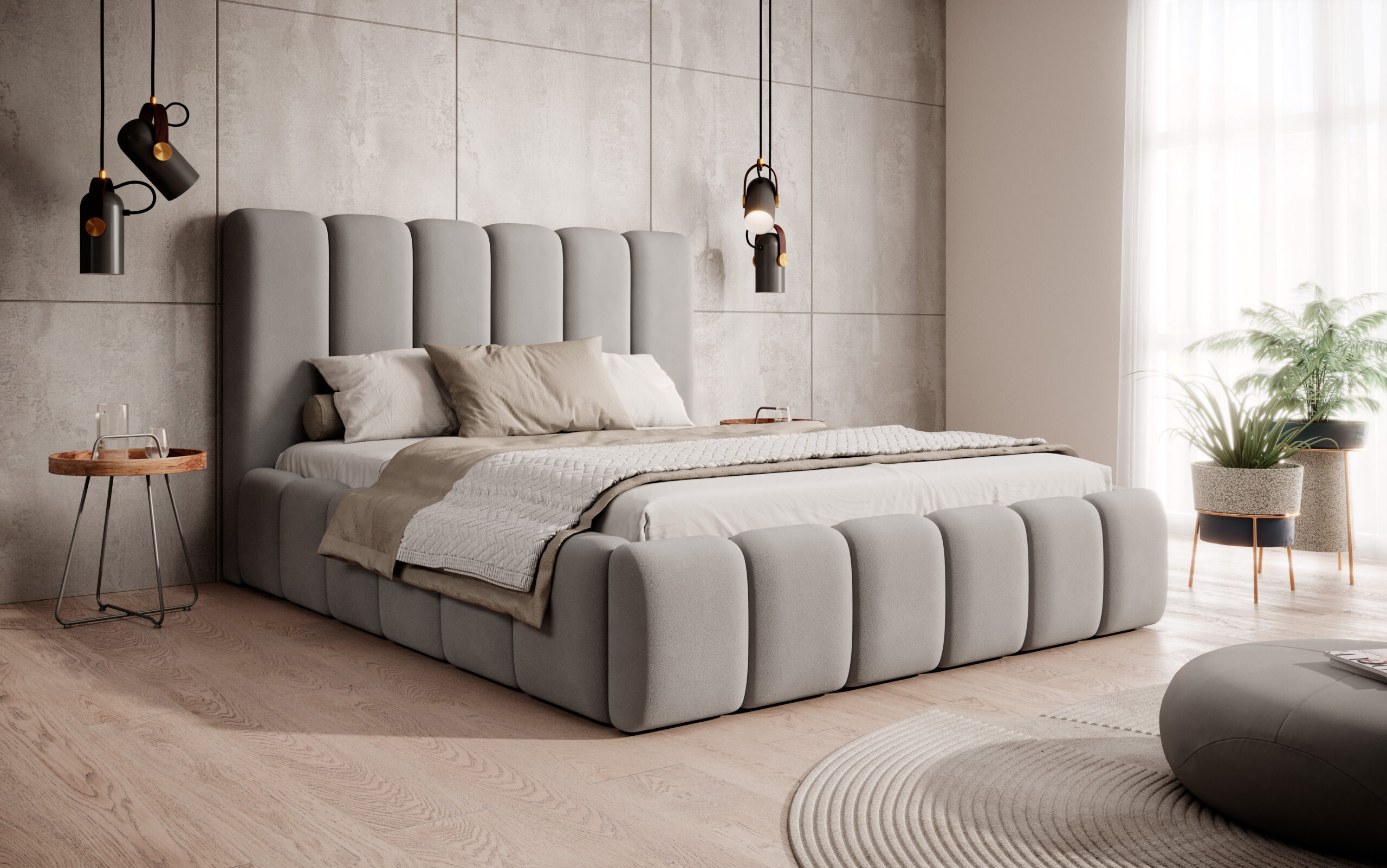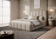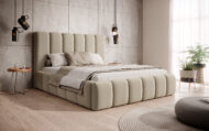 Łóżko tapicerowane Porto z pojemnikiem na pościel to połączenie elegancji, funkcjonalności i najwyższego komfortu. Wyróżnia się wysokim, miękkim wezgłowiem o opływowych kształtach, które nadaje wnętrzu przytulności i klasy. Regularne, pionowe przeszycia tworzą wyjątkowy efekt wizualny, dzięki czemu łóżko staje się ozdobą każdej sypialni — zarówno nowoczesnej, jak i w stylu glamour.