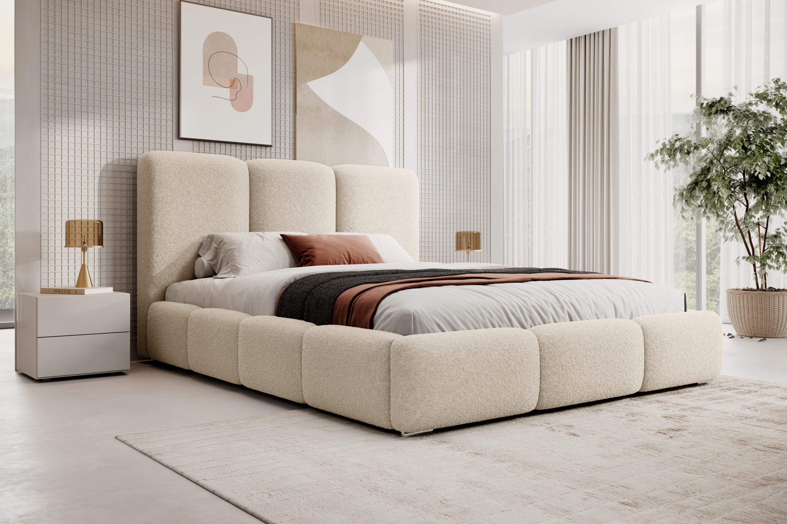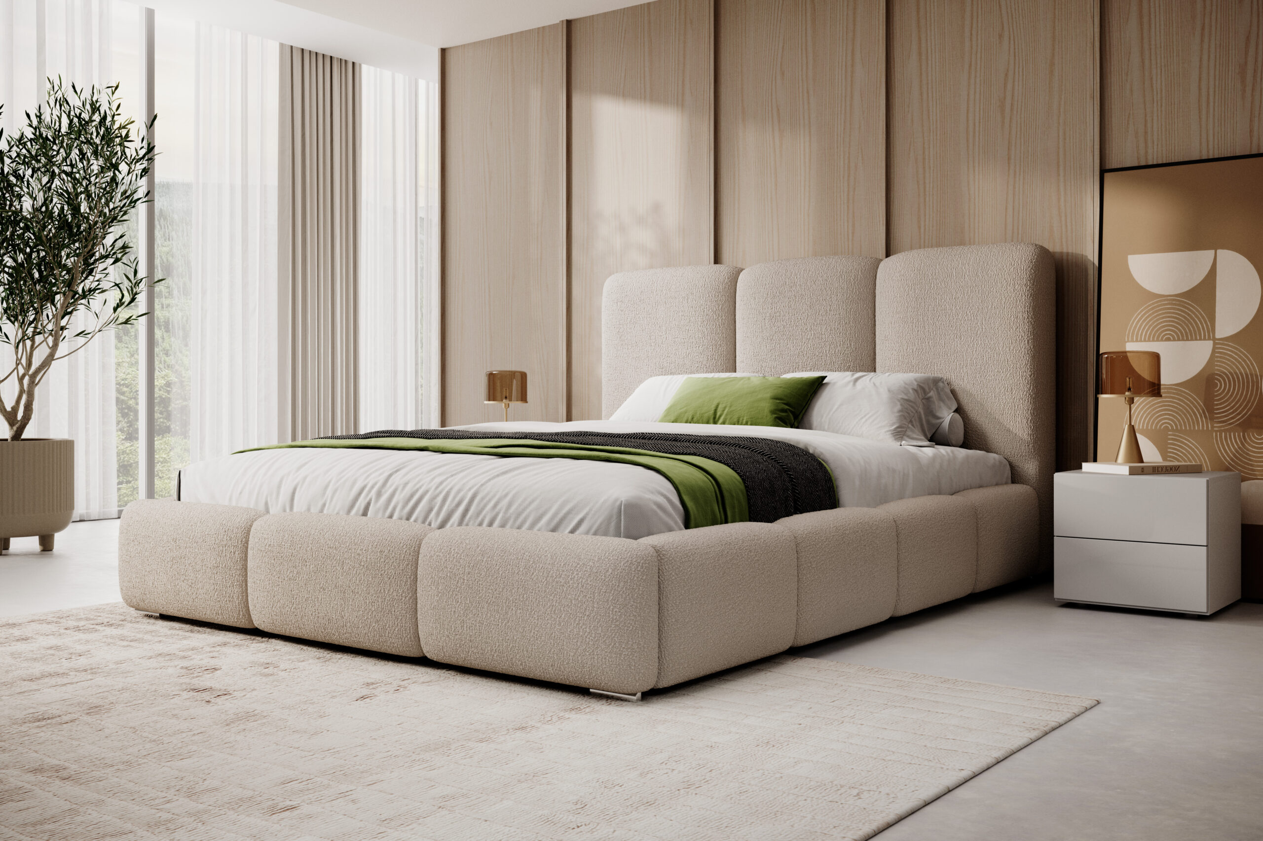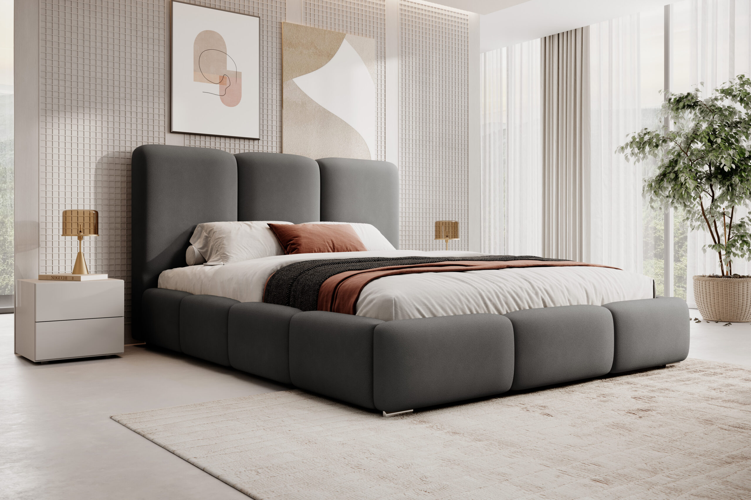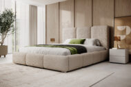 Łóżko tapicerowane Velmond z pojemnikiem na pościel to elegancka i nowoczesna propozycja dla osób, które cenią komfort, funkcjonalność i estetykę. Model wyróżnia się miękkim, wysokim zagłówkiem z pionowymi przeszyciami, które nadają mu przytulny, a jednocześnie ekskluzywny wygląd. Subtelne kształty i dopracowane detale sprawiają, że Velmond doskonale wpisuje się w aranżacje nowoczesne, klasyczne, loftowe i skandynawskie.