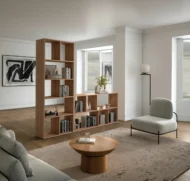 Otwarta forma mebla sprawia, że wnętrze pozostaje lekkie wizualnie, a pomieszczenie nie jest przytłoczone dużą bryłą. Dzięki temu regał doskonale sprawdzi się również w mniejszych pomieszczeniach.