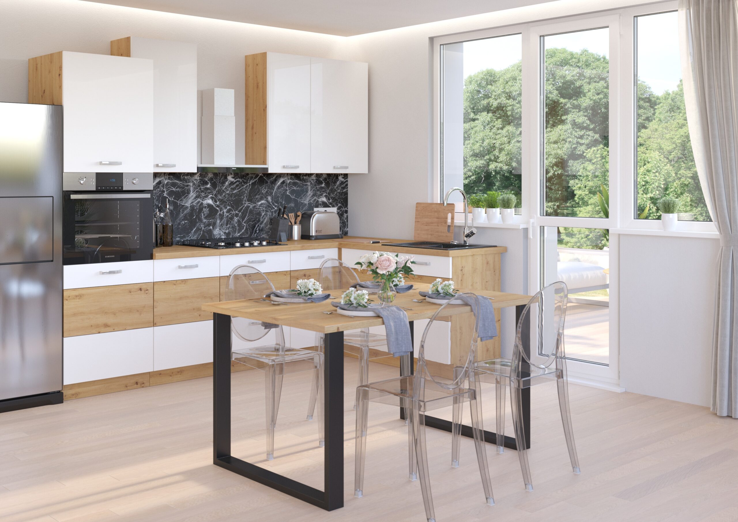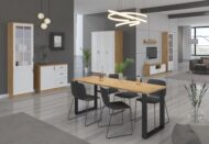 • Wyrazisty loftowy design – czarne, stalowe płozy i gruby blat tworzą nowoczesny akcent w salonie i kuchni.