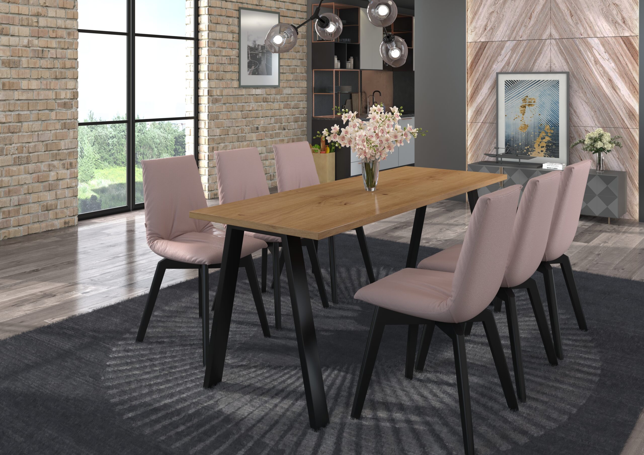 • Loftowy charakter – czarne nogi w macie + ciepłe dekory drewna.