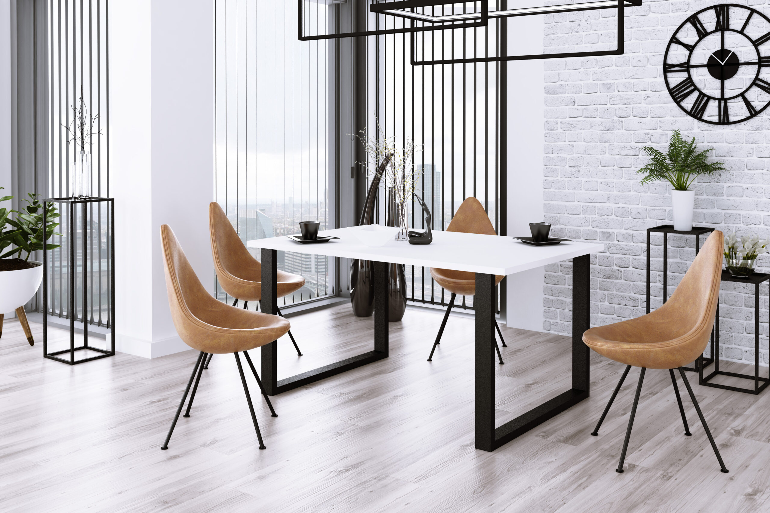 Ponadczasowy loft – prosty, industrialny design świetnie łączy się z tkaninowymi krzesłami, metalem i drewnem.
