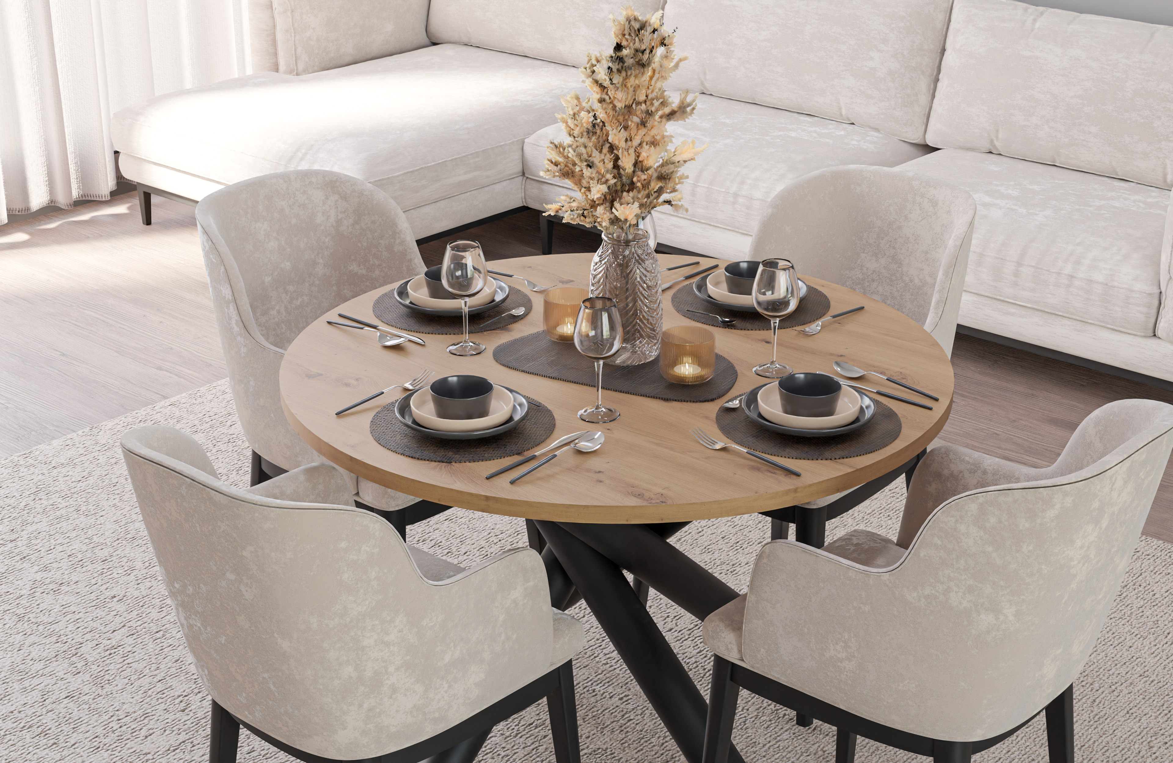 Elegancki, kompaktowy i zawsze „na czasie”. OSLO Ø110 to okrągły stół do jadalni lub salonu, który łączy skandynijski minimalizm z mocnym akcentem nowoczesnej podstawy w kształcie krzyżaka (X). Średnica 110 cm zapewnia swobodę dla 4 osób (przy okazji wygodnie posadzisz 5–6).