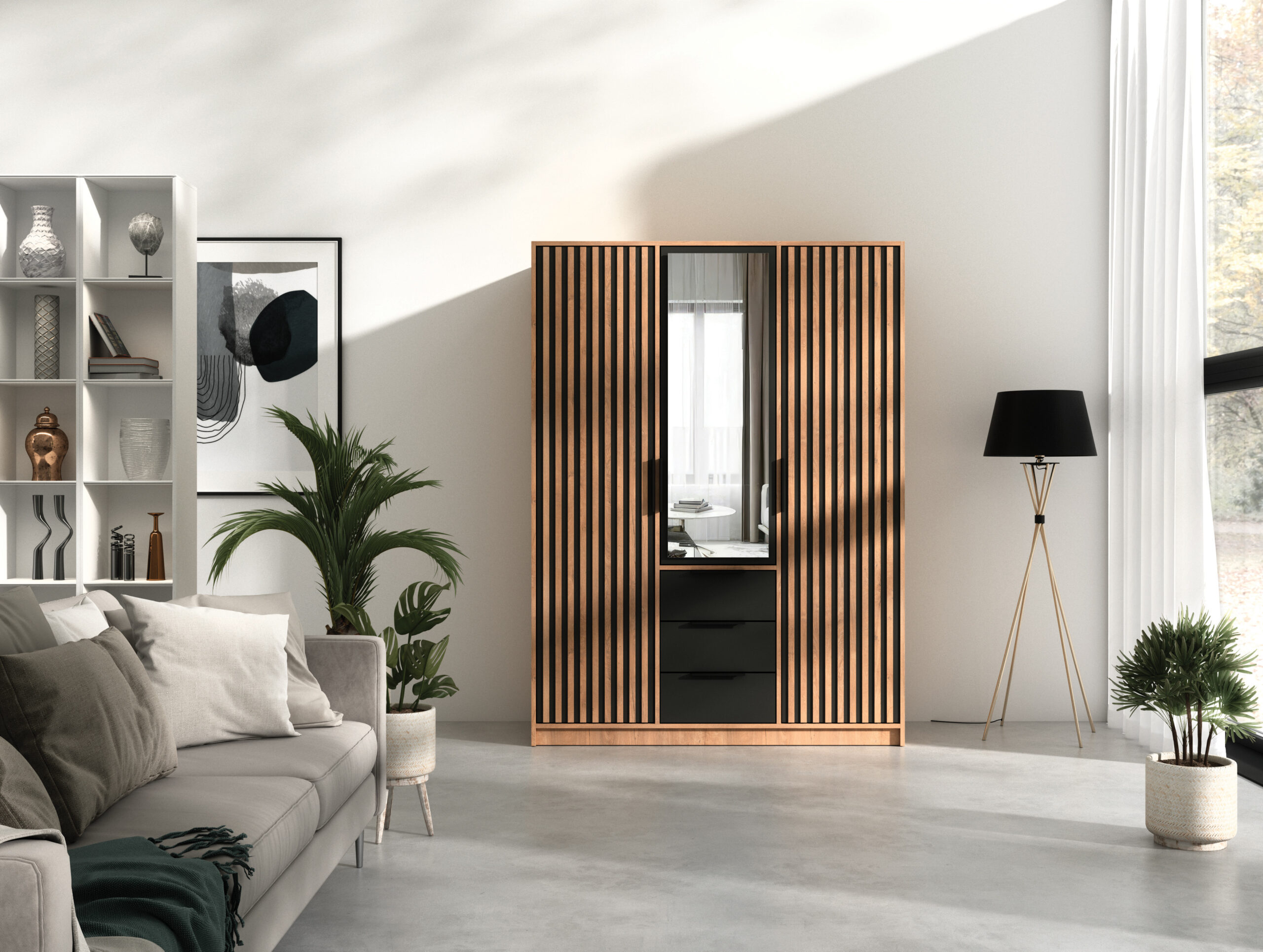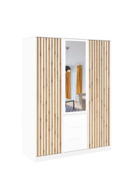 Szukasz efektownej szafy, która łączy modne lamele, praktyczne lustro i pojemne szuflady? BALI LUX D3 to elegancka, uchylna szafa o szerokości 149 cm, zaprojektowana z myślą o nowoczesnych sypialniach, garderobach i przedpokojach. Smukłe, pionowe lamele po bokach ocieplają wnętrze, a centralne lustro optycznie je powiększa i rozświetla. Na froncie znajdziesz także trzy zewnętrzne szuflady – zawsze pod ręką na bieliznę i drobiazgi.