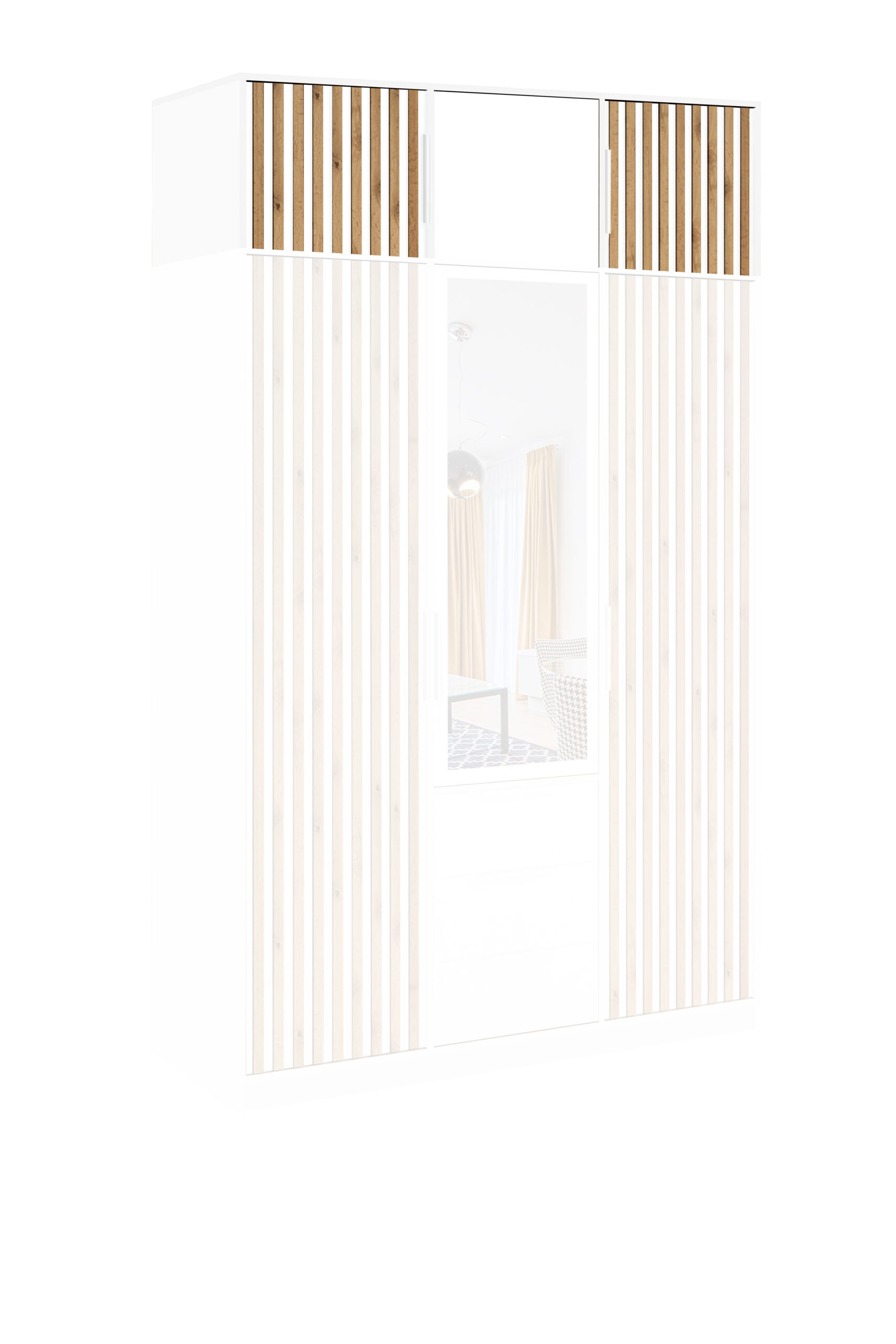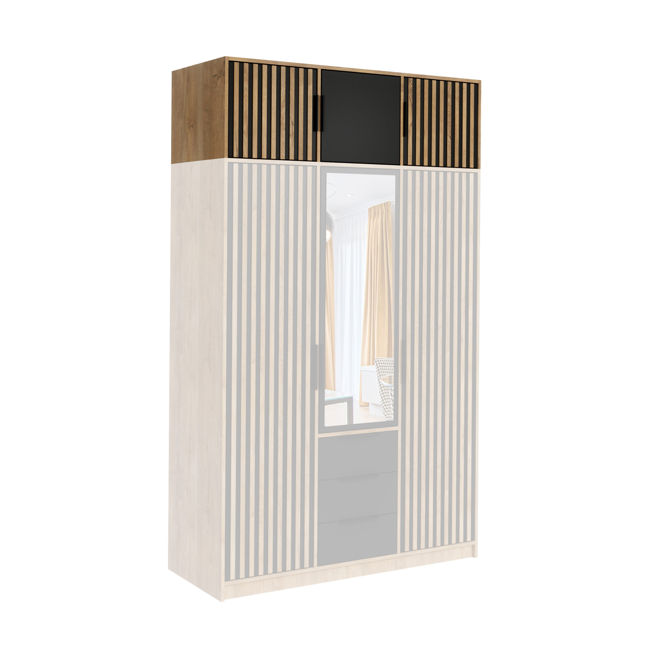 Chcesz więcej miejsca, ale nie masz przestrzeni na szerszą szafę? Wybierz w opcjach „z nadstawką”. Dopasowana BALI LUX D3 extension (45 cm wysokości) montuje się równo z bryłą szafy – zwiększa pojemność, nie zmieniając zajmowanego metrażu i zachowując spójny wygląd frontu z lamelami oraz lustrem. Jeśli nie potrzebujesz dodatkowej przestrzeni, wybierz wariant „bez nadstawki”.