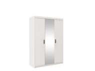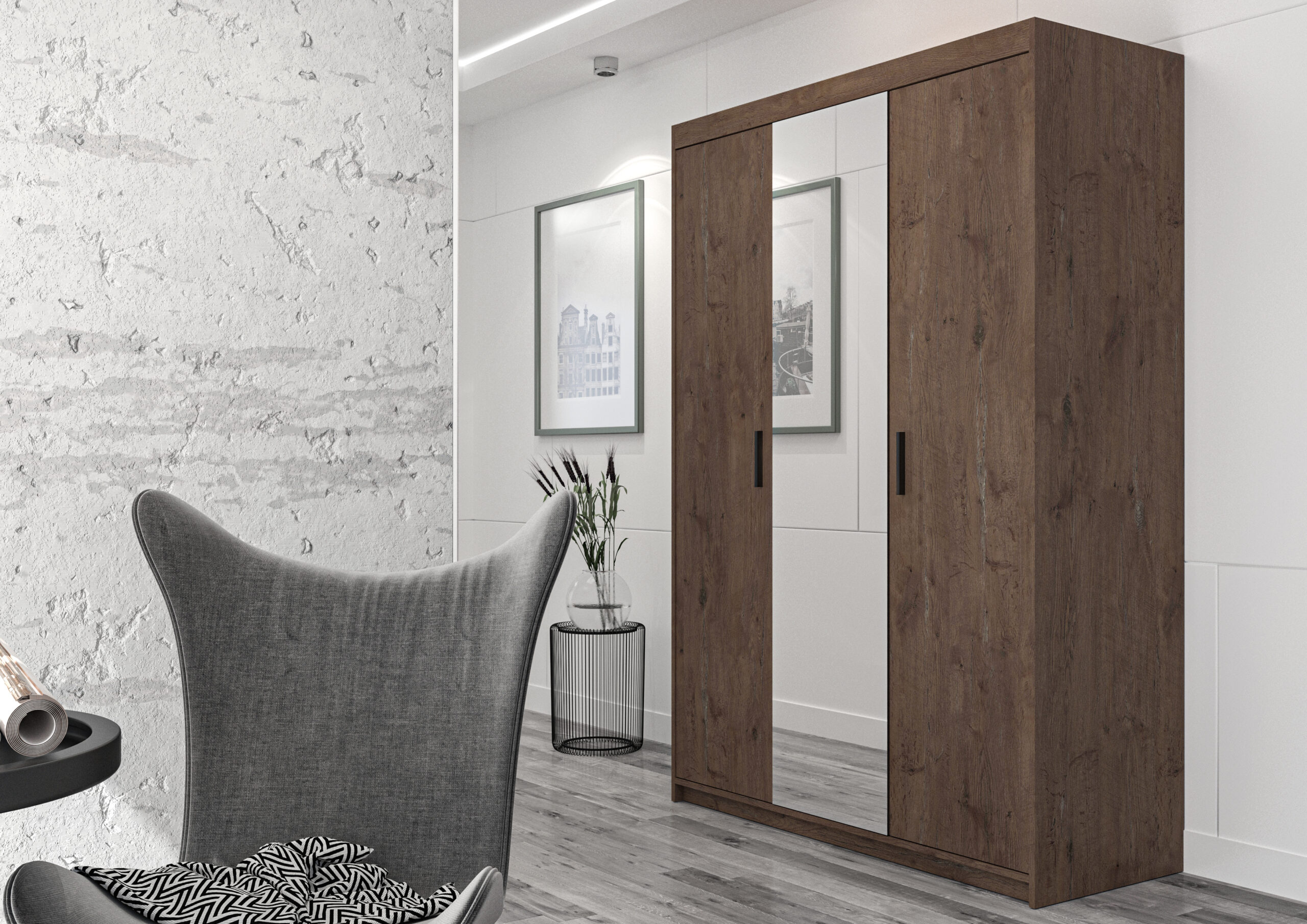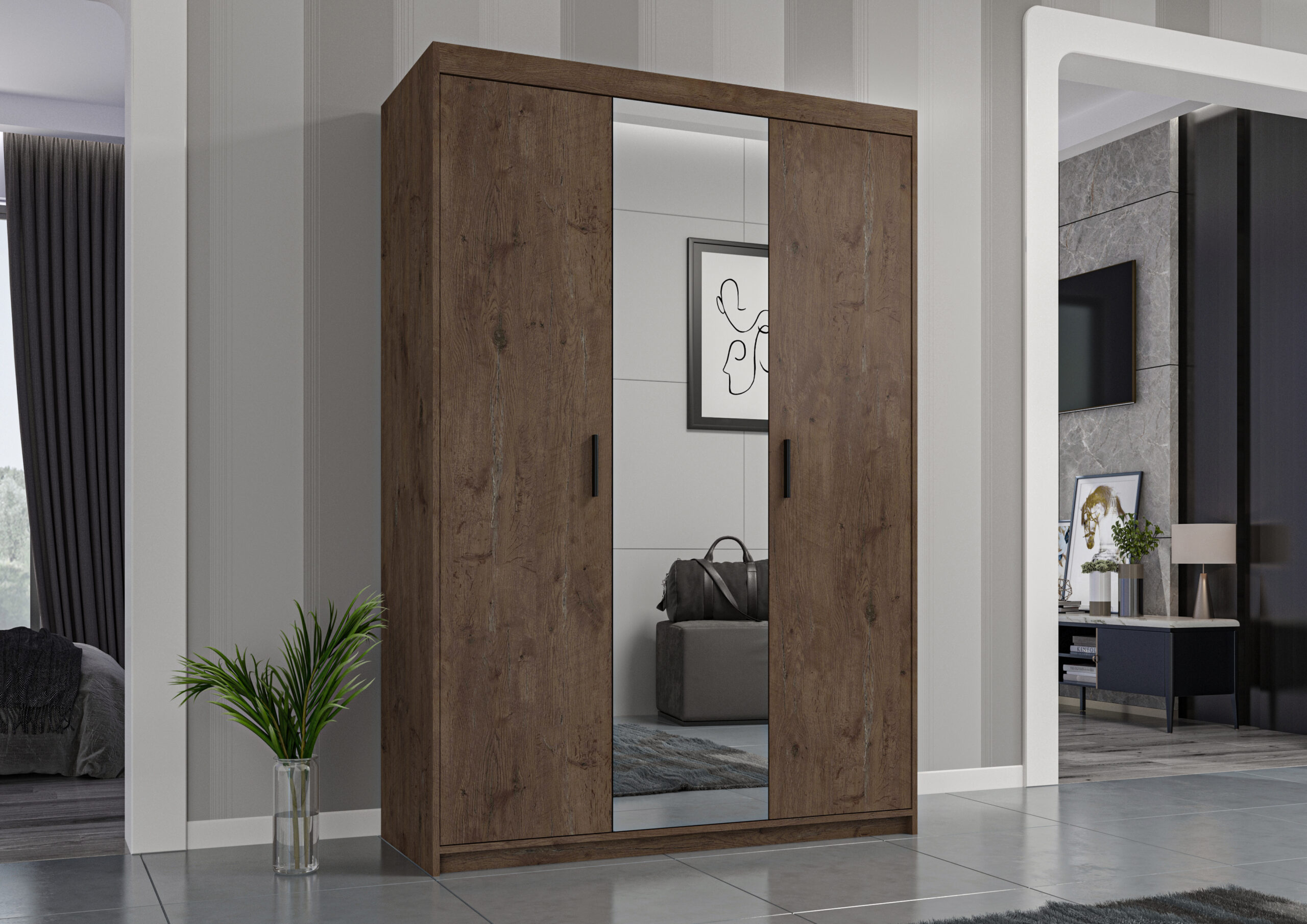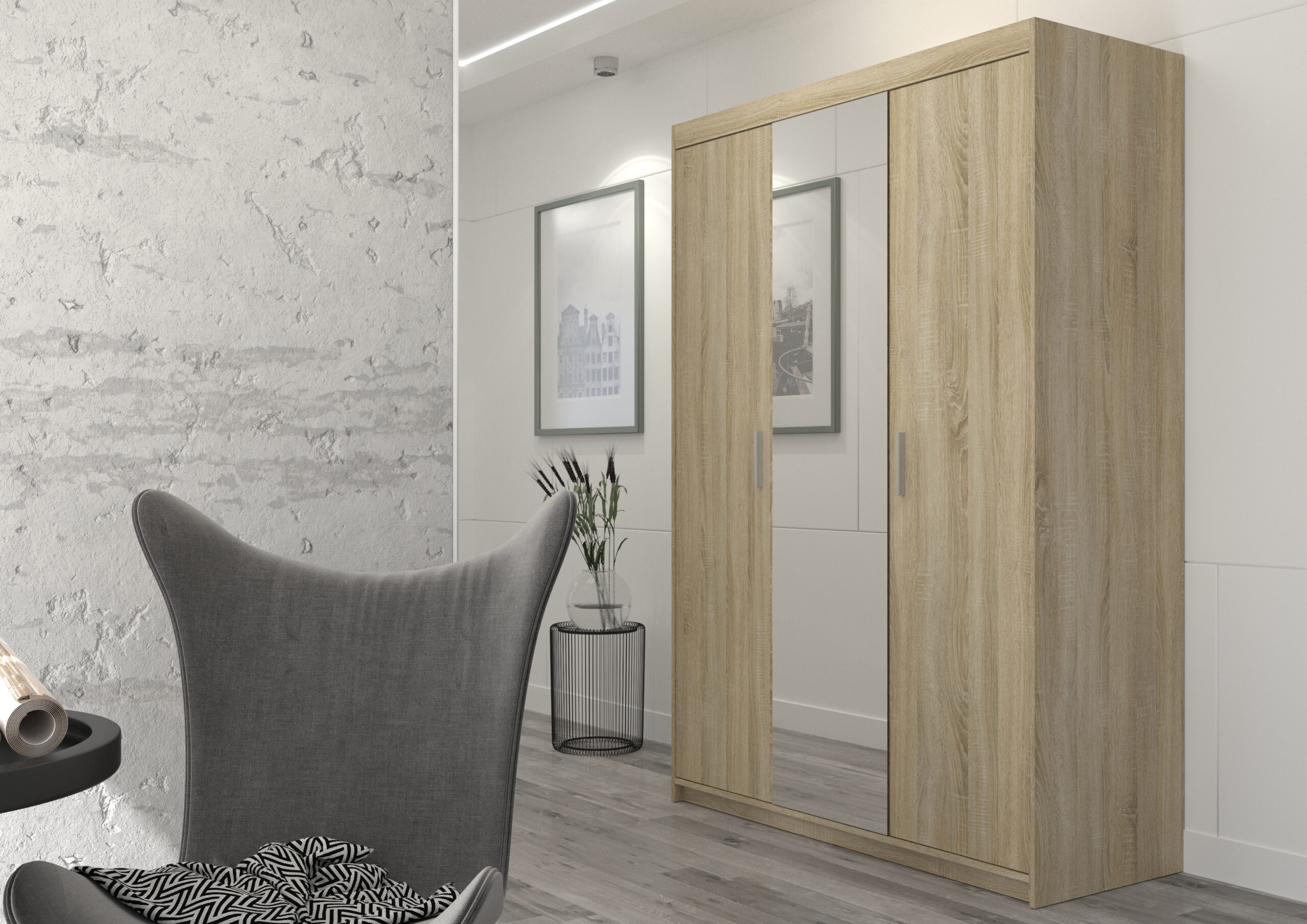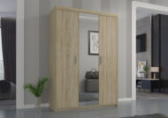 Elegancka szafa trzydrzwiowa ELENA 3D z lustrem łączy maksimum pojemności z lekkim, nowoczesnym wyglądem. Duże lustro na środkowym froncie optycznie powiększa pomieszczenie i doświetla wnętrze, a praktyczny układ półek + drążek ułatwia utrzymanie porządku na co dzień.
