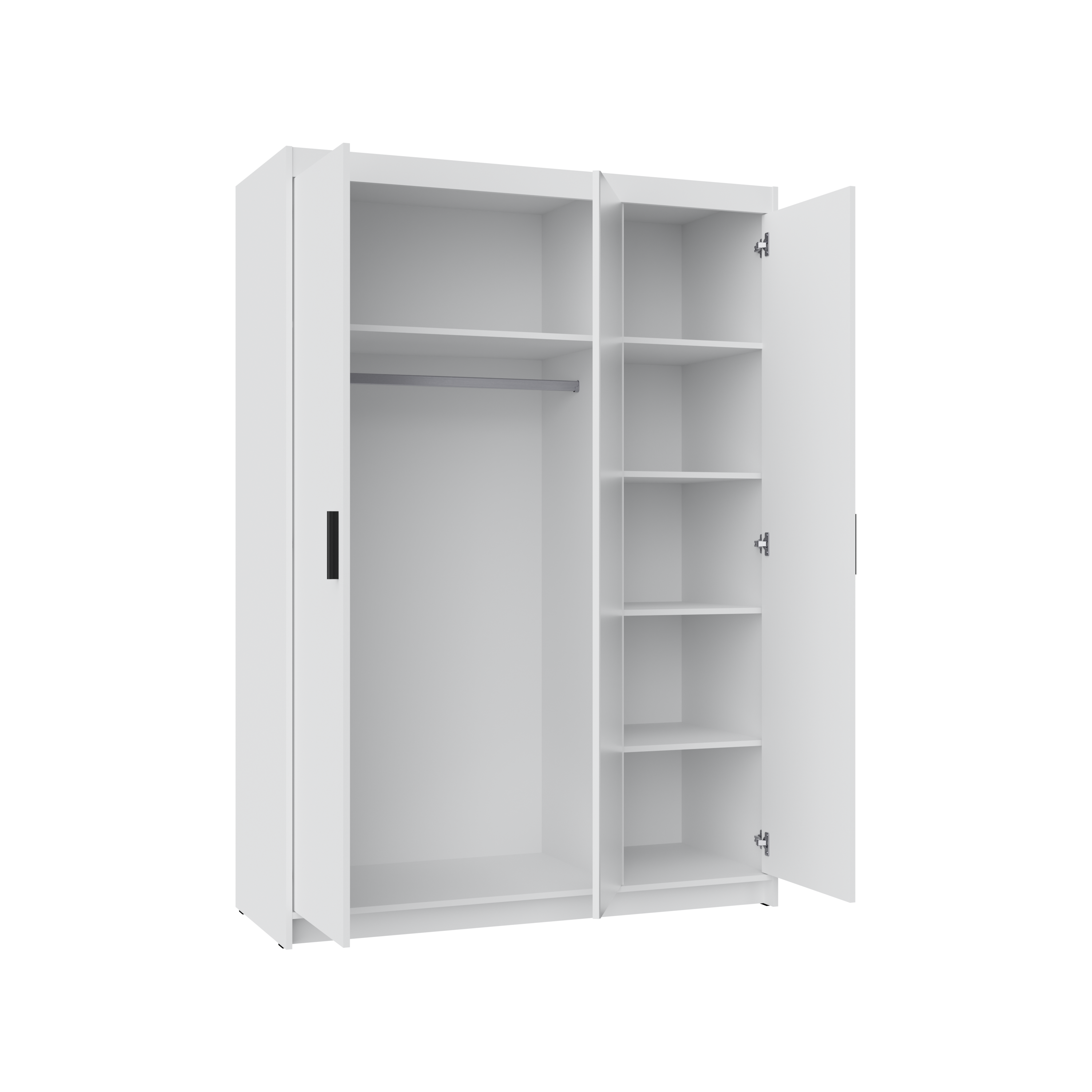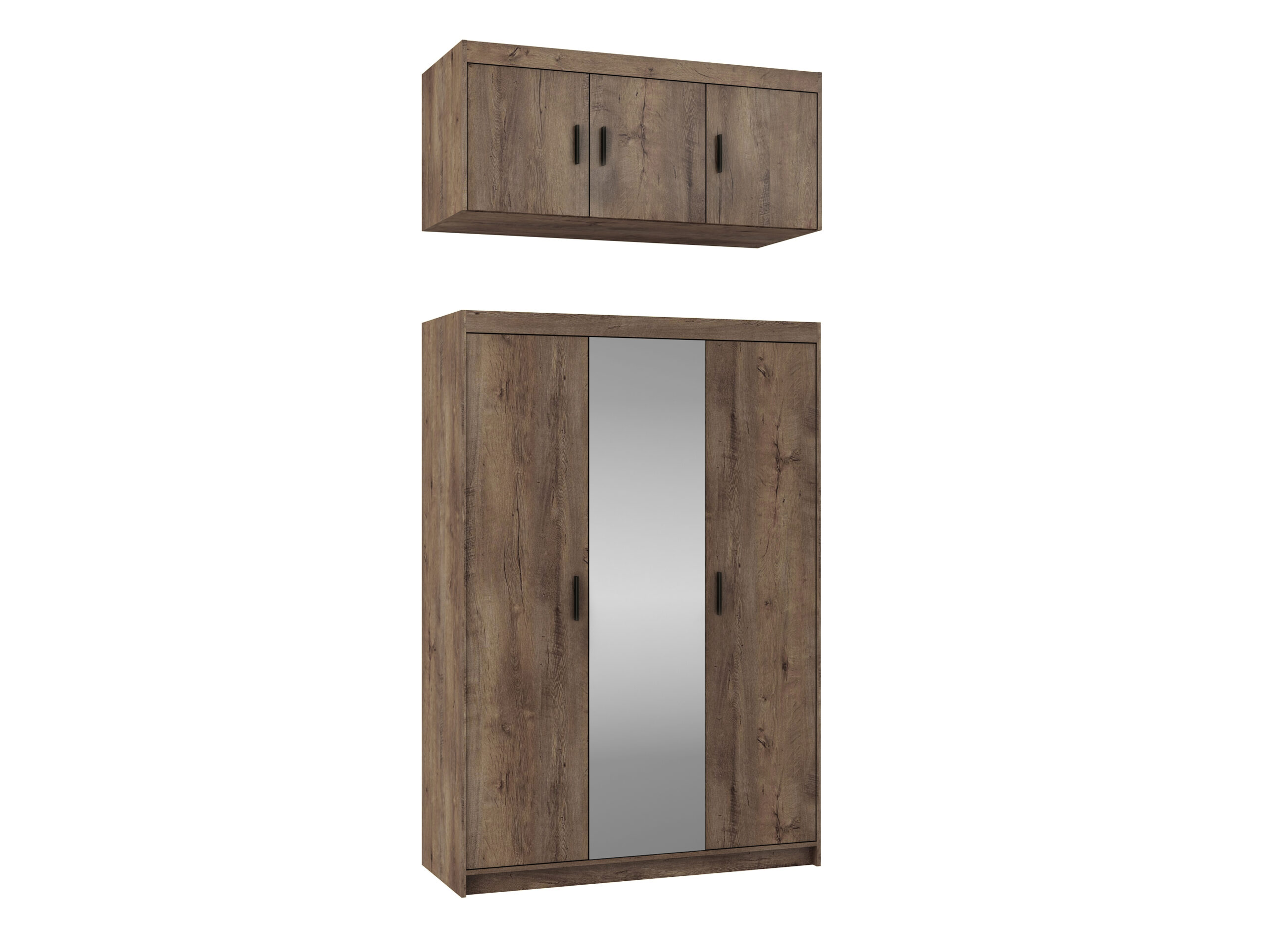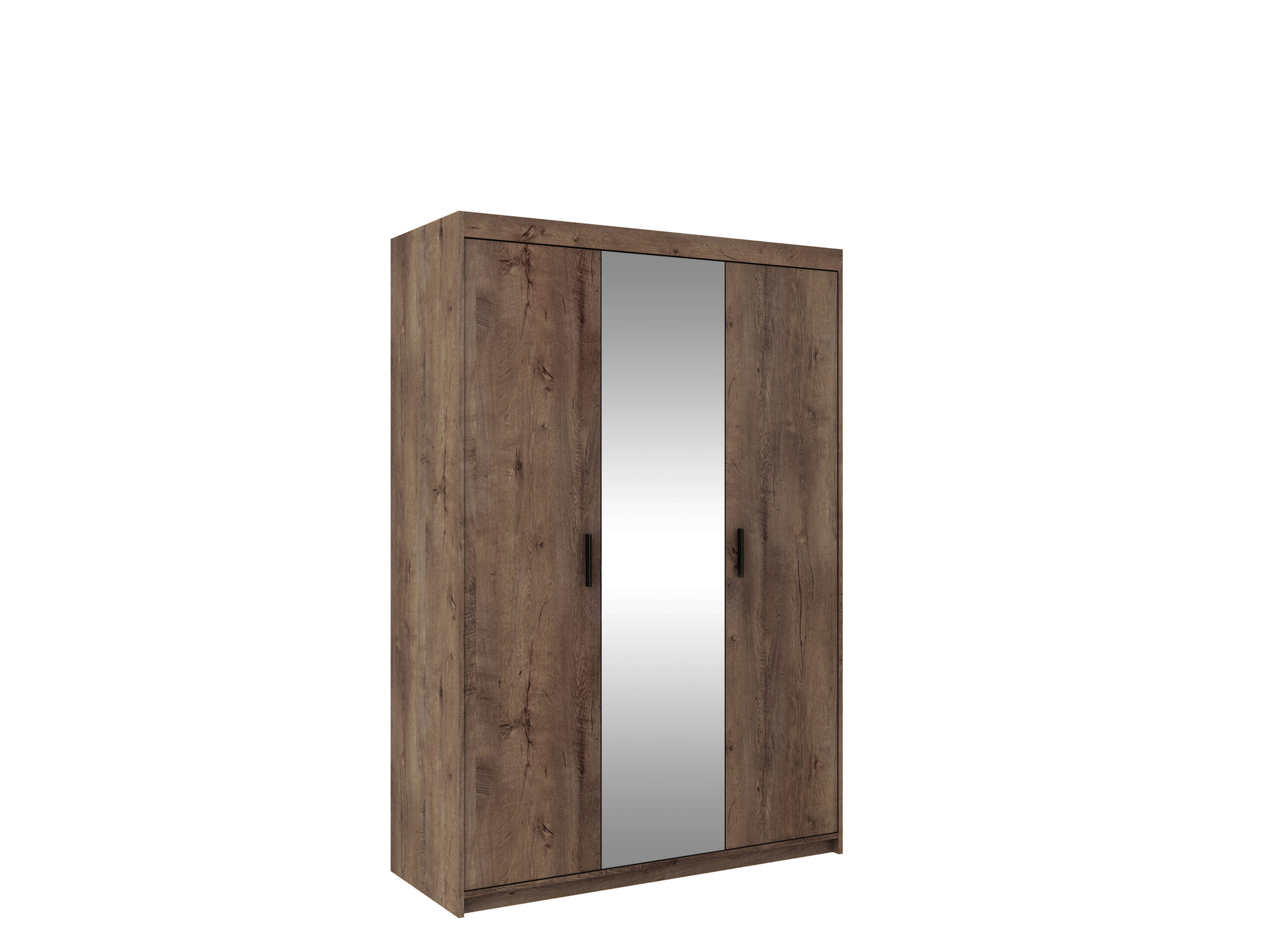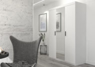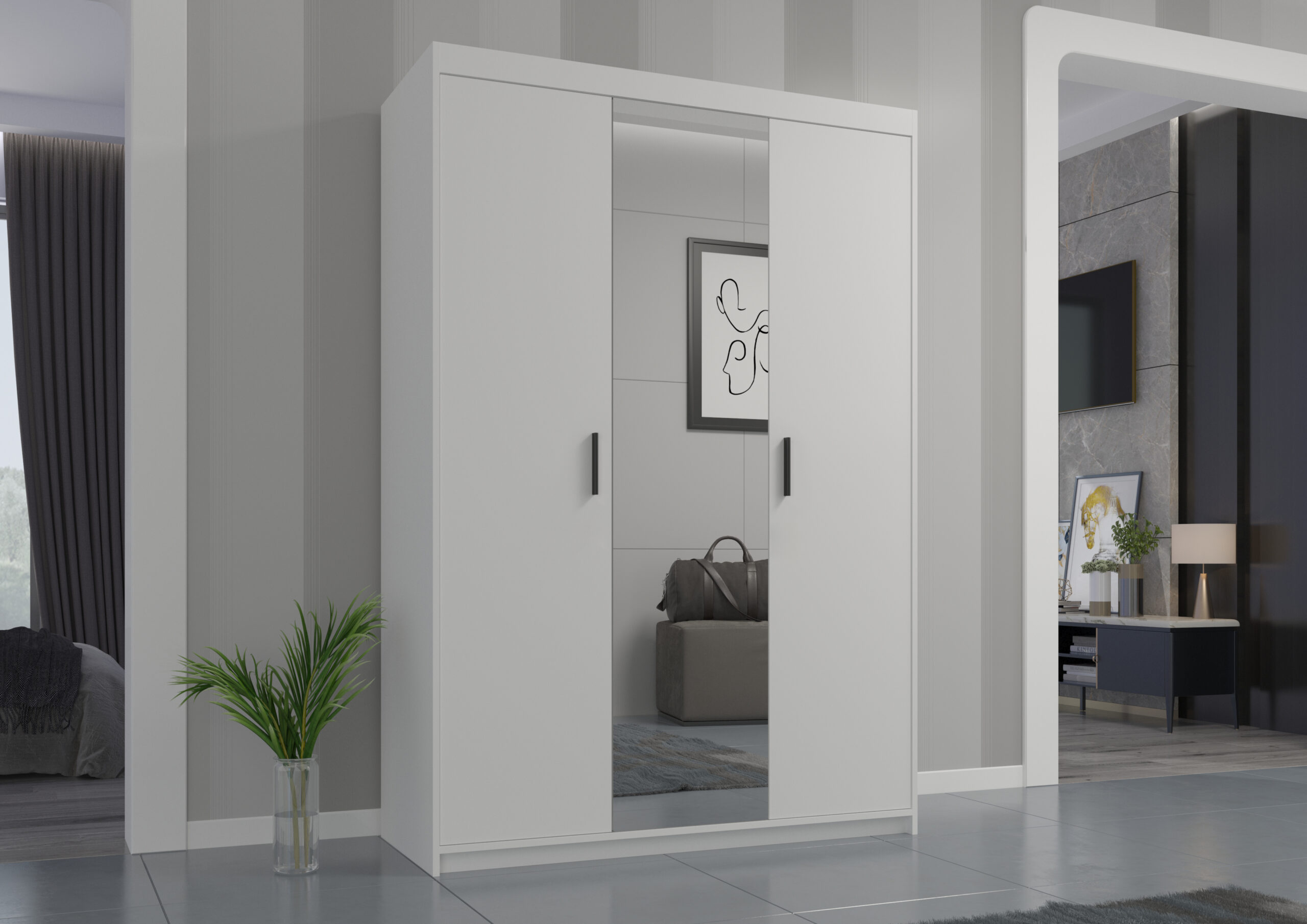 Elegancka szafa trzydrzwiowa ELENA 3D z lustrem łączy maksimum pojemności z lekkim, nowoczesnym wyglądem. Duże lustro na środkowym froncie optycznie powiększa pomieszczenie i doświetla wnętrze, a praktyczny układ półek + drążek ułatwia utrzymanie porządku na co dzień.