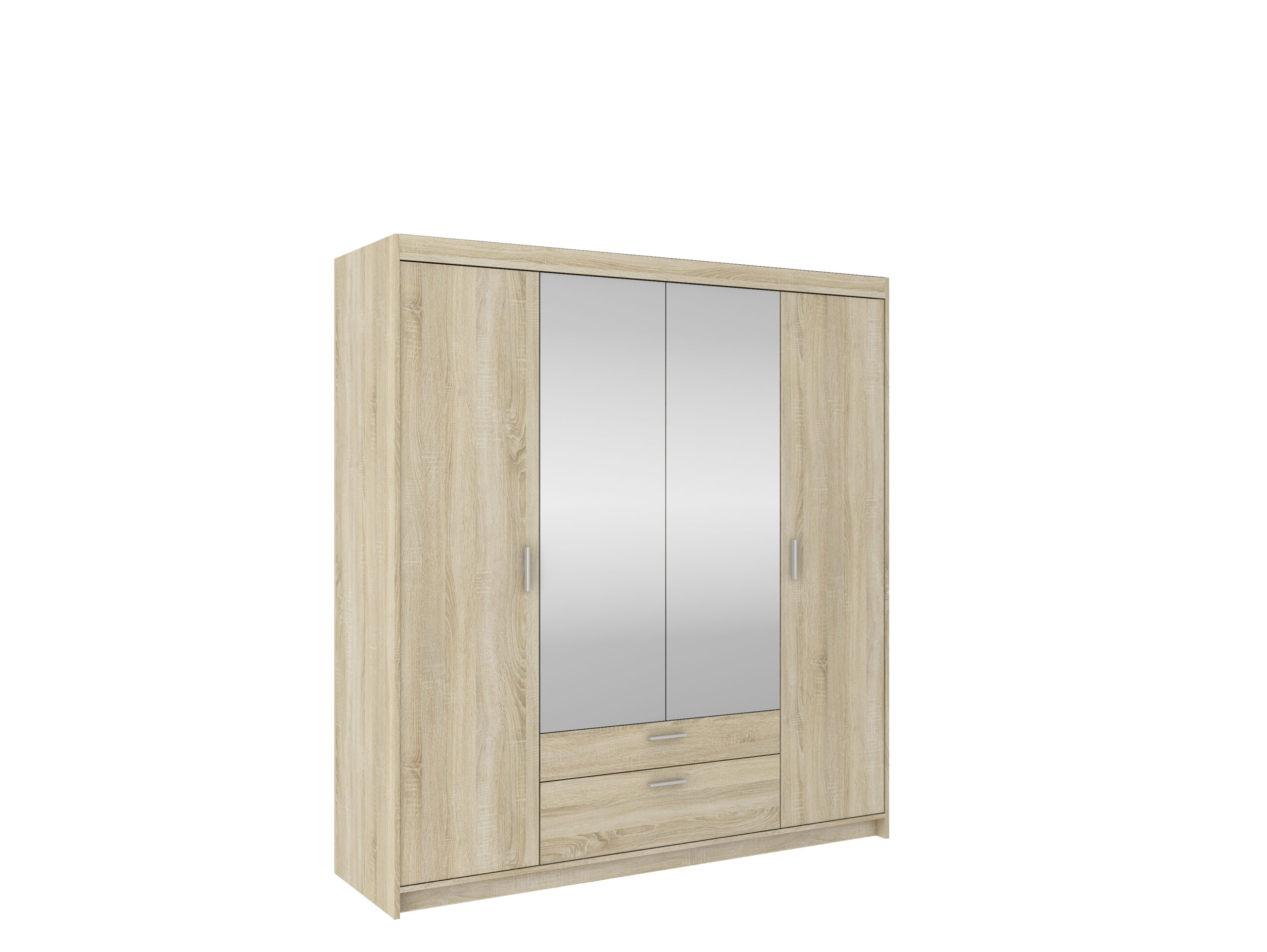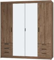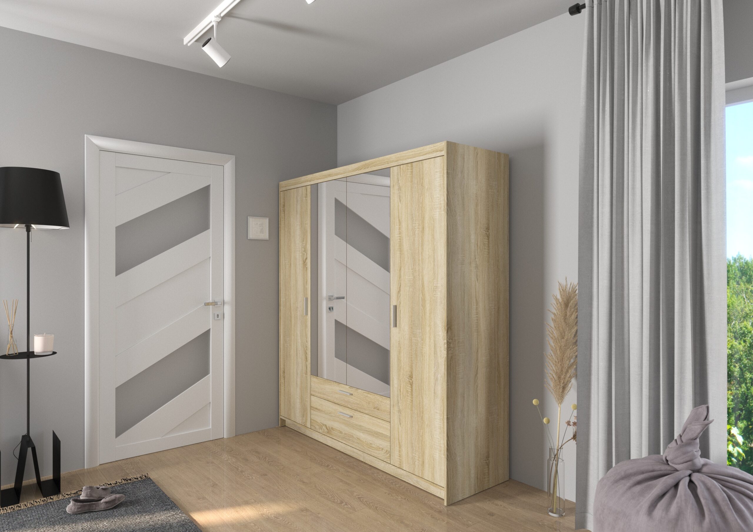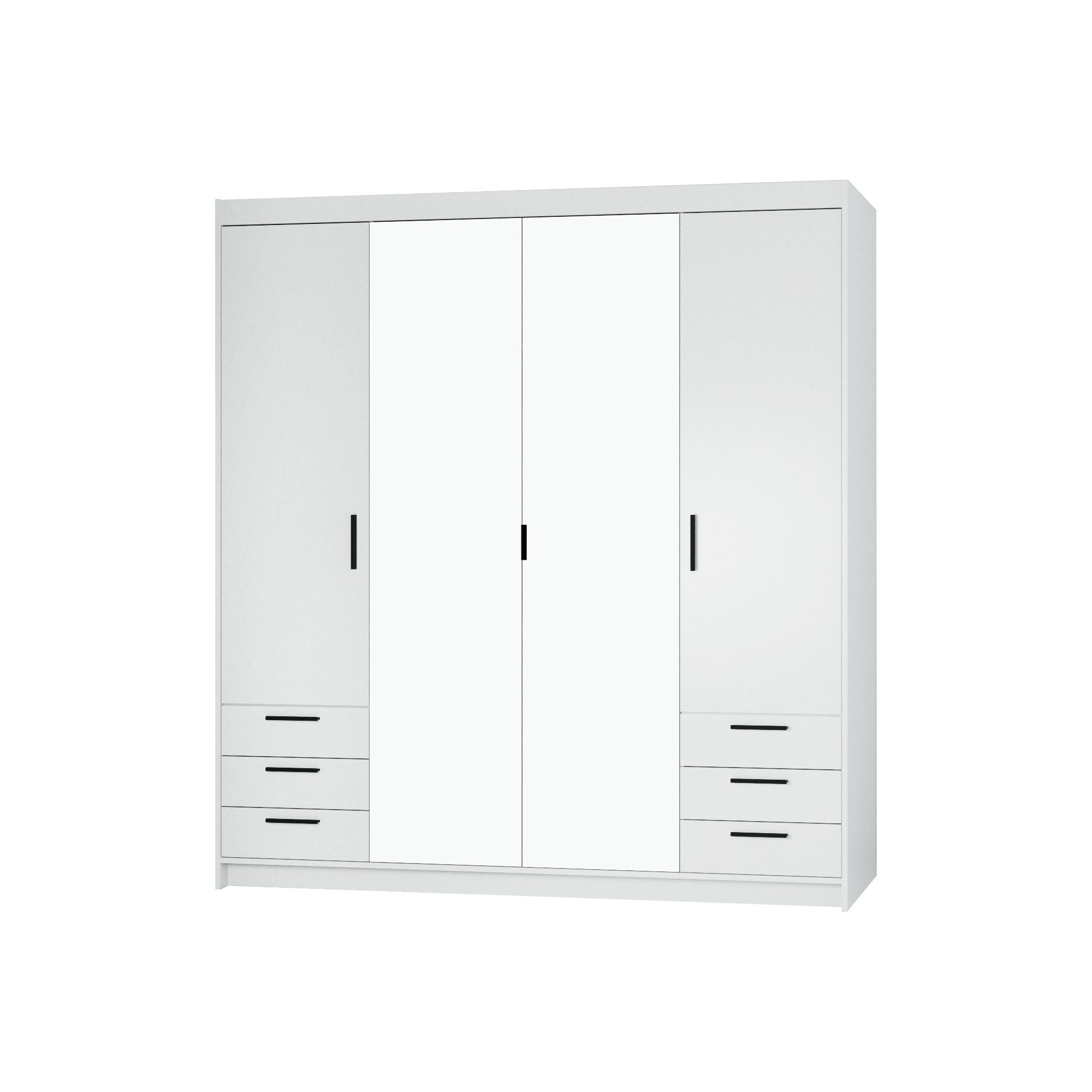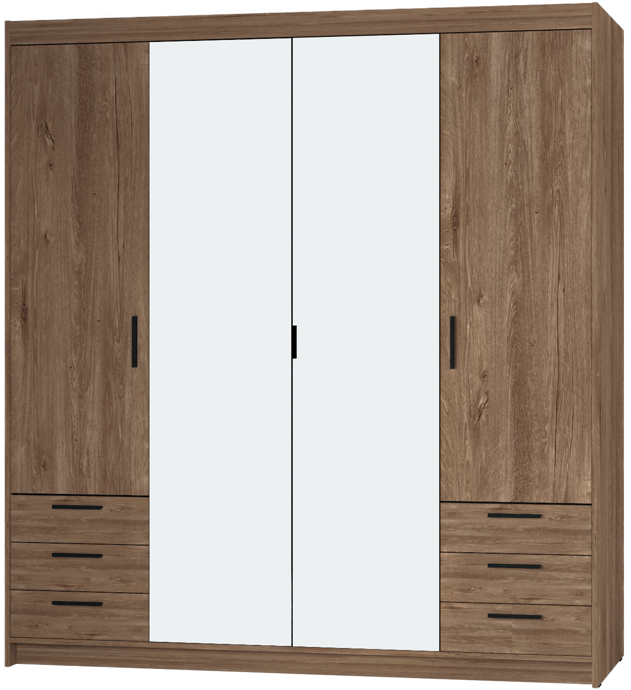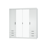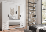 Szukasz szafy, która mieści naprawdę dużo i jednocześnie porządkuje ubrania „od razu po otwarciu”? ELENA 4D 6S – LUSTRO łączy cztery pełnowymiarowe fronty z aż sześcioma szufladami oraz lustrami na środkowych drzwiach. Dzięki temu masz szybki podgląd stylizacji, a wszystko – od długich płaszczy po drobiazgi – ma swoje miejsce.