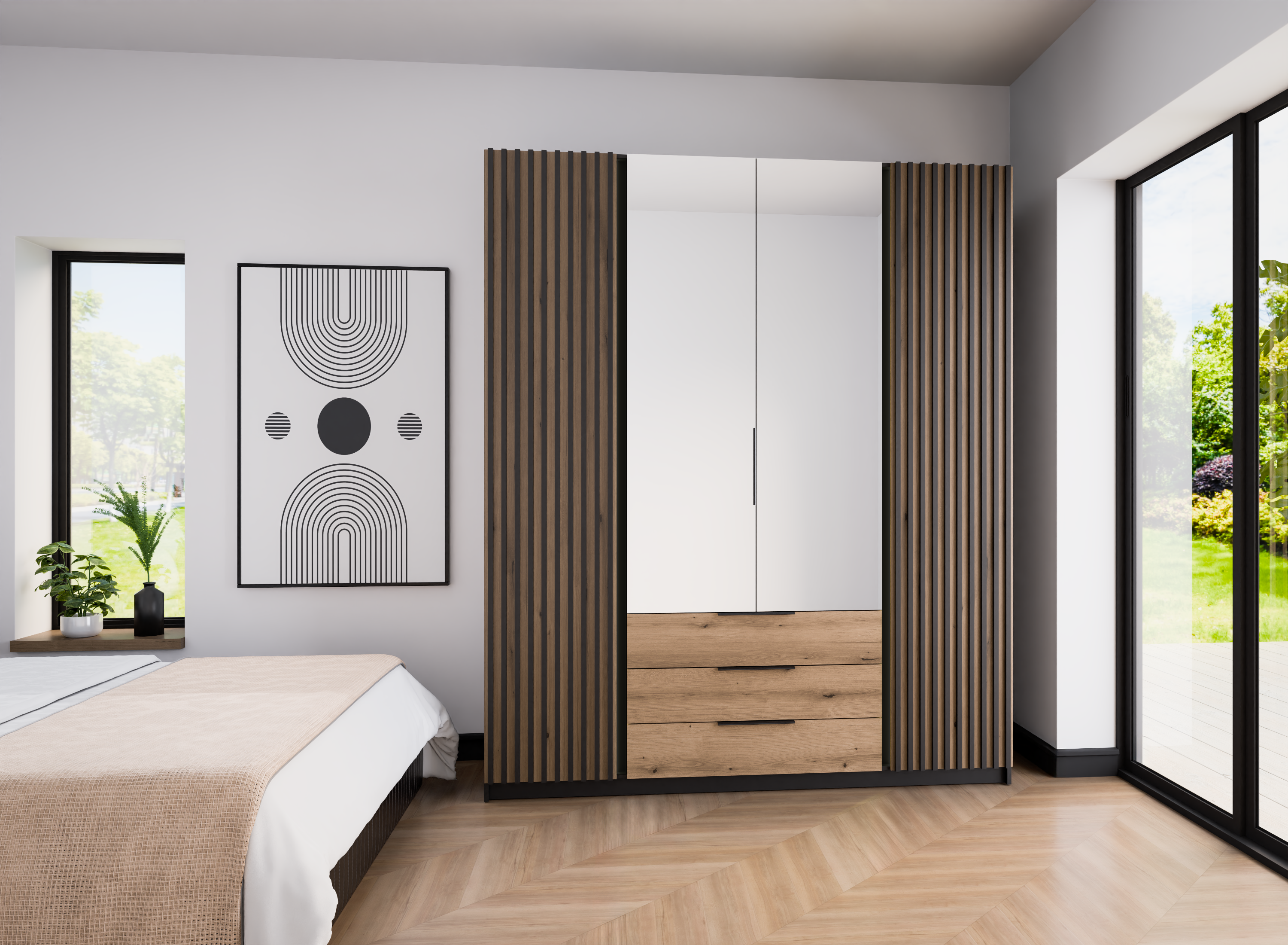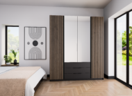 Dla osób, które szukają pojemnej szafy z lustrami i chcą wnieść do wnętrza efektowny, lamelowy akcent, nie rezygnując z wygody trzech szuflad i przemyślanego układu wnętrza.
