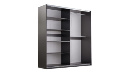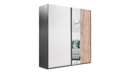 Kaja 2L3S z lamelami to najbardziej dekoracyjny wariant serii Kaja: na frontach otrzymujesz dwie tafle luster oraz pionowe lamele, a w dolnej części – trzy praktyczne szuflady. Szafa łączy nowoczesny design z funkcjonalnym układem wnętrza i dużą pojemnością.