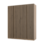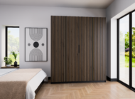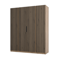Nowoczesna, pojemna szafa z kolekcji Kaja. Front zdobią cztery pionowe pasy lameli, które nadają bryle elegancki, trójwymiarowy efekt i świetnie wpisują się w styl nowoczesny, loft oraz japandi. Model bez luster.