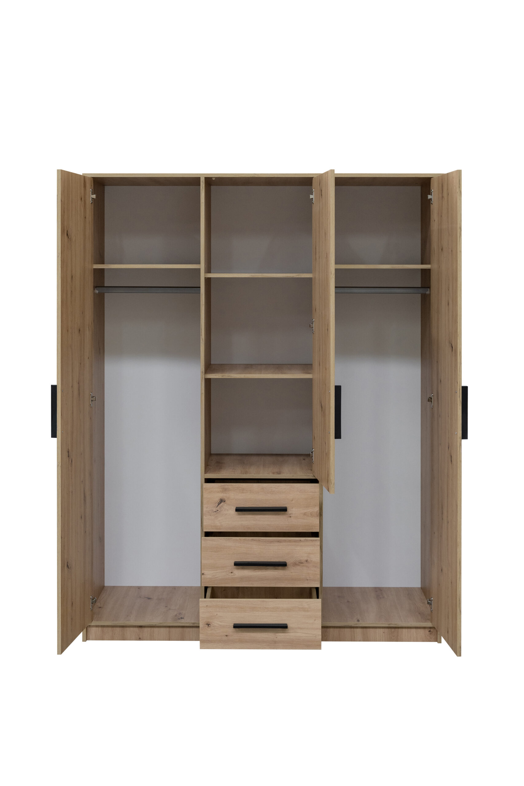 Szafa KOS D3 to idealna propozycja dla osób, które potrzebują dużej, dobrze zorganizowanej przestrzeni do przechowywania, a jednocześnie cenią nowoczesny, industrialny styl. Dekor dąb Artisan nadaje meblowi naturalny i elegancki charakter, a czarne uchwyty podkreślają jego nowoczesną formę. To doskonały wybór do sypialni, garderoby lub przestronnej strefy dziennej.