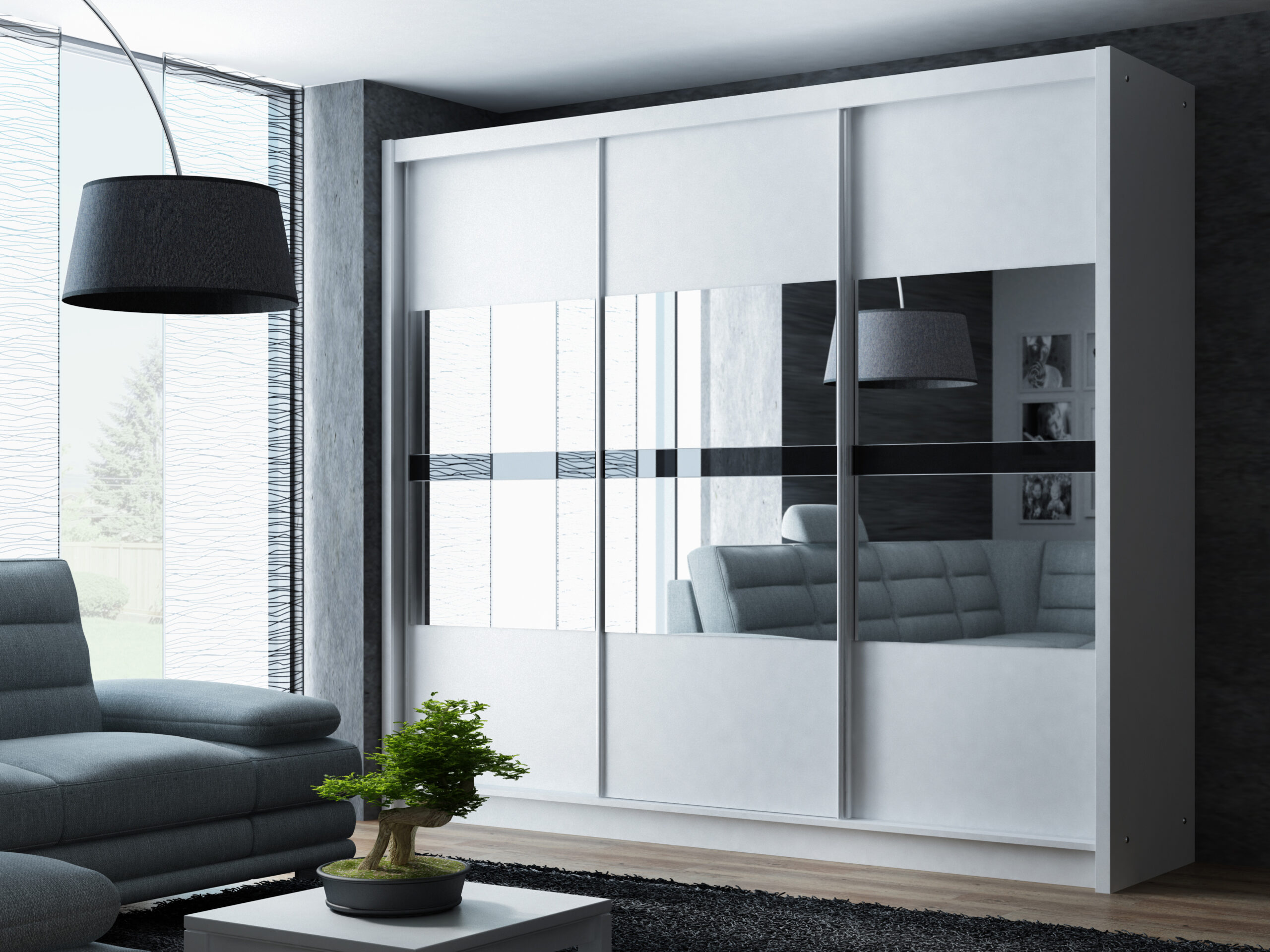 Szukasz pojemnej, efektownej i wygodnej w codziennym użytkowaniu szafy do sypialni lub salonu? BATUMI 250 łączy wielką pojemność z dynamicznym designem: trzy przesuwne fronty z dużymi lustrami i dekoracyjnym pasem czarnego szkła optycznie powiększają wnętrze i nadają mu elegancji. Aluminiowe prowadnice z łożyskowanymi wózkami gwarantują lekki, płynny przesuw.