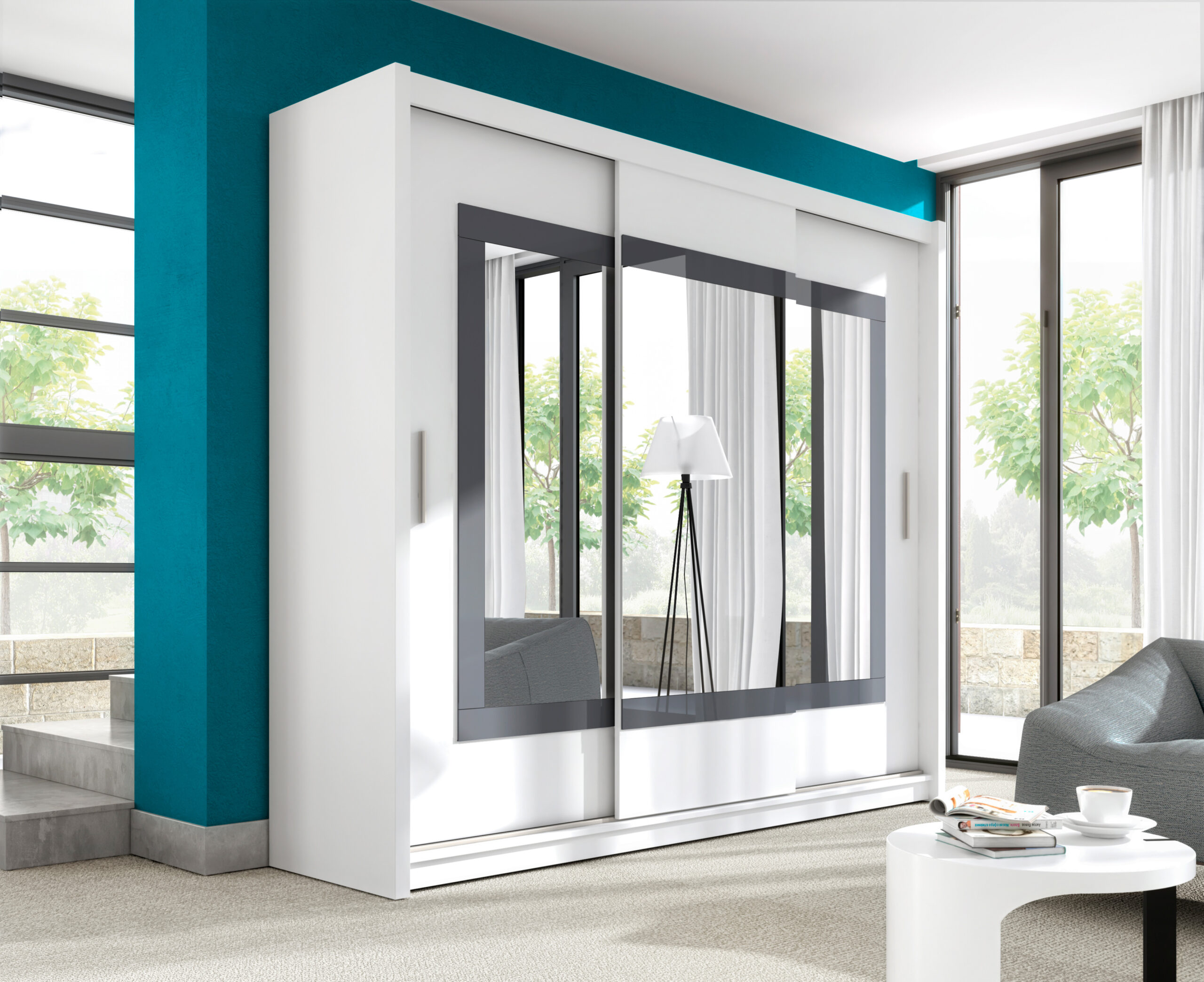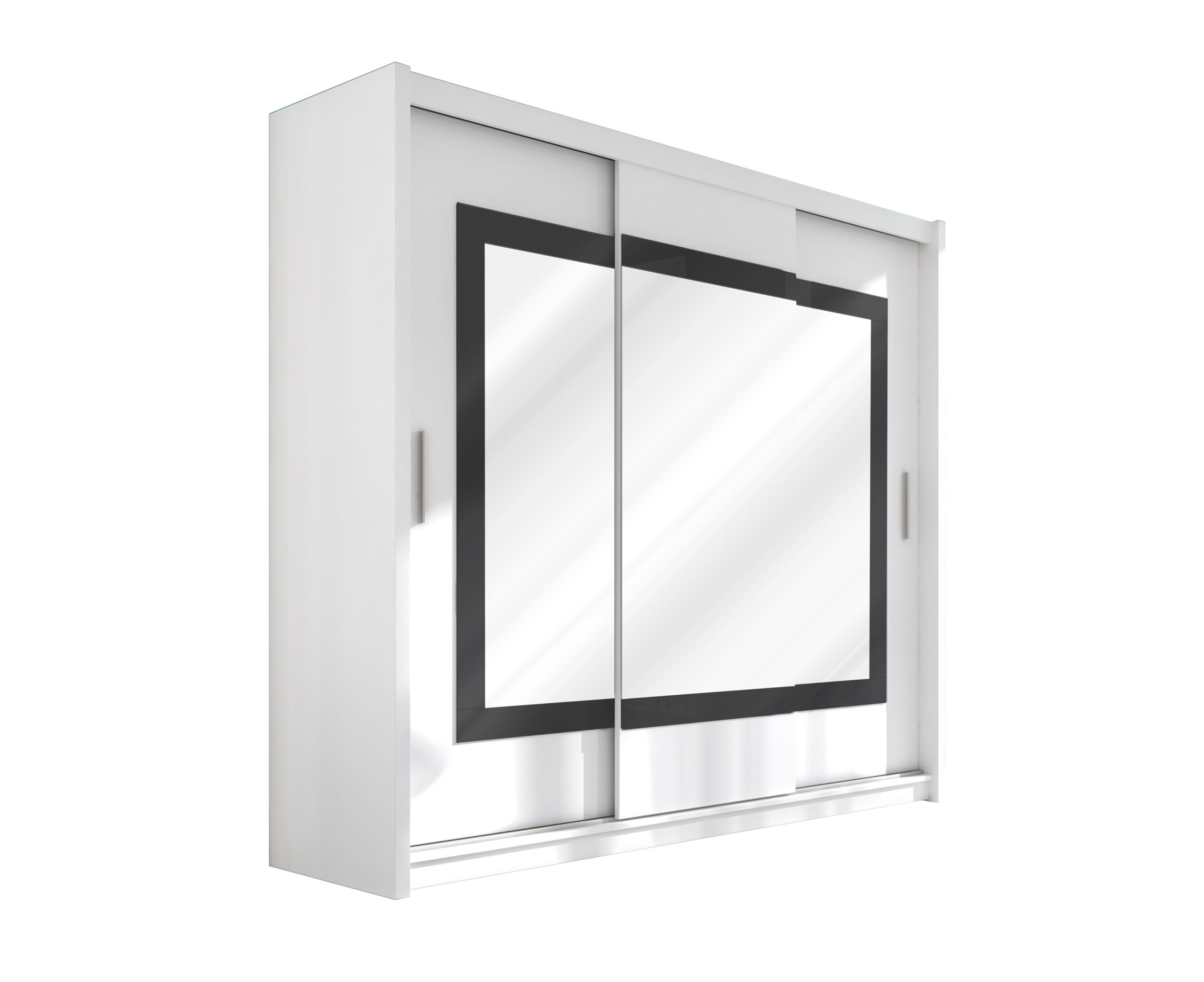Połączenie białego korpusu, lustrzanych frontów oraz dekoracyjnej, ciemnej ramki tworzy wyjątkowo elegancki i dynamiczny efekt. Lustra nie tylko dodają lekkości bryle, ale także odbijają światło, dzięki czemu pomieszczenie wydaje się większe i jaśniejsze.